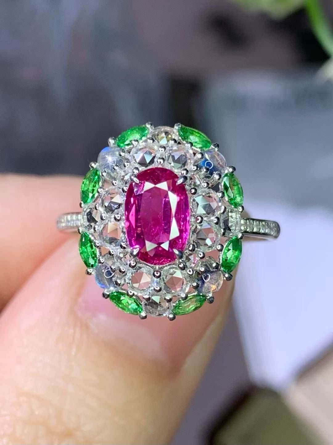 Ref:231019074 // Gold Content:14K Gold // Ring Size:7.25US // // Main Gemstone:Ruby // Shape:Oval // Carat Weight:1ct // Color:Red // Treatment:Natural // // Adjacent Gemstone 2 : Sapphire // Shape:Round // Color:White // Treatment:Natural // Cut Grade:G // // Adjacent Gemstone 3 : Tsavorite // Shape:Marquise // Color:Green // Treatment:Natural // // Adjacent Gemstone 4 : Diamond // Shape:Round // Clarity Grade:VS-SI // Color:H // Treatment:Natural // Cut Grade:G //