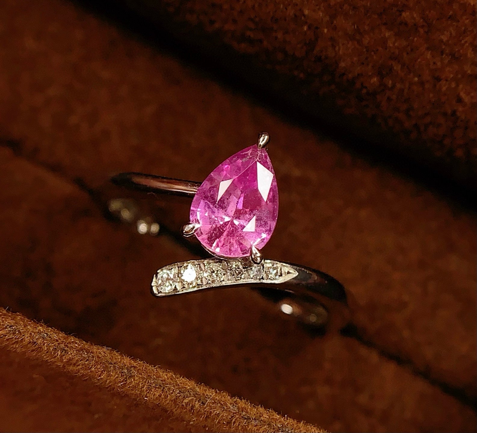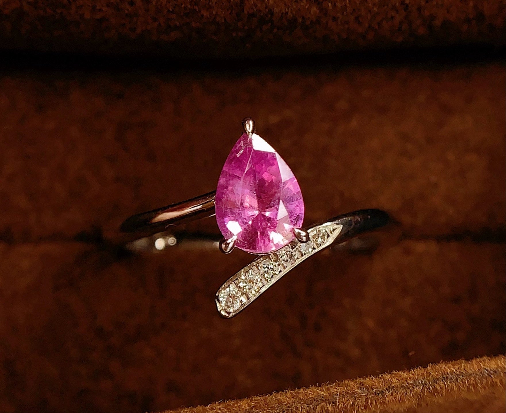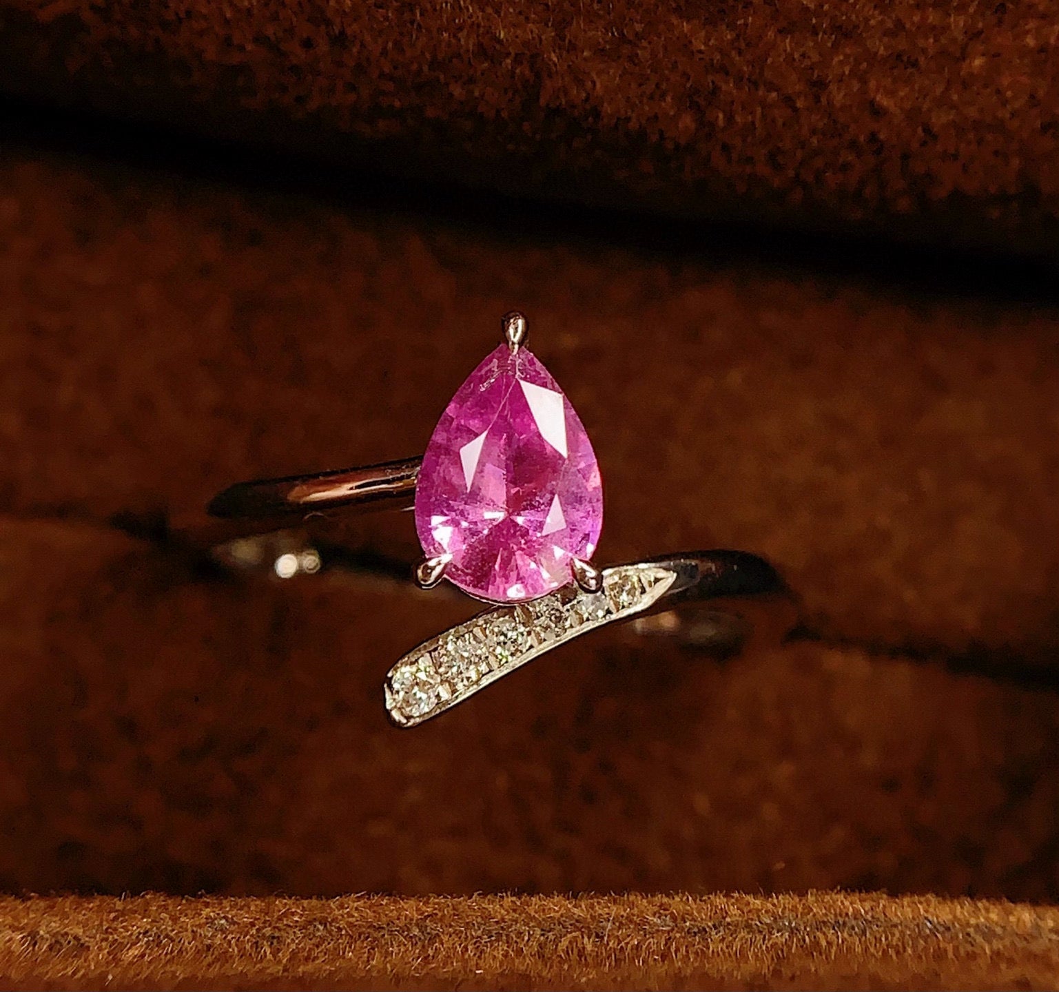 Ref:231025014 // Gold Content:14K Gold // Ring Size:7.25US // // Main Gemstone:Sapphire // Shape:Pear // Carat Weight:1ct // Color:Pink // Treatment:Natural // // Adjacent Gemstone 2 : Diamond // Number of stones:6 // Shape:Round // Clarity Grade:VS-SI // Color:H // Treatment:Natural // Cut Grade:G //