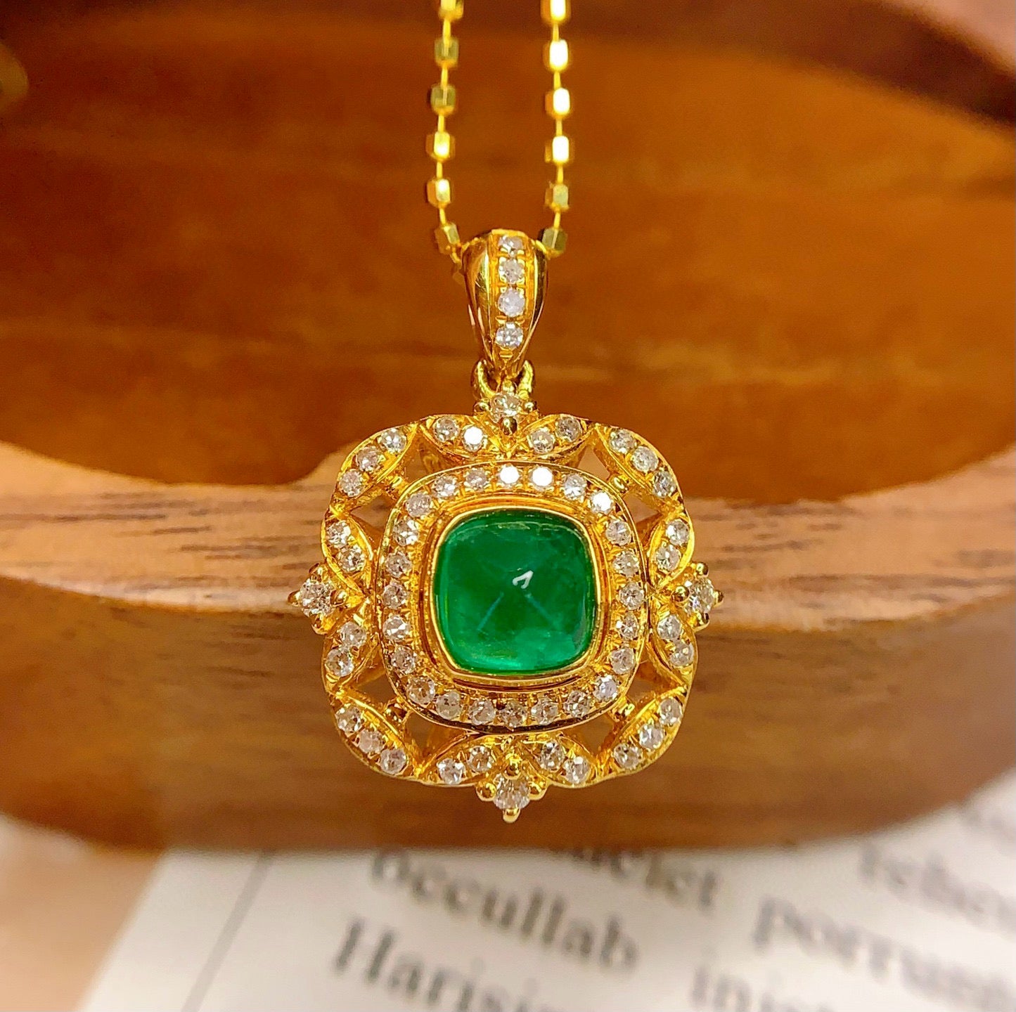 Ref:231025105 // Gold Content:14K Gold // Main Gemstone:Emerald // Shape:Suger-Loaf // Carat Weight:1ct // Color:Vivid Green // Treatment:Natural // // Adjacent Gemstone 2 : Diamond // Number of stones:60 // Shape:Round // Clarity Grade:VS-SI // Color:H // Treatment:Natural // Cut Grade:G //