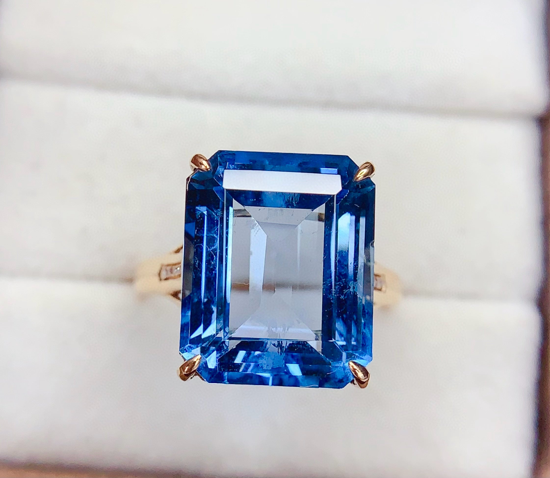 Ref:231025182 // Gold Content:14K Gold // Ring Size:7.25US // // Main Gemstone:Topaz // Shape:Octagonal // Carat Weight:10.9ct // Color:Blue // Treatment:Natural // // Adjacent Gemstone 2 : Diamond // Number of stones:10 // Shape:Round // Clarity Grade:VS-SI // Color:H // Treatment:Natural // Cut Grade:G //