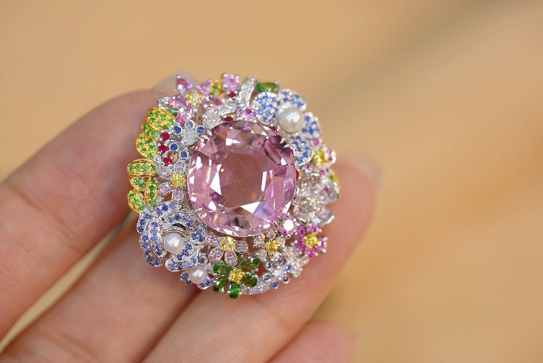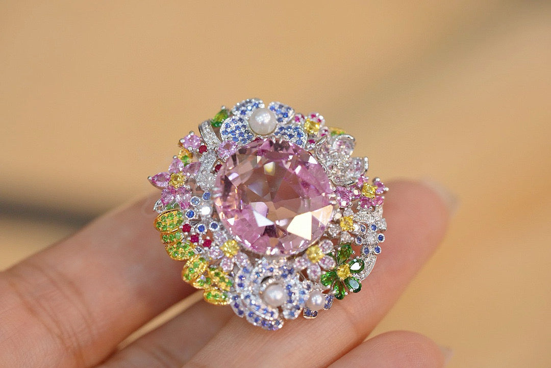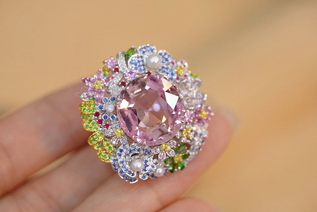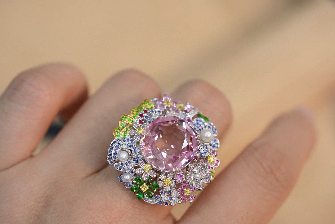 Ref:231027089 // Gold Content:14K Gold // Ring Size:7.25US // // Main Gemstone:Tourmaline // Shape:Oval // Carat Weight:12.5ct // Color:Pink // Treatment:Natural // // Adjacent Gemstone 2 : Diamond // Shape:Round // Clarity Grade:VS-SI // Color:H // Treatment:Natural // Cut Grade:G // // Adjacent Gemstone 3 : Sapphire // Shape:Multiply // Color:Color // Treatment:Natural // // Adjacent Gemstone 4 : Tsavorite // Shape:Multiply // Color:Green // Treatment:Natural //