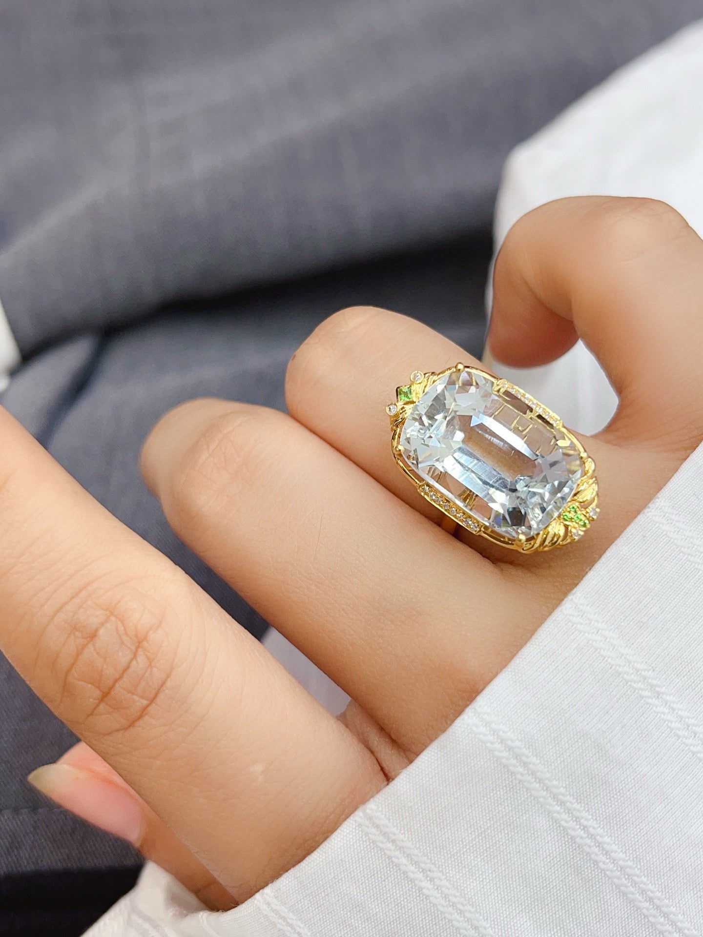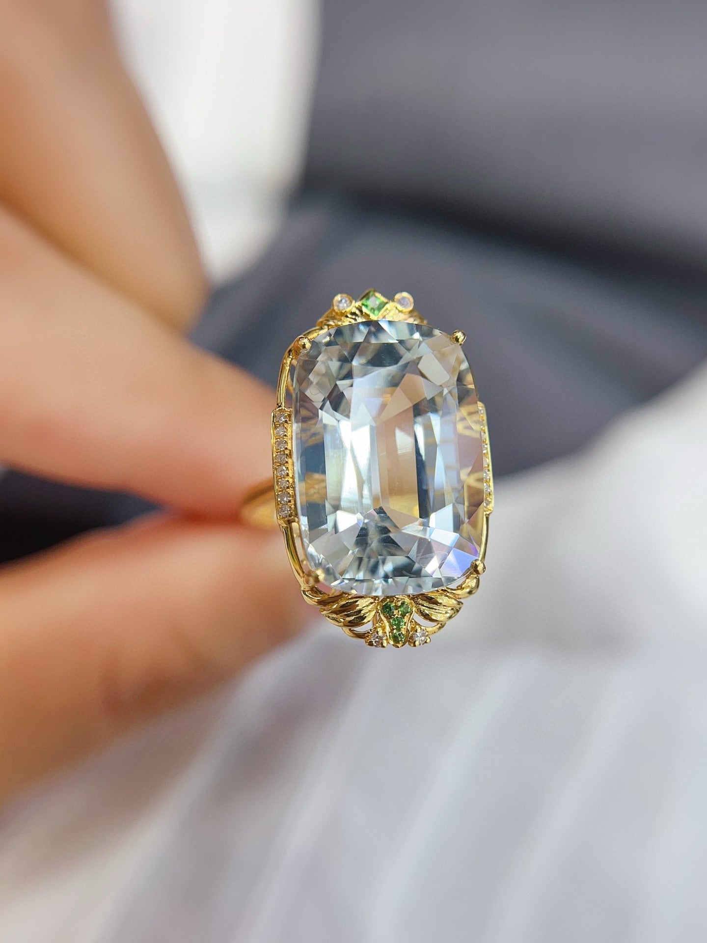 Ref:231027190 // Gold Content:14K Gold // Ring Size:7.25US // // Main Gemstone:Aquamarine // Shape:Cushion // Carat Weight:14.45ct // Color:Blue // Treatment:Natural // // Adjacent Gemstone 2 : Diamond // Number of stones:16 // Shape:Round // Clarity Grade:VS-SI // Color:H // Treatment:Natural // Cut Grade:G // // Adjacent Gemstone 3 : Tsavorite // Number of stones:5 // Shape:Multiply // Color:Green // Treatment:Natural //
