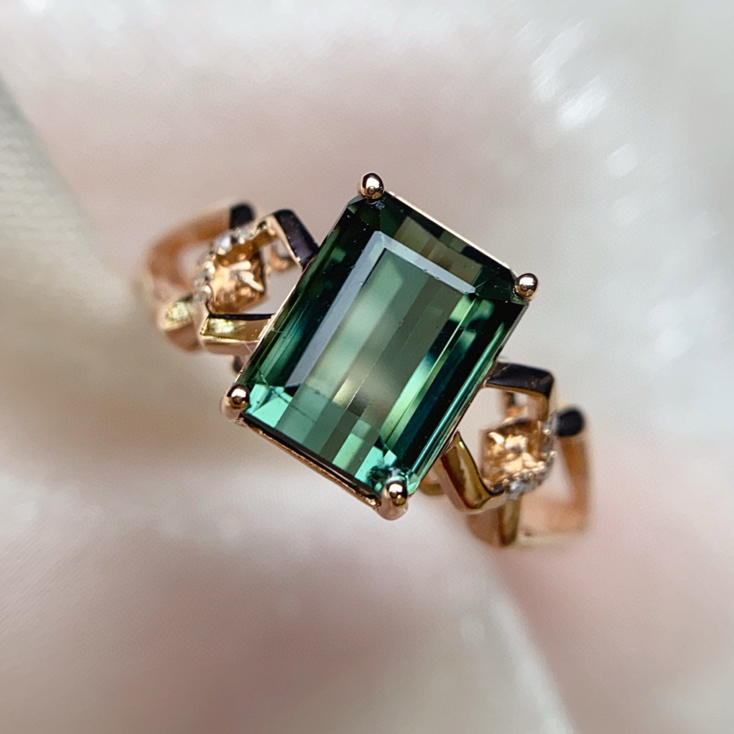 Ref:231021108 // Gold Content:14K Gold // Ring Size:7.25US // // Main Gemstone:Tourmaline // Shape:Octagonal // Carat Weight:2.05ct // Color:Green // Treatment:Natural // // Adjacent Gemstone 2 : Diamond // Number of stones:10 // Shape:Round // Clarity Grade:VS-SI // Color:H // Treatment:Natural // Cut Grade:G //