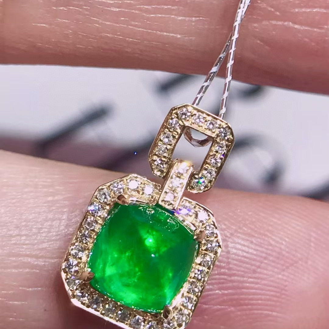 Ref:231023209 // Gold Content:14K Gold // Main Gemstone:Emerald // Shape:Suger-Loaf // Carat Weight:1.85ct // Color:Green // Treatment:Natural // // Adjacent Gemstone 2 : Diamond // Shape:Round // Carat Weight:0.2ct // Clarity Grade:VS-SI // Color:H // Treatment:Natural // Cut Grade:G //