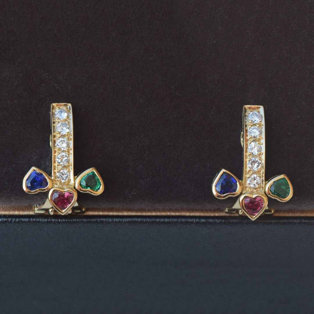 Ref:231023235 // Gold Content:14K Gold // Main Gemstone 1:Ruby // Shape:Heart // Carat Weight:1.12ct // Color:Red // Treatment:Natural // // Main Gemstone 2 : Sapphire // Shape:Heart // Carat Weight:0.96ct // Color:Blue // Treatment:Natural // // Main Gemstone 3 : Emerald // Shape:Heart // Carat Weight:1ct // Color:Green // Treatment:Natural // // Adjacent Gemstone 4 : Diamond // Shape:Round // Carat Weight:0.64ct // Clarity Grade:VS-SI // Color:H // Treatment:Natural // Cut Grade:G //