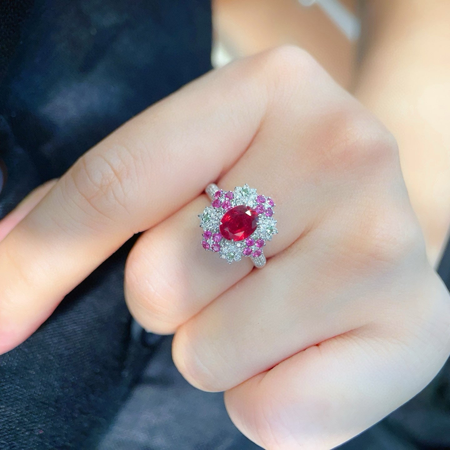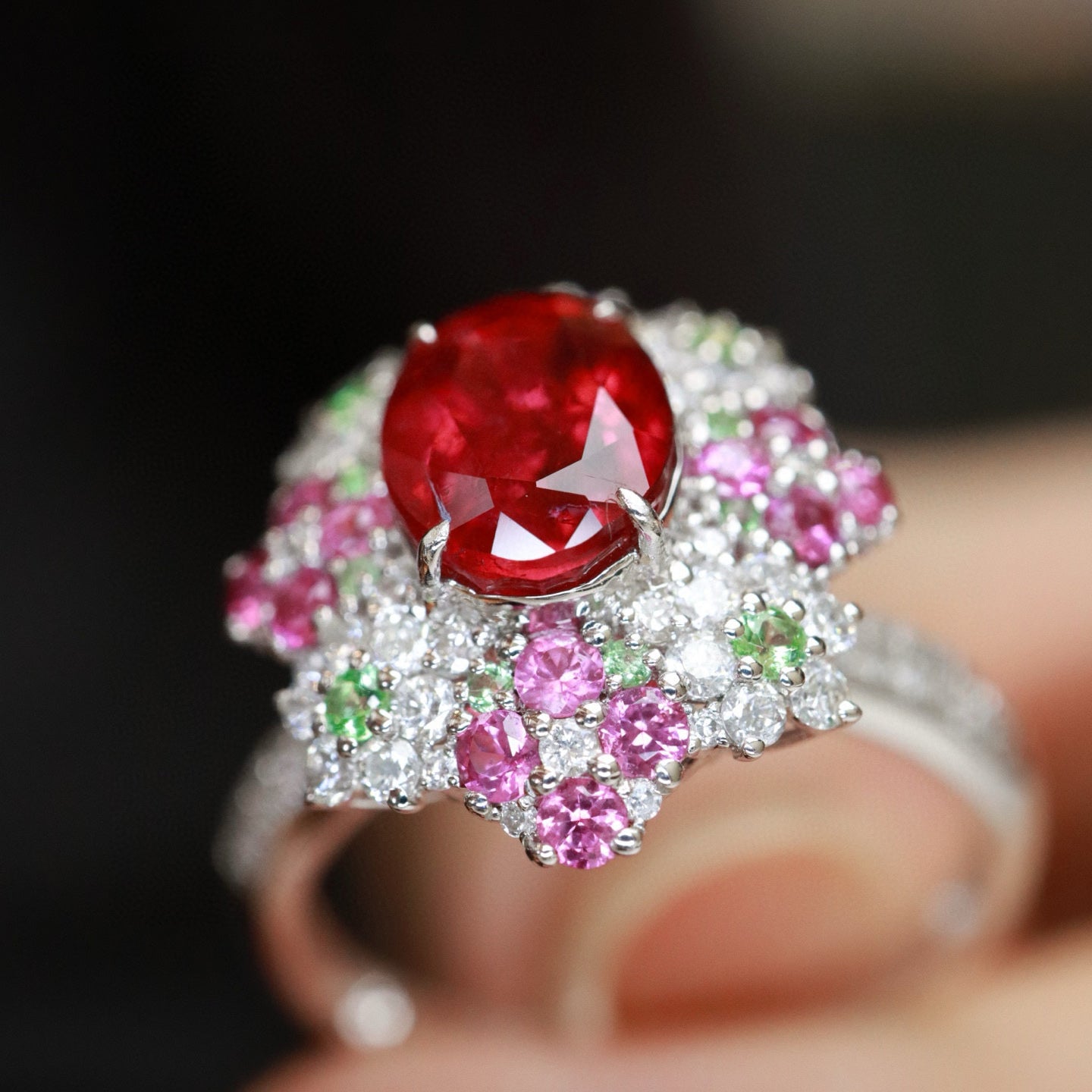 Ref:231019146 // Gold Content:14K Gold // Ring Size:7.25US // // Main Gemstone:Tourmaline // Shape:Oval // Carat Weight:1.7ct // Color:Rubellite // Treatment:Natural // // Adjacent Gemstone 2 : Diamond // Shape:Round // Carat Weight:0.45ct // Clarity Grade:VS-SI // Color:H // Treatment:Natural // Cut Grade:G // // Adjacent Gemstone 3 : Coloured Gemstone // Shape:Round // Carat Weight:0.35ct // Color:Color // Treatment:Natural // Cut Grade:G //