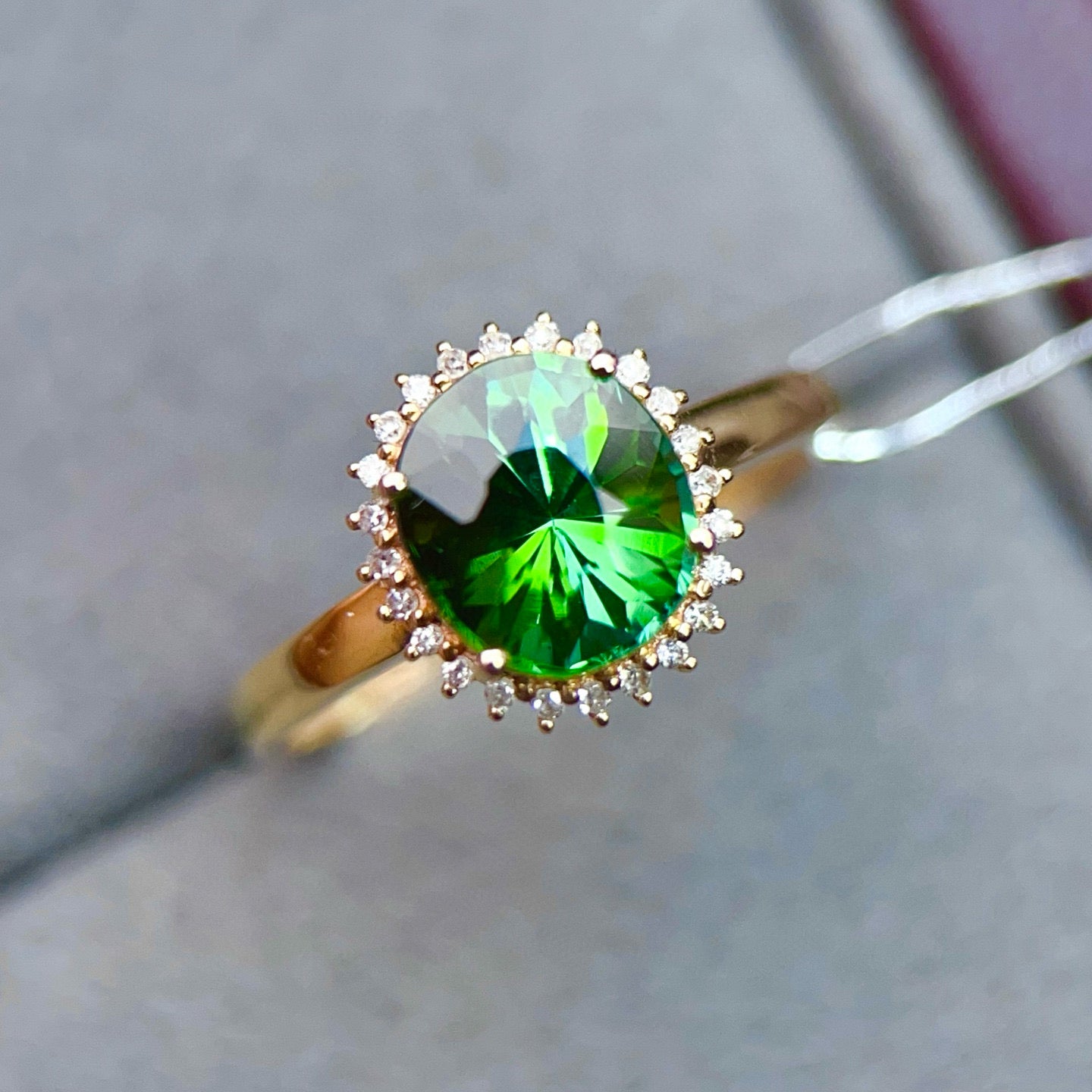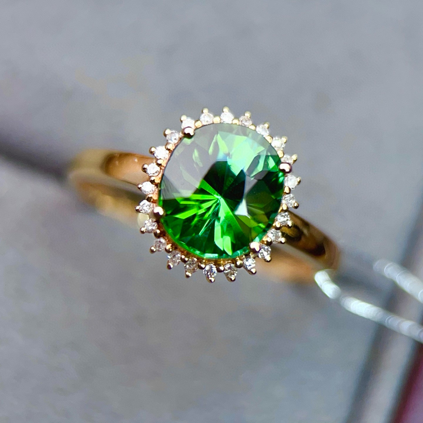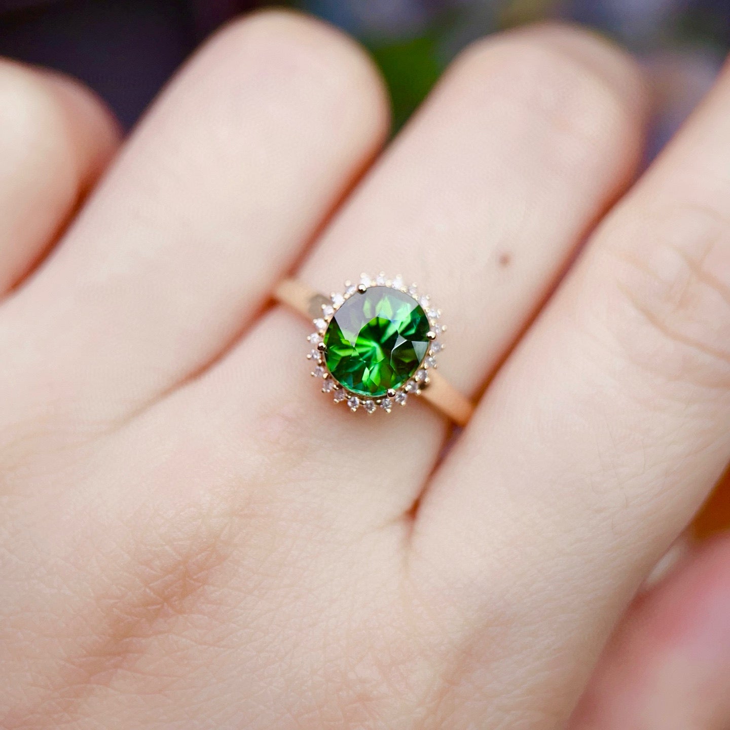 Ref:231019084 // Gold Content:14K Gold // Ring Size:7.25US // // Main Gemstone:Tourmaline // Shape:Oval // Carat Weight:2.05ct // Color:Green // Treatment:Natural // // Adjacent Gemstone 2 : Diamond // Number of stones:24 // Shape:Round // Carat Weight:0.12ct // Clarity Grade:VS-SI // Color:H // Treatment:Natural // Cut Grade:G //