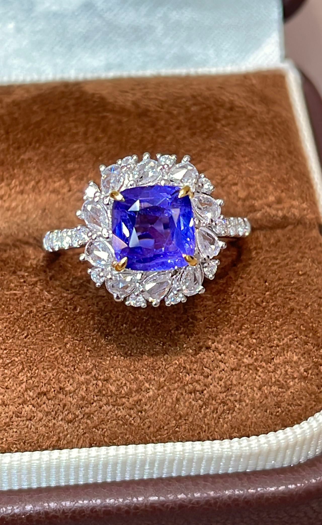 Ref:231027229 // Gold Content:14K Gold // Ring Size:7.25US // // Main Gemstone:Sapphire // Shape:Cushion // Carat Weight:2.2ct // Color:Blue // Treatment:Natural // // Adjacent Gemstone 2 : Diamond // Shape:Multiply // Clarity Grade:VS-SI // Color:H // Treatment:Natural //