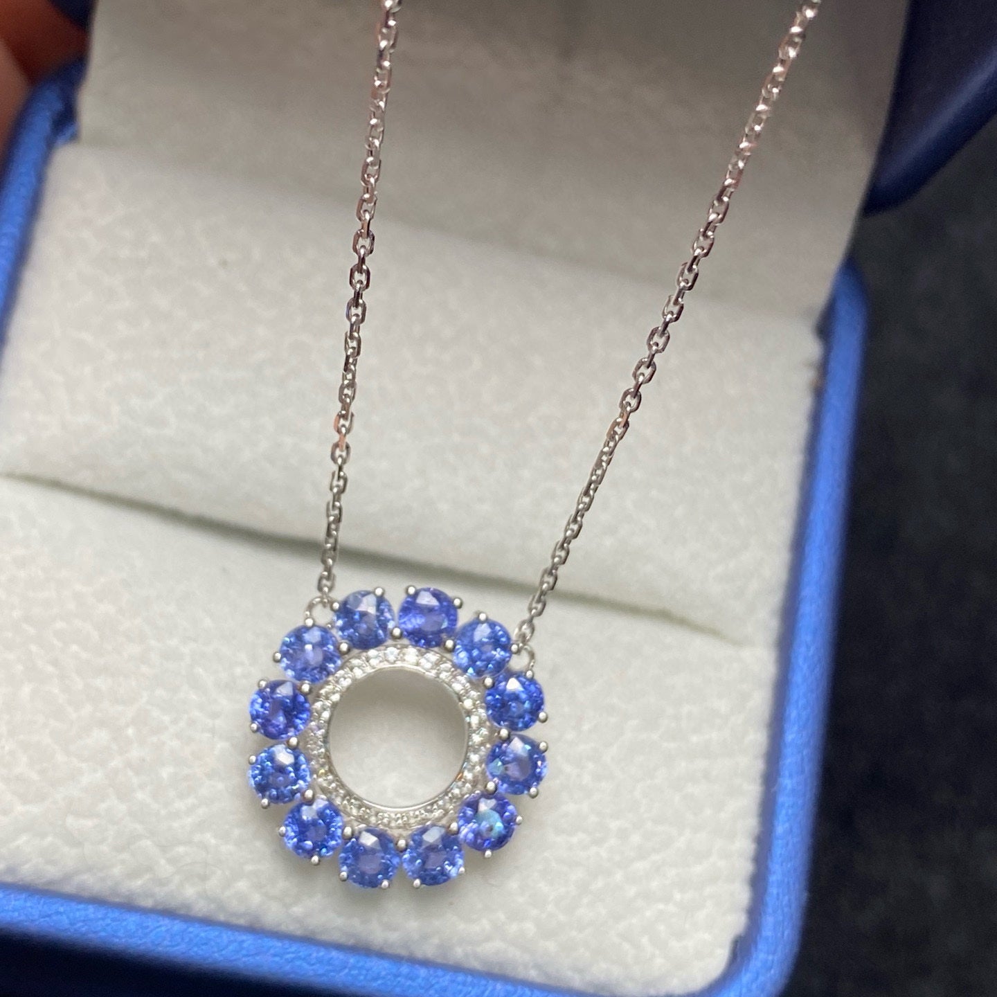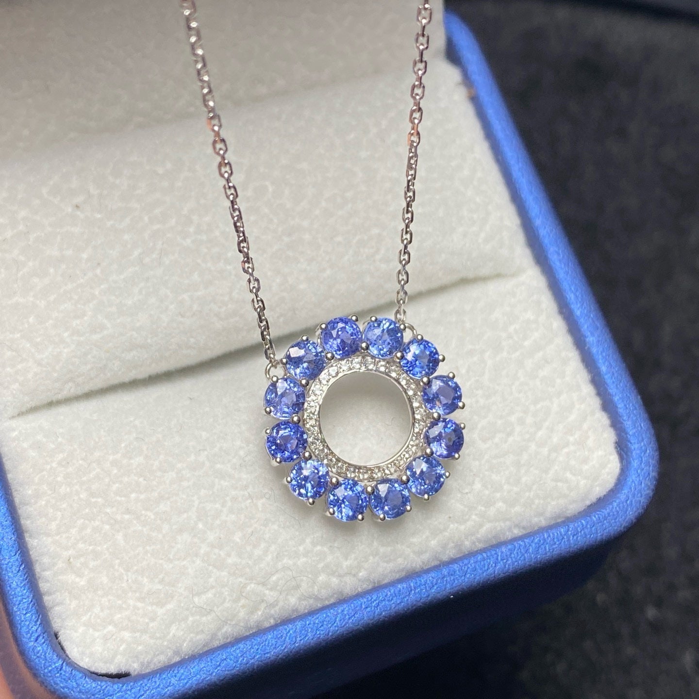 Ref:231023221 // Gold Content:14K Gold // Main Gemstone:Sapphire // Shape:Round // Carat Weight:2.37ct // Color:Blue // Treatment:Natural // Cut Grade:G // // Adjacent Gemstone 2 : Sapphire // Number of stones:27 // Shape:Round // Color:White // Treatment:Natural // Cut Grade:G //