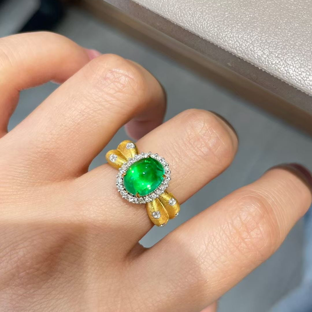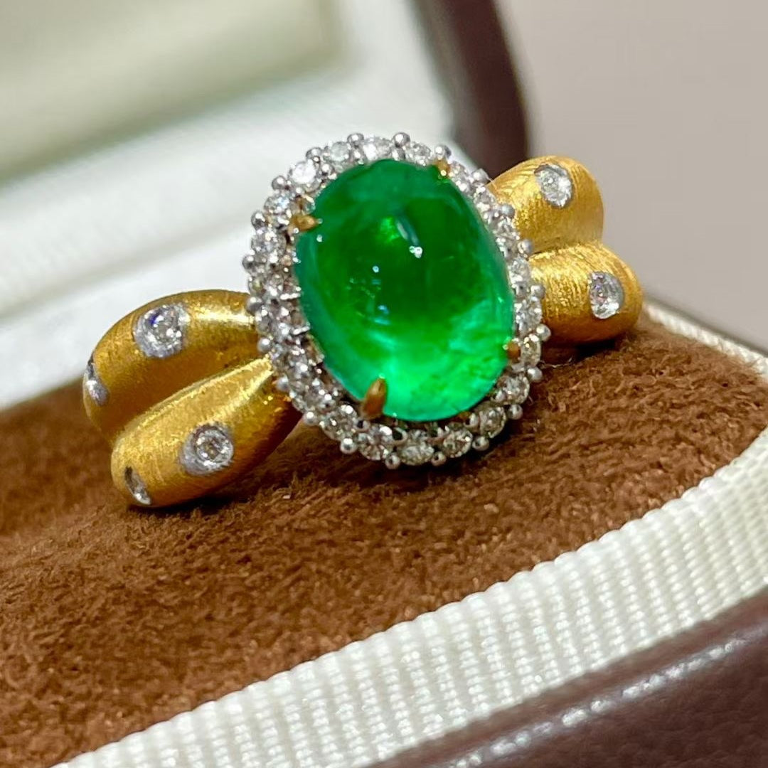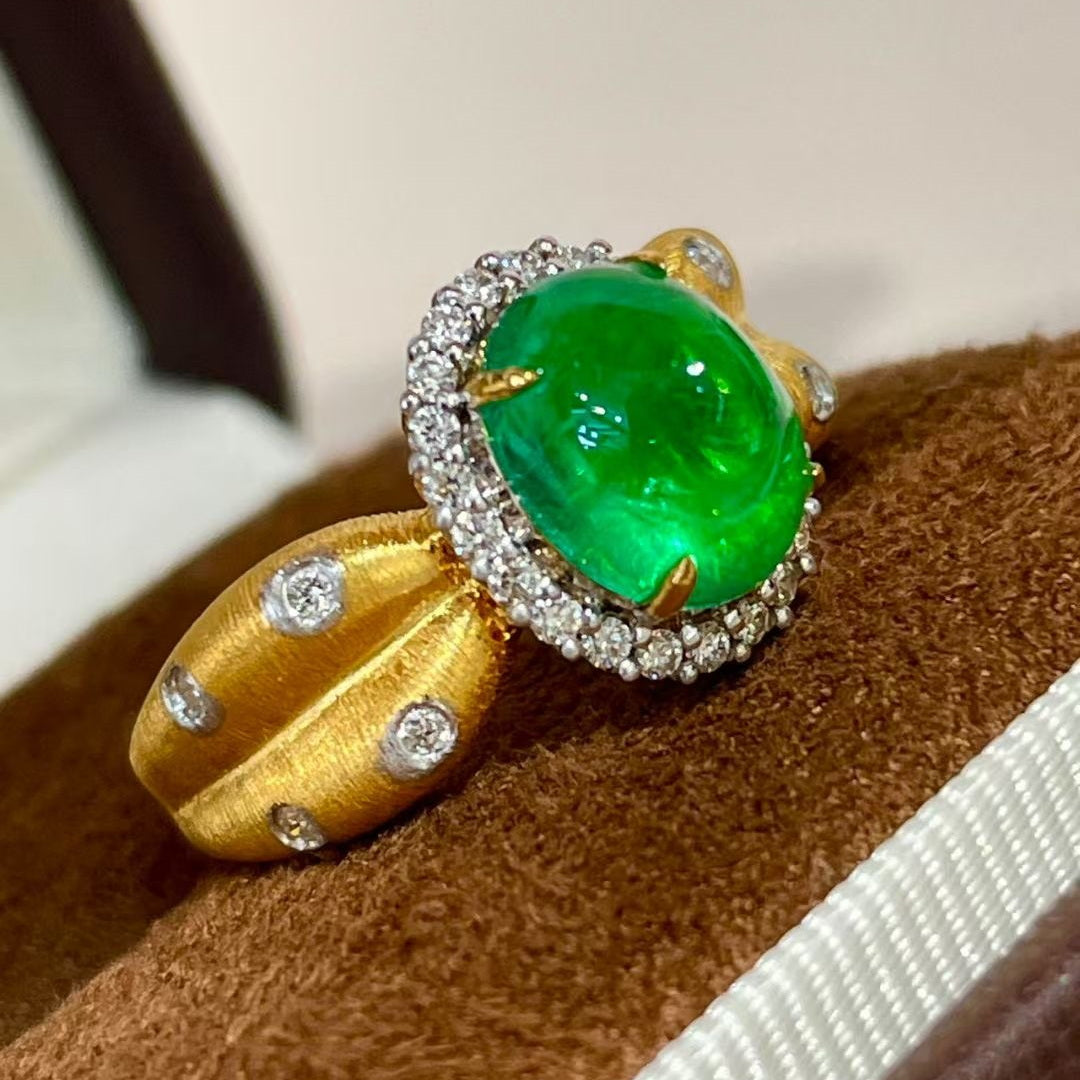 Ref:231021212 // Gold Content:14K Gold // Ring Size:7.25US // // Main Gemstone:Emerald // Shape:Oval // Carat Weight:2.5ct // Color:Vivid Green // Treatment:Natural // // Adjacent Gemstone 2 : Diamond // Shape:Round // Clarity Grade:VS-SI // Color:H // Treatment:Natural // Cut Grade:G //