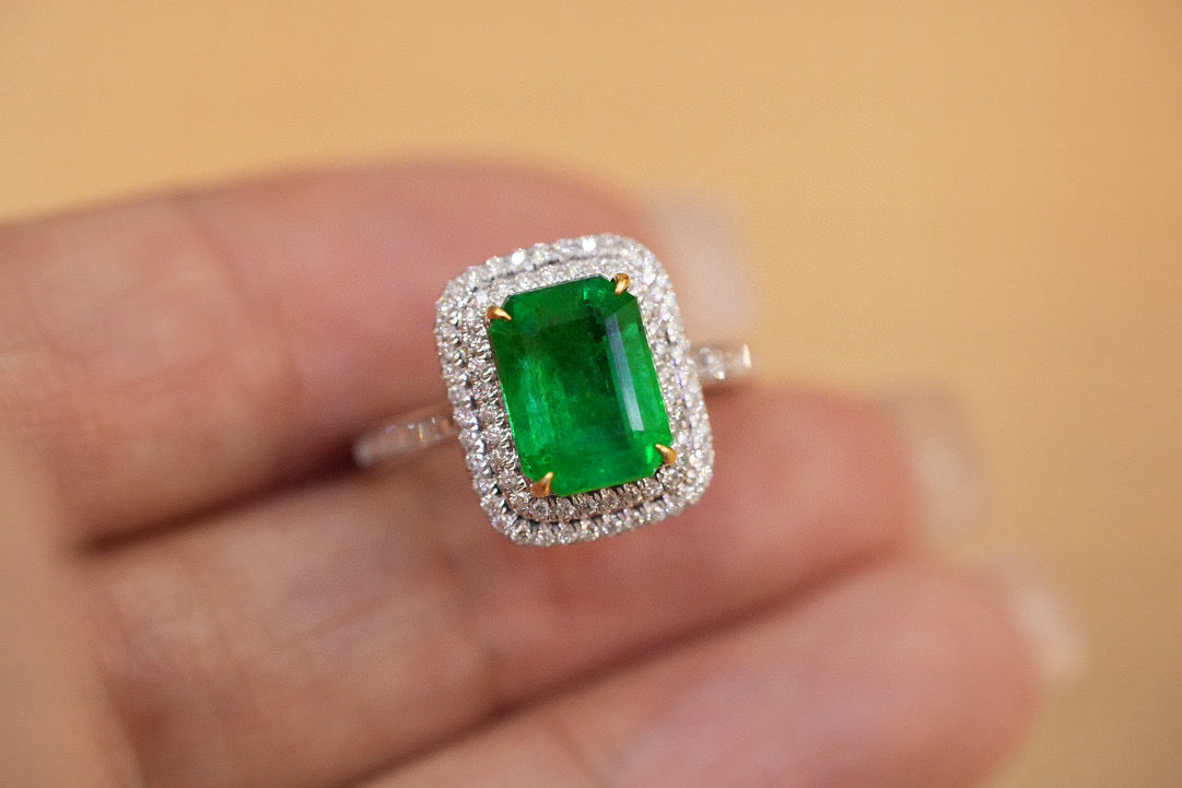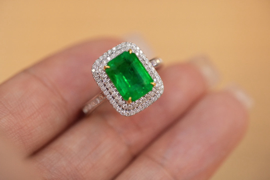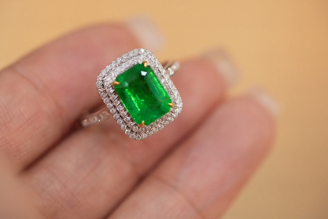 Ref:231027222 // Gold Content:14K Gold // Ring Size:7.25US // // Main Gemstone:Emerald // Shape:Octagonal // Carat Weight:2.5ct // Color:Vivid Green // Treatment:Natural // // Adjacent Gemstone 2 : Diamond // Shape:Round // Clarity Grade:VS-SI // Color:H // Treatment:Natural // Cut Grade:G //