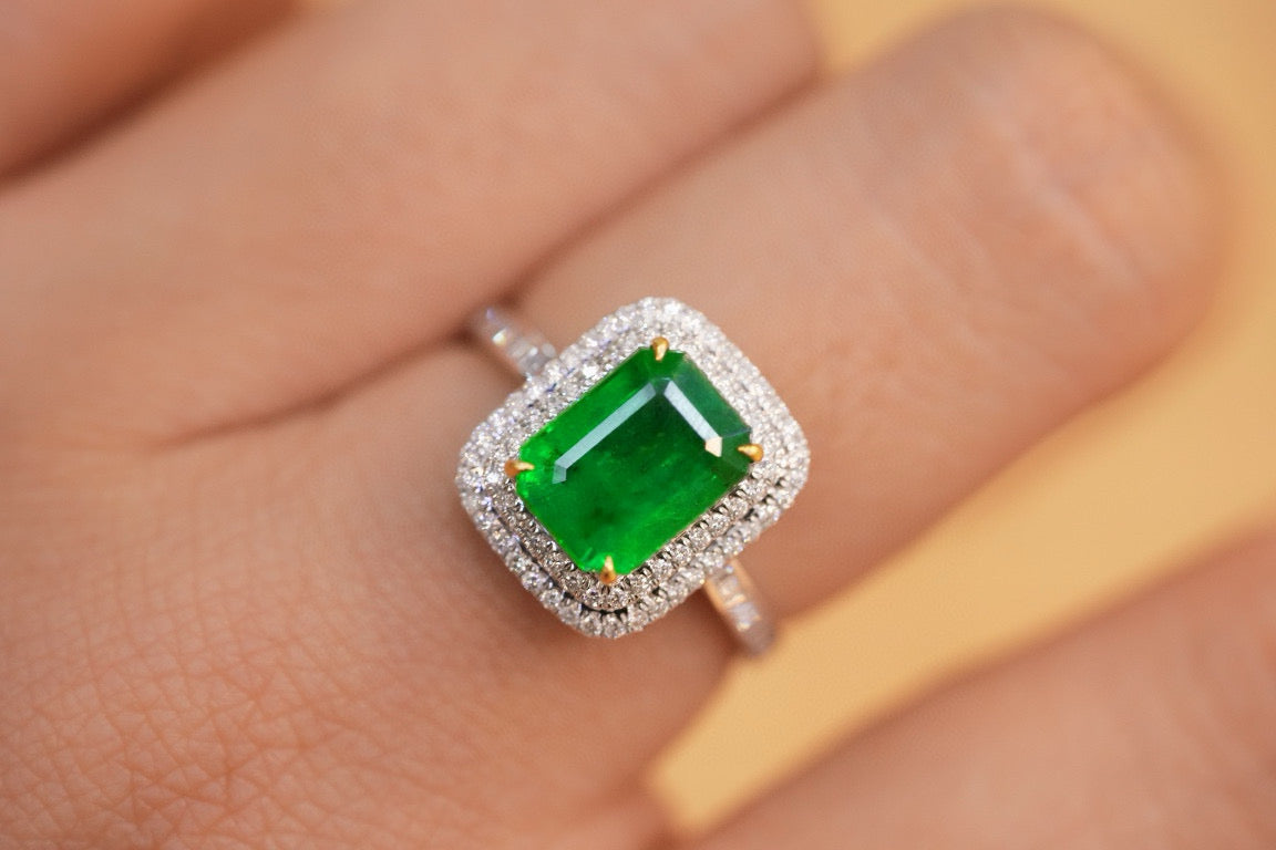 14K GOLD 2.5 CT VIVID GREEN NATURAL EMERALD & DIAMOND RING