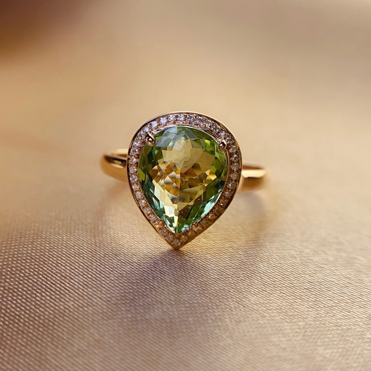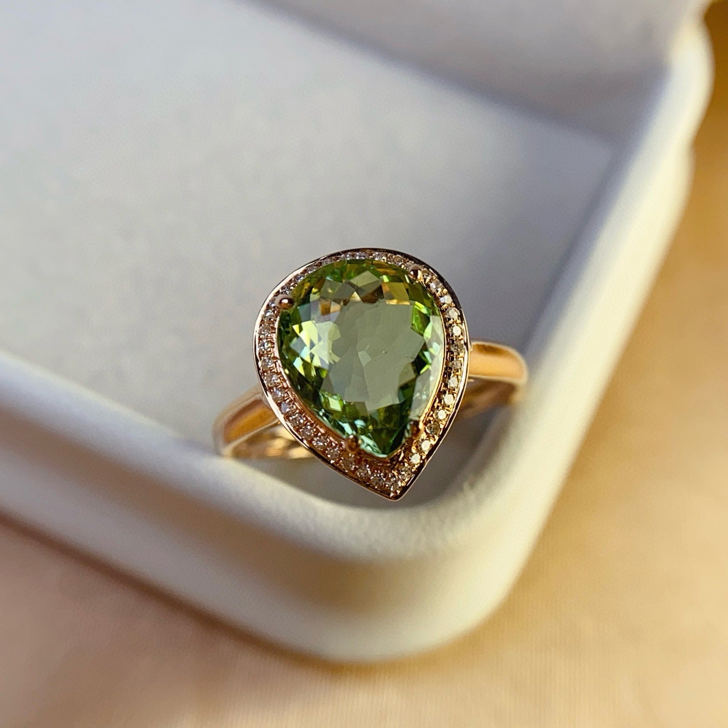 Ref:231021165 // Gold Content:14K Gold // Ring Size:7.25US // // Main Gemstone:Tourmaline // Shape:Pear // Carat Weight:2.55ct // Color:Green // Treatment:Natural // // Adjacent Gemstone 2 : Diamond // Number of stones:39 // Shape:Round // Clarity Grade:VS-SI // Color:H // Treatment:Natural // Cut Grade:G //