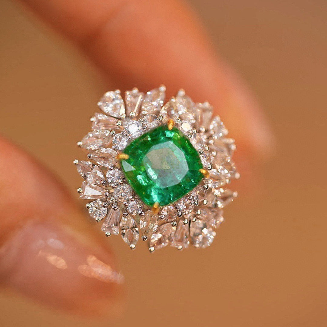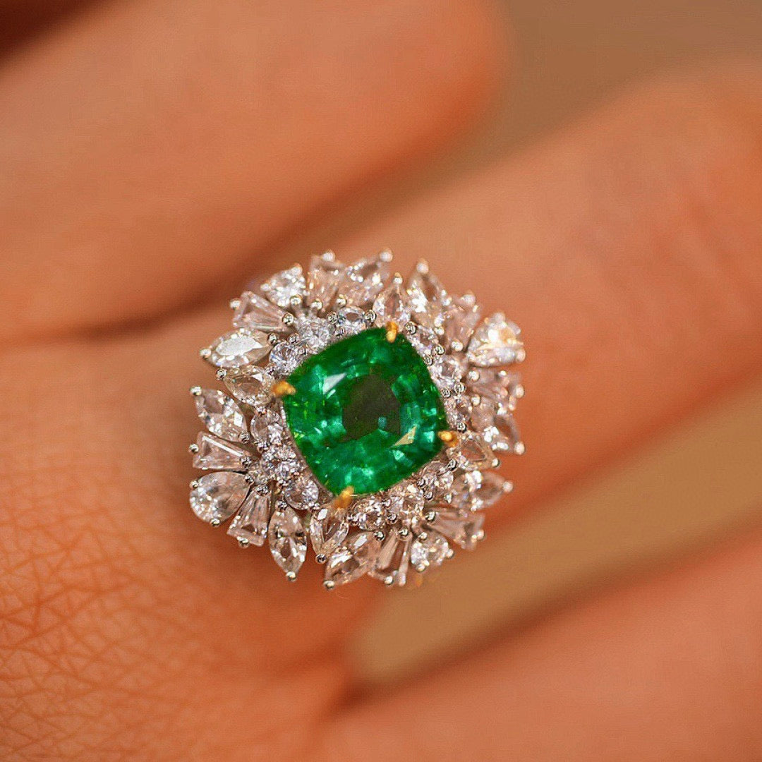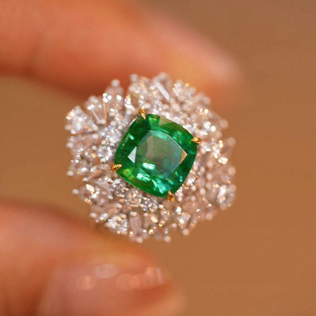 Ref:231023192 // Gold Content:14K Gold // Ring Size:7.25US // // Main Gemstone:Emerald // Shape:Cushion // Carat Weight:2.6ct // Color:Green // Treatment:Natural // // Adjacent Gemstone 2 : Diamond // Shape:Round // Clarity Grade:VS-SI // Color:H // Treatment:Natural // Cut Grade:G // // Adjacent Gemstone 3 : Sapphire // Shape:Multiply // Color:White // Treatment:Natural //