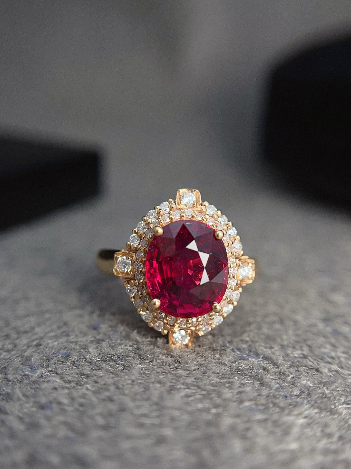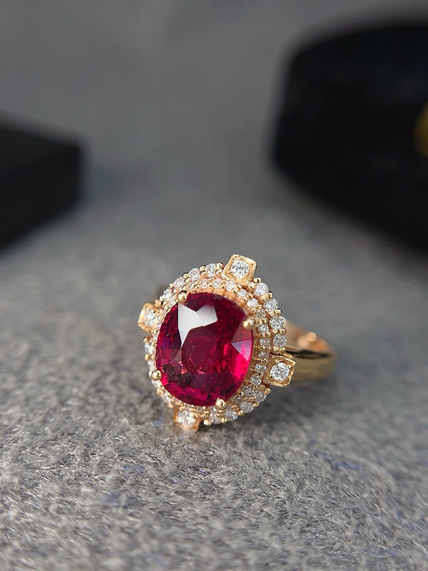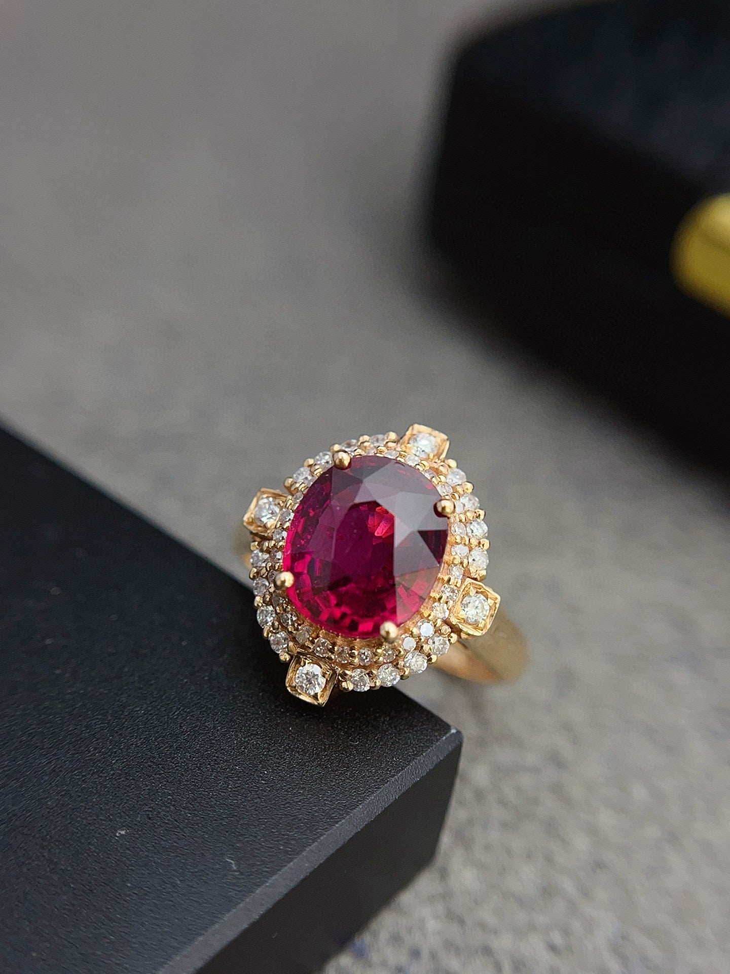 Ref:231027122 // Gold Content:14K Gold // Ring Size:7.25US // // Main Gemstone:Tourmaline // Shape:Oval // Carat Weight:2.60ct // Color:Red // Treatment:Natural // // Adjacent Gemstone 2 : Diamond // Number of stones:48 // Shape:Round // Clarity Grade:VS-SI // Color:H // Treatment:Natural // Cut Grade:G //