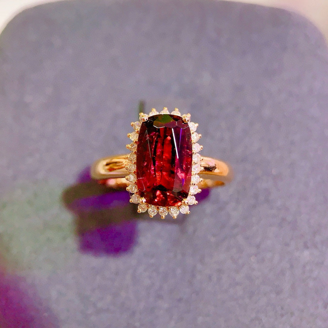 Ref:231023076 // Gold Content:14K Gold // Ring Size:7.25US // // Main Gemstone:Tourmaline // Shape:Cushion // Carat Weight:2.65ct // Color:Red // Treatment:Natural // // Adjacent Gemstone 2 : Diamond // Number of stones:26 // Shape:Round // Clarity Grade:VS-SI // Color:H // Treatment:Natural // Cut Grade:G //