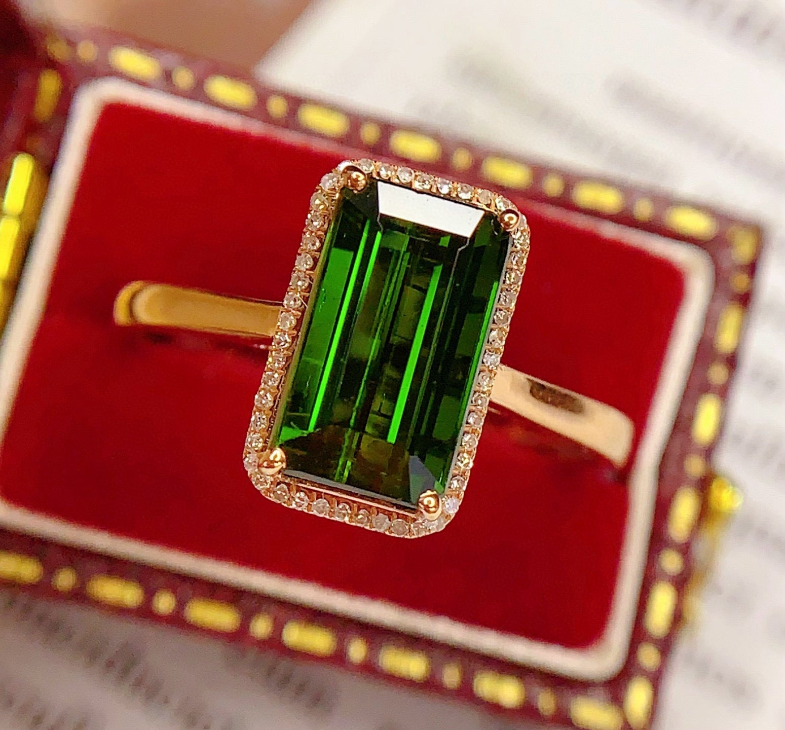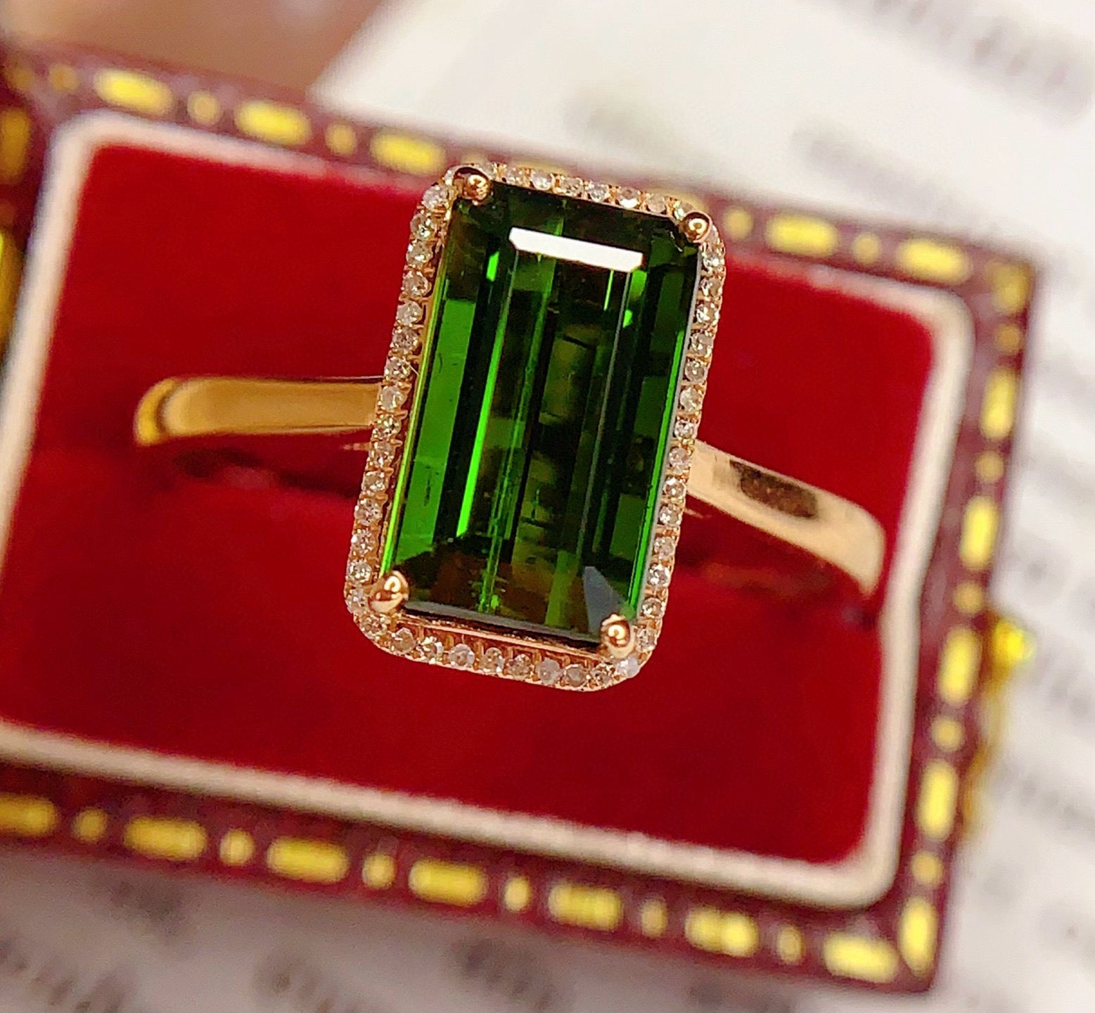 Ref:231025171 // Gold Content:14K Gold // Ring Size:7.25US // // Main Gemstone:Tourmaline // Shape:Octagonal // Carat Weight:2.68ct // Color:Green // Treatment:Natural // // Adjacent Gemstone 2 : Diamond // Number of stones:49 // Shape:Round // Clarity Grade:VS-SI // Color:H // Treatment:Natural // Cut Grade:G //