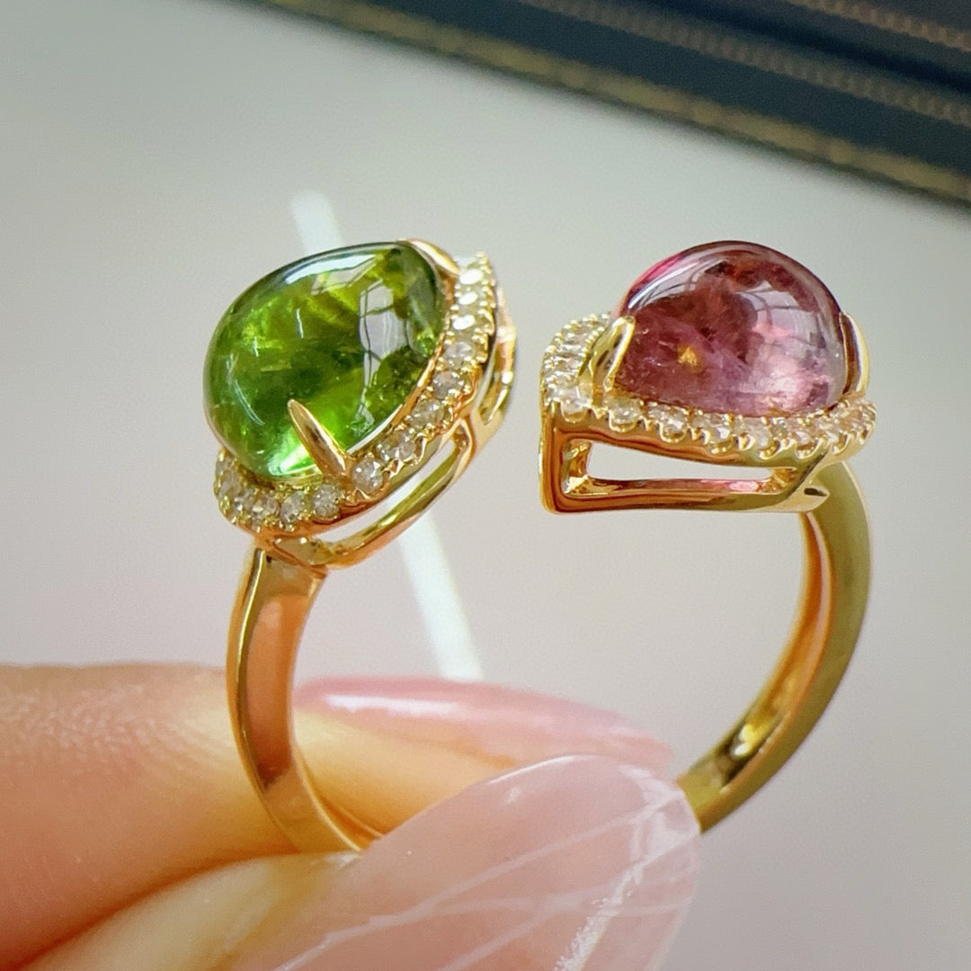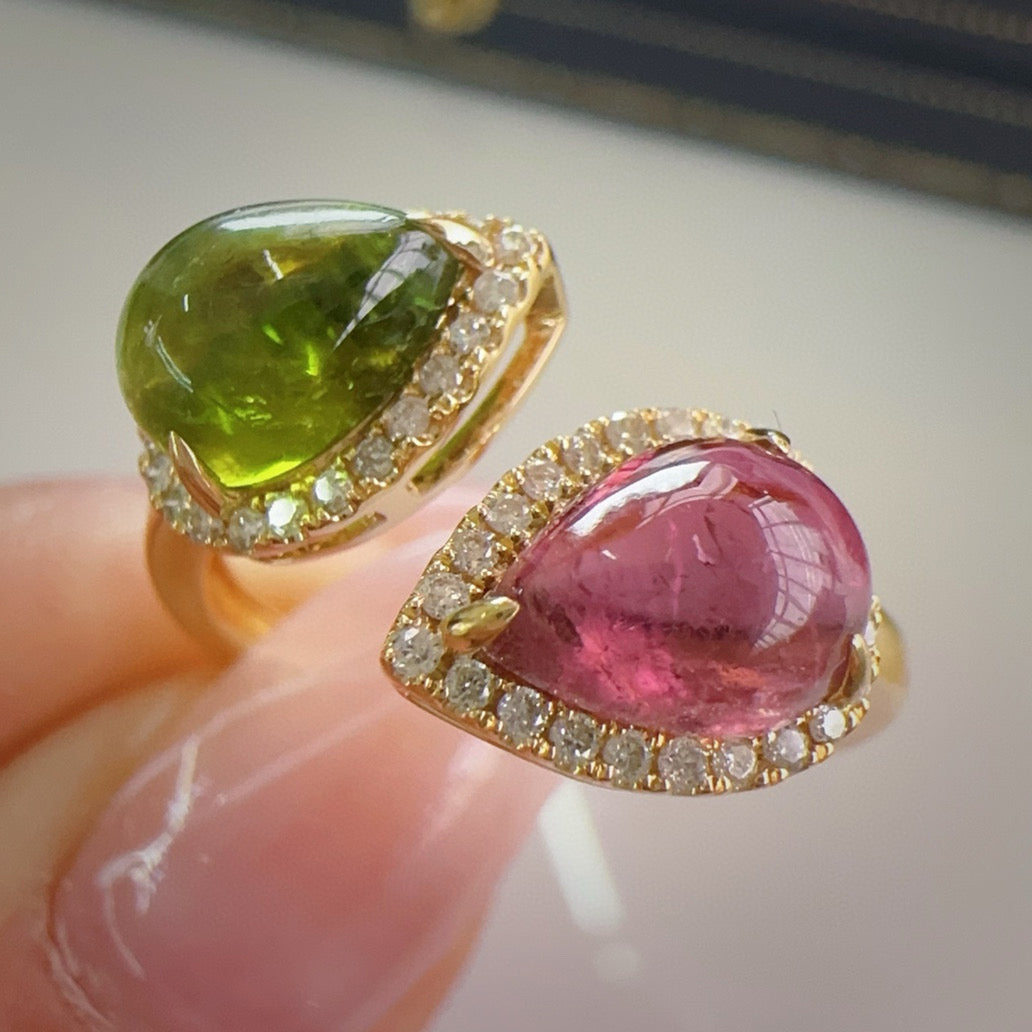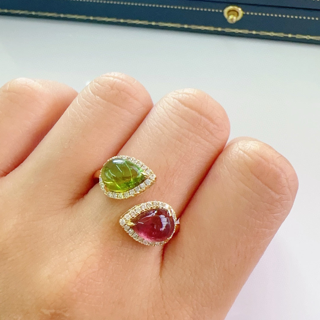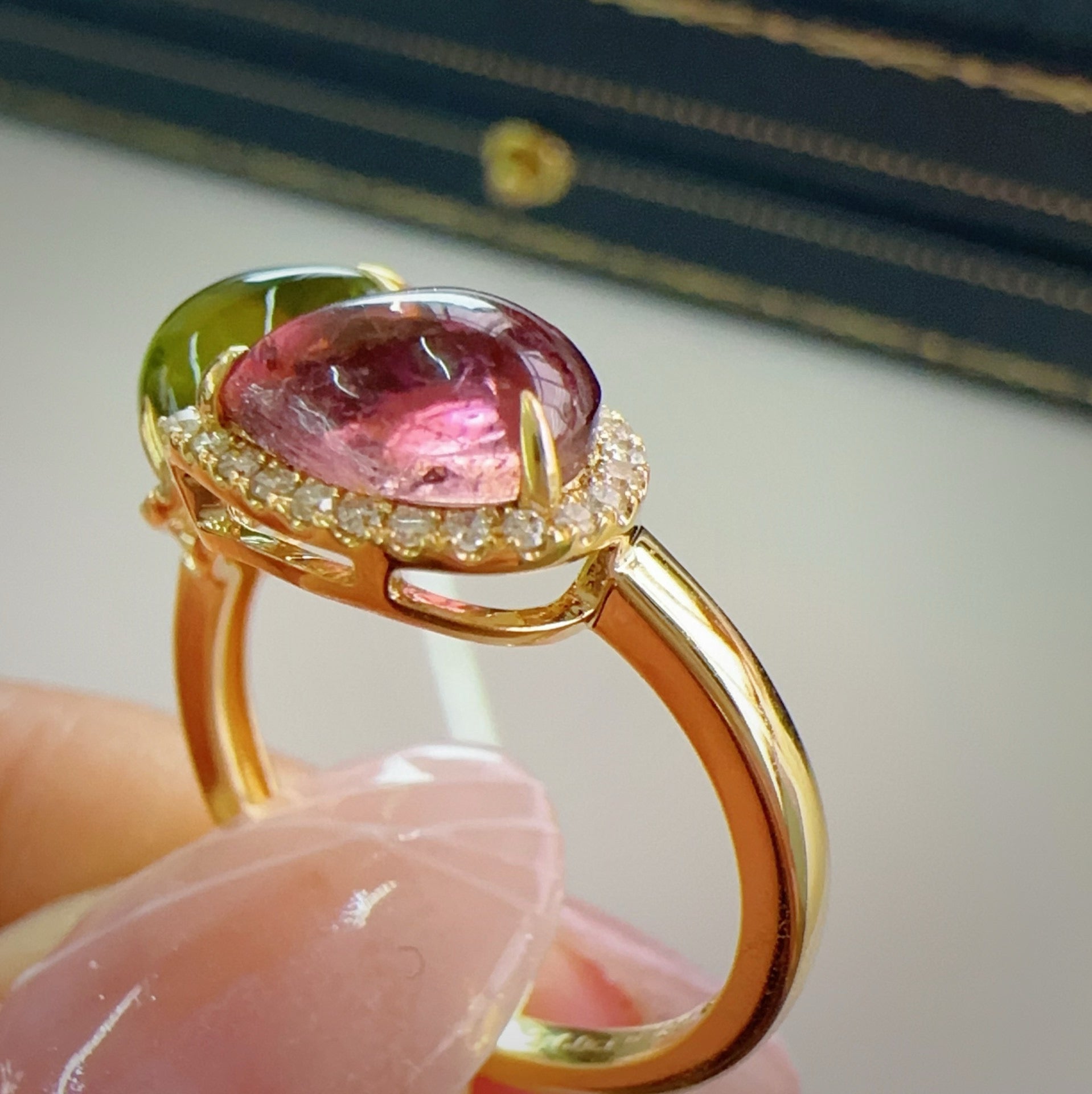 Ref:231019004 // Gold Content:14K Gold // Ring Size:7.25US // // Main Gemstone:Tourmaline // Shape:Pear // Carat Weight:2.5ct // Color:Green & Purple // Treatment:Natural // // Adjacent Gemstone 2 : Diamond // Shape:Round // Carat Weight:0.19ct // Clarity Grade:VS-SI // Color:H // Treatment:Natural // Cut Grade:G //