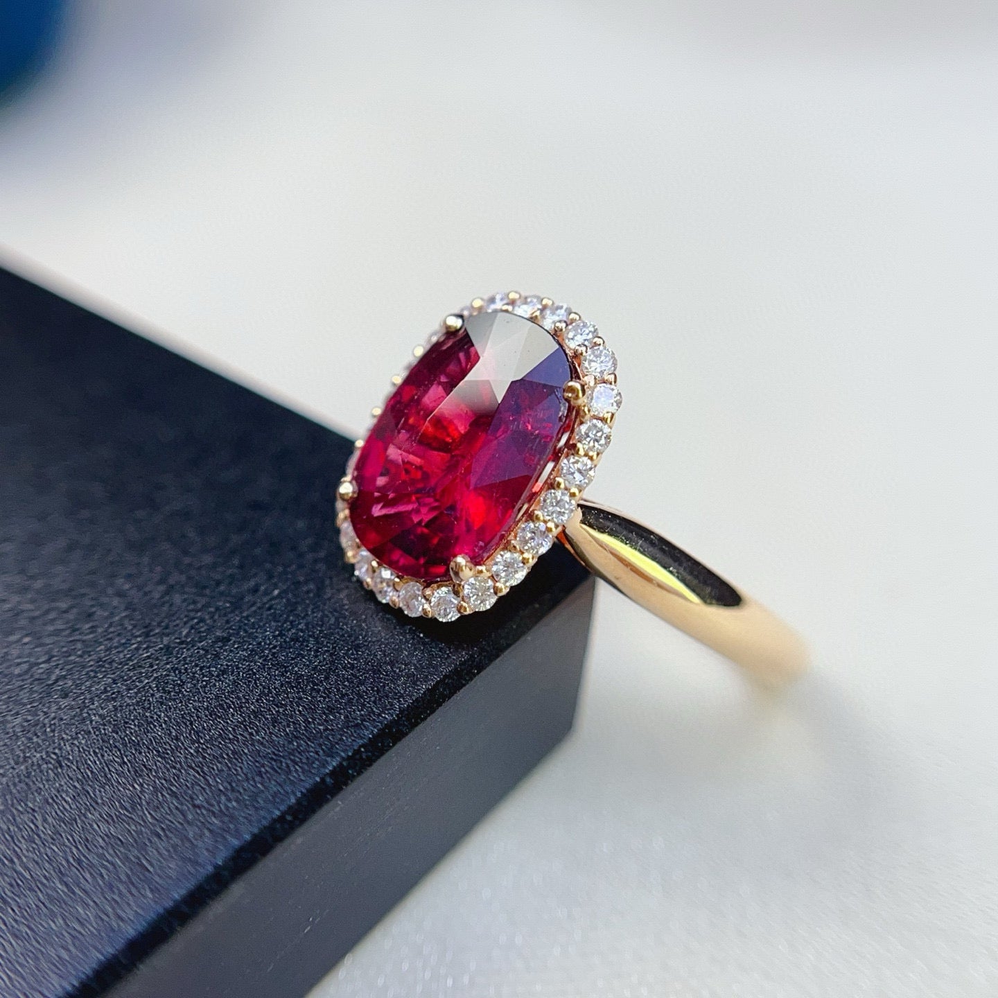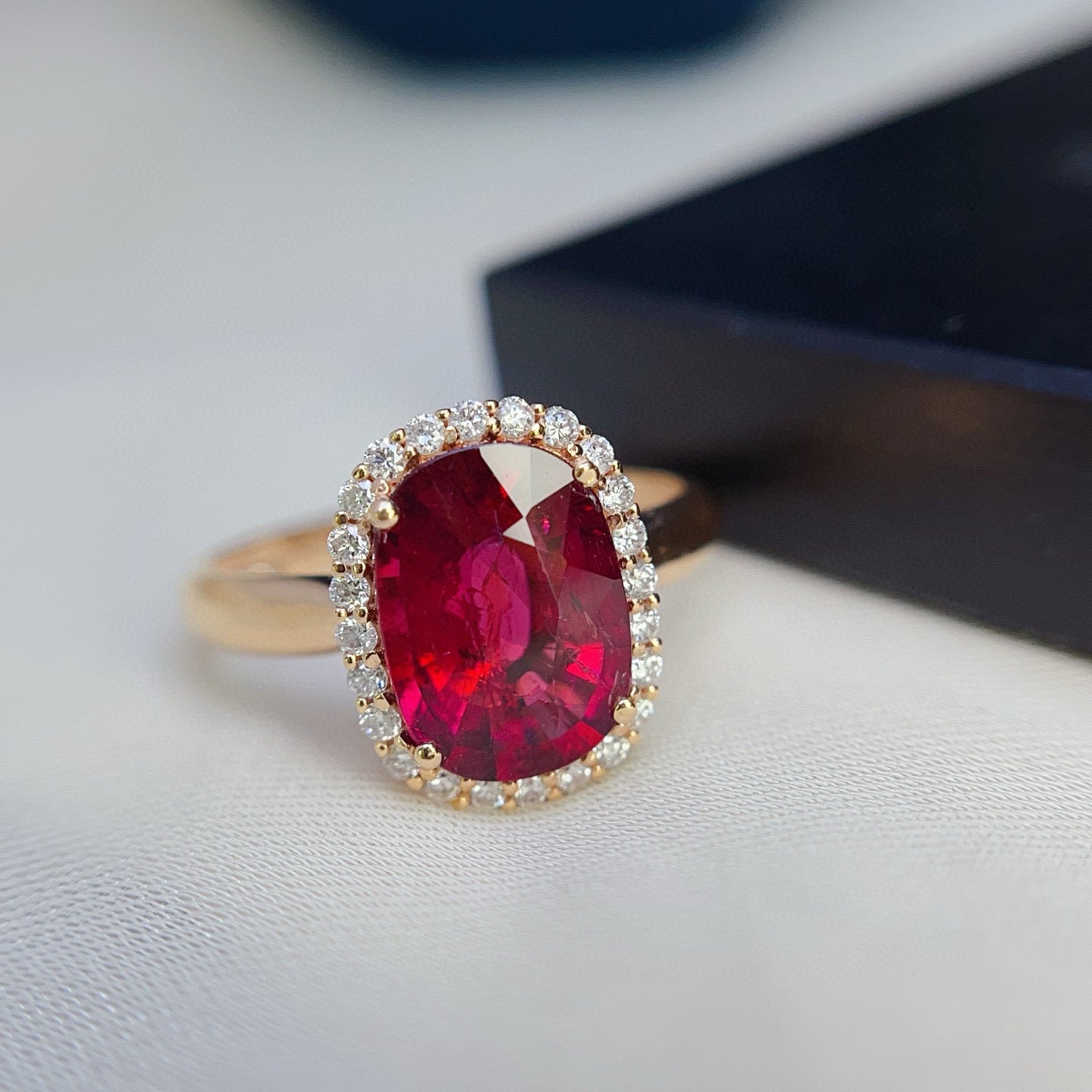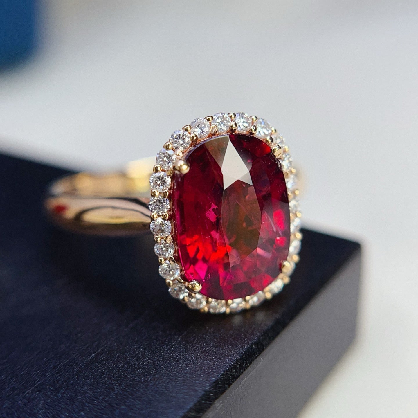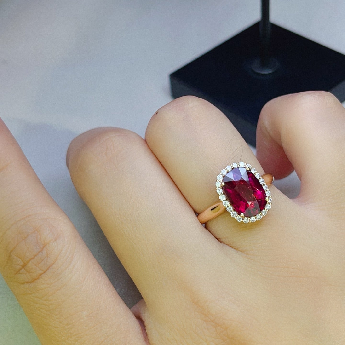 Ref:231027160 // Gold Content:14K Gold // Ring Size:7.25US // // Main Gemstone:Tourmaline // Shape:Oval // Carat Weight:2.70ct // Color:Red // Treatment:Natural // // Adjacent Gemstone 2 : Diamond // Number of stones:24 // Shape:Round // Clarity Grade:VS-SI // Color:H // Treatment:Natural // Cut Grade:G //