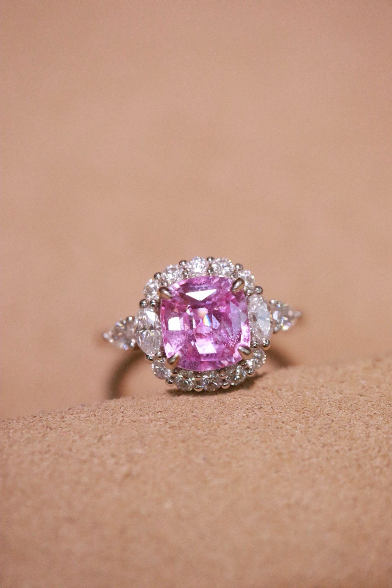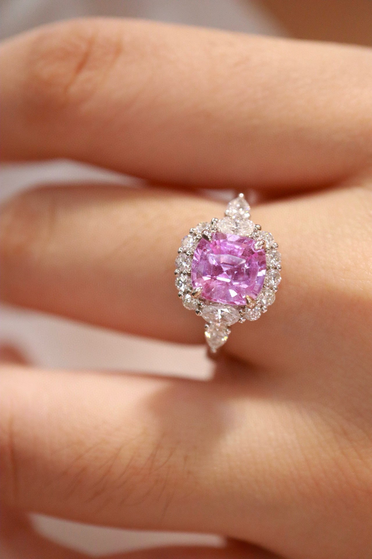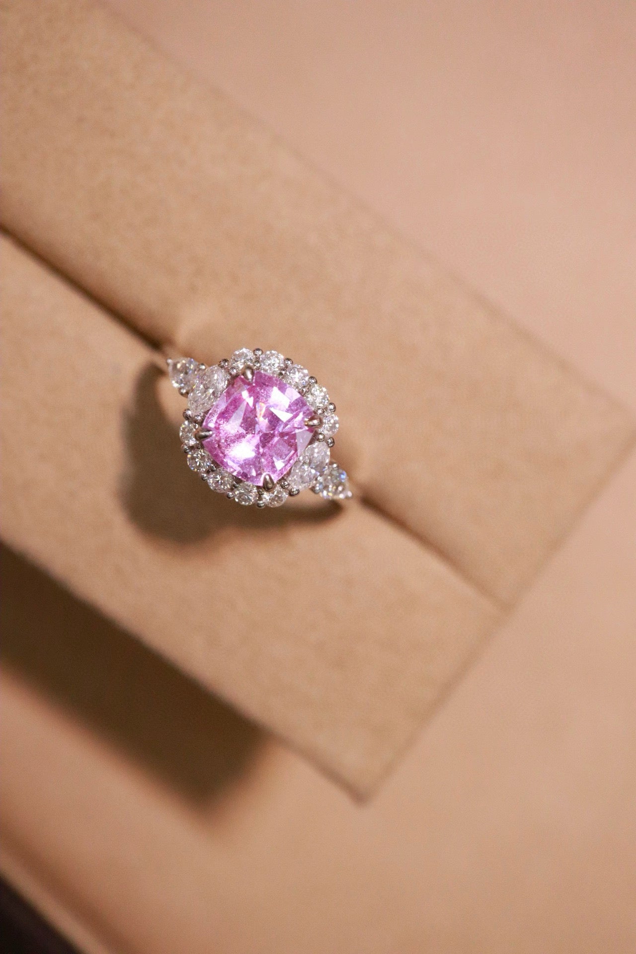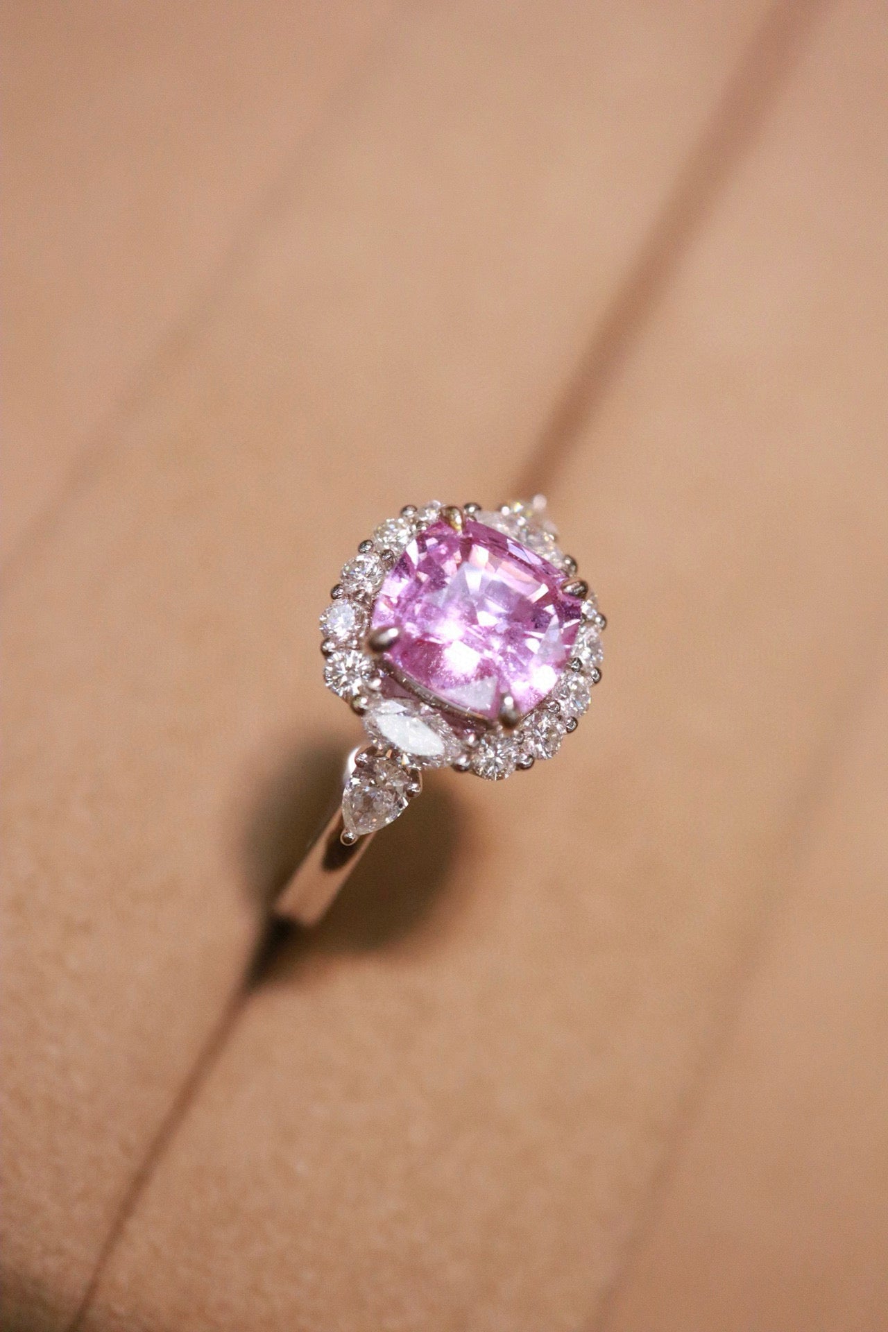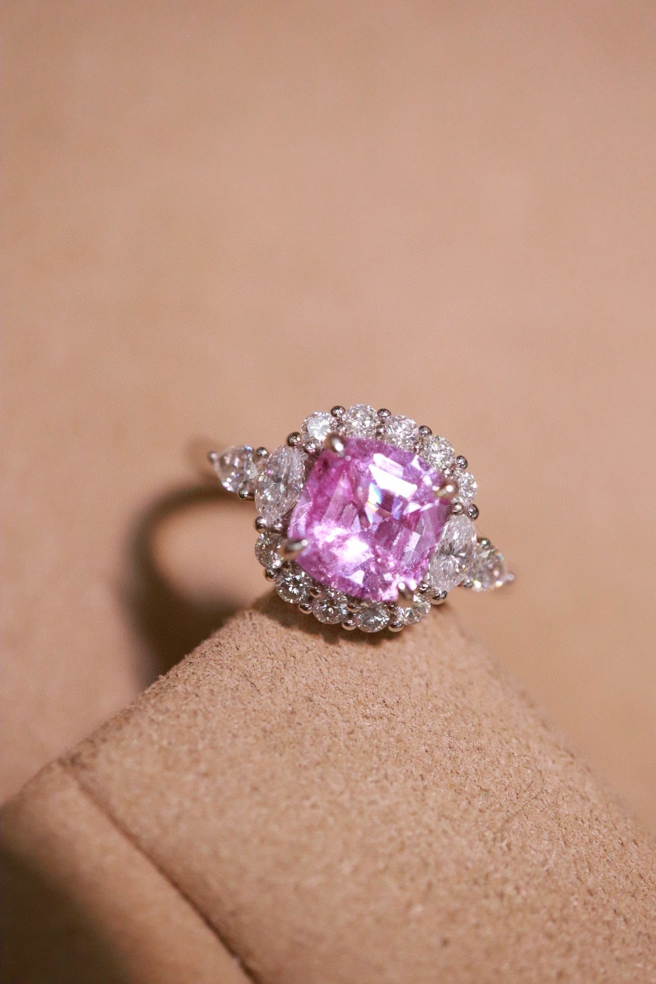 Ref:231025124 // Gold Content:14K Gold // Ring Size:7.25US // // Main Gemstone:Padparadscha Sapphire // Shape:Cushion // Carat Weight:2.04ct // Color:Orangish Pink // Treatment:Natural // // Adjacent Gemstone 2 : Diamond // Shape:Multiply // Carat Weight:0.72ct // Clarity Grade:VS-SI // Color:H // Treatment:Natural //