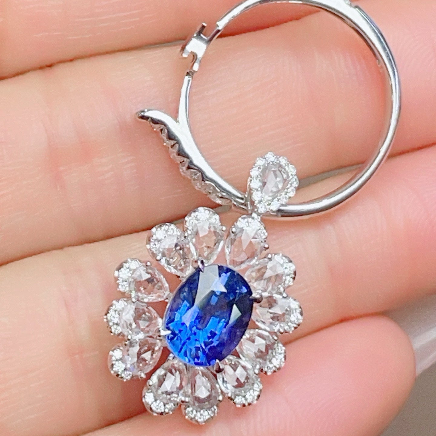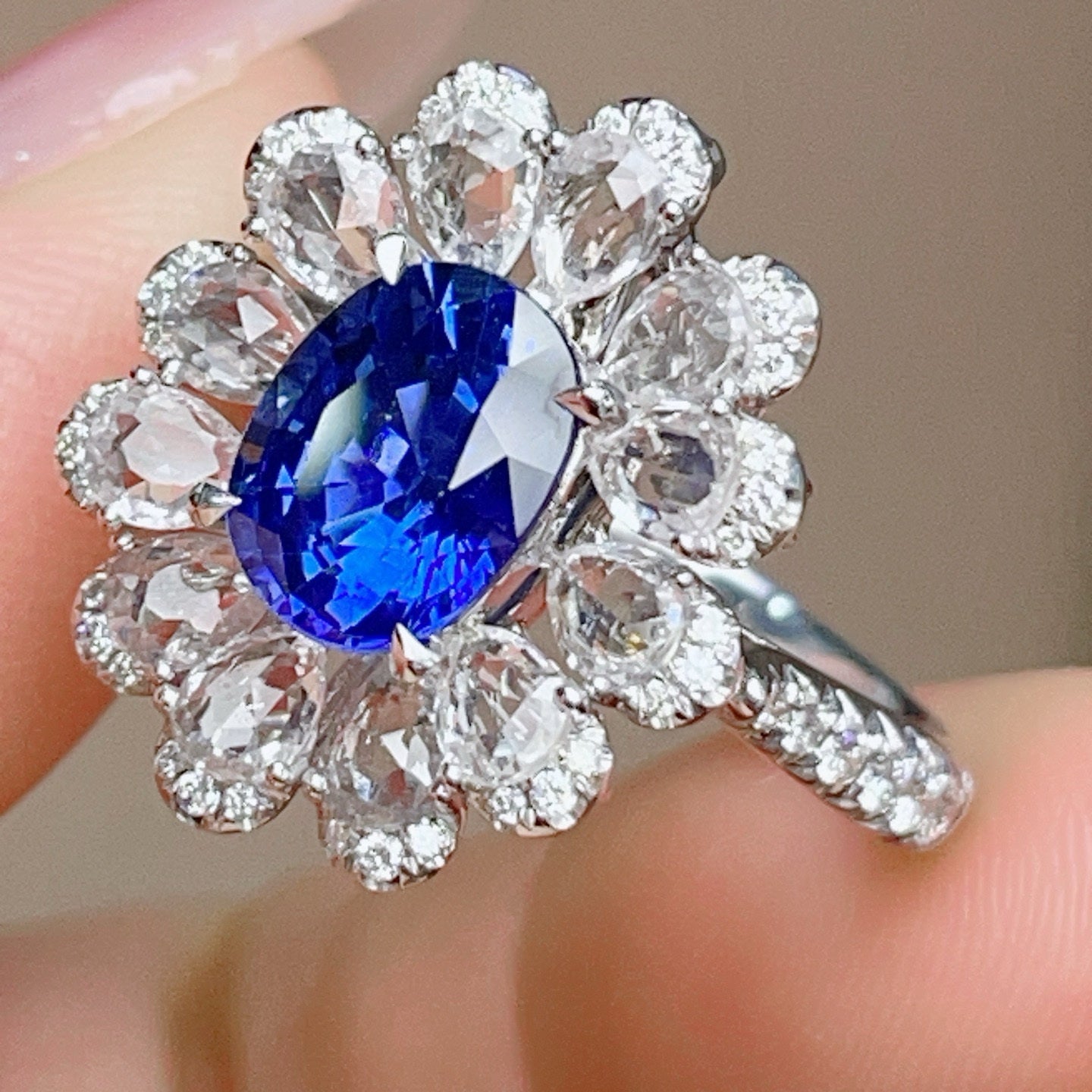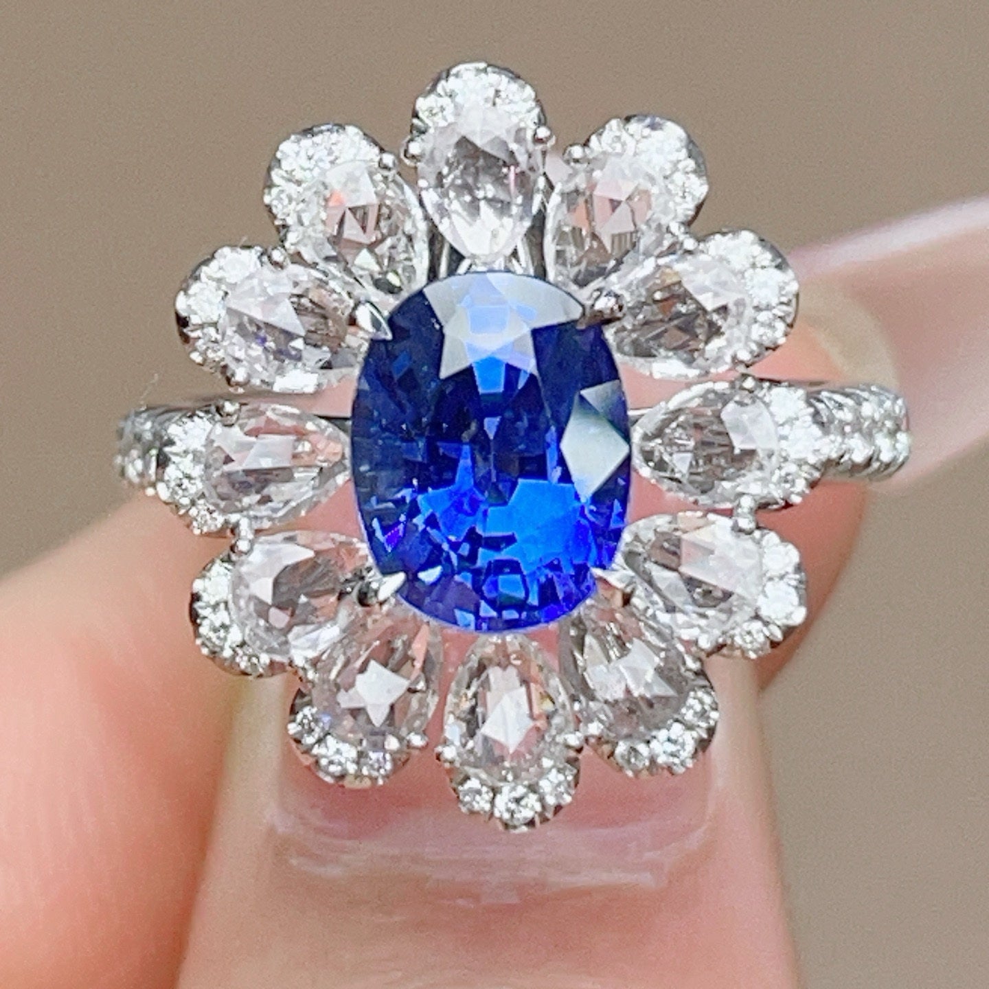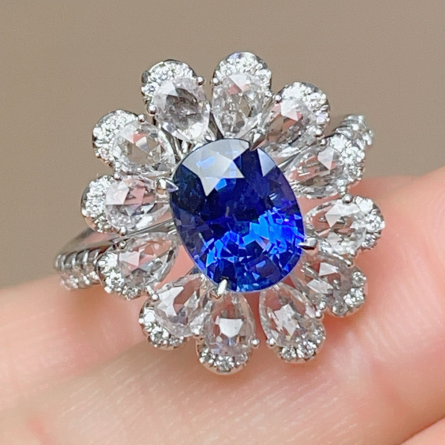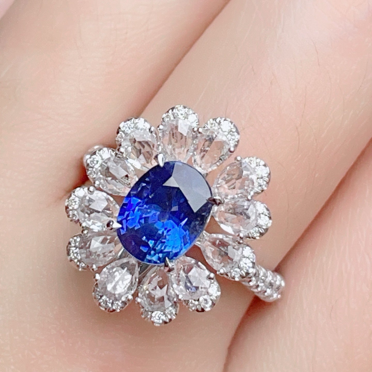 Ref:231023220 // Gold Content:14K Gold // Ring Size:7.25US // // Main Gemstone:Sapphire // Shape:Oval // Carat Weight:2.4ct // Color:Blue // Treatment:Natural // // Adjacent Gemstone 2 : Diamond // Shape:Round // Carat Weight:0.38ct // Clarity Grade:VS-SI // Color:H // Treatment:Natural // Cut Grade:G // // Adjacent Gemstone 3 : Sapphire // Number of stones:13 // Shape:Pear // Color:White // Treatment:Natural //