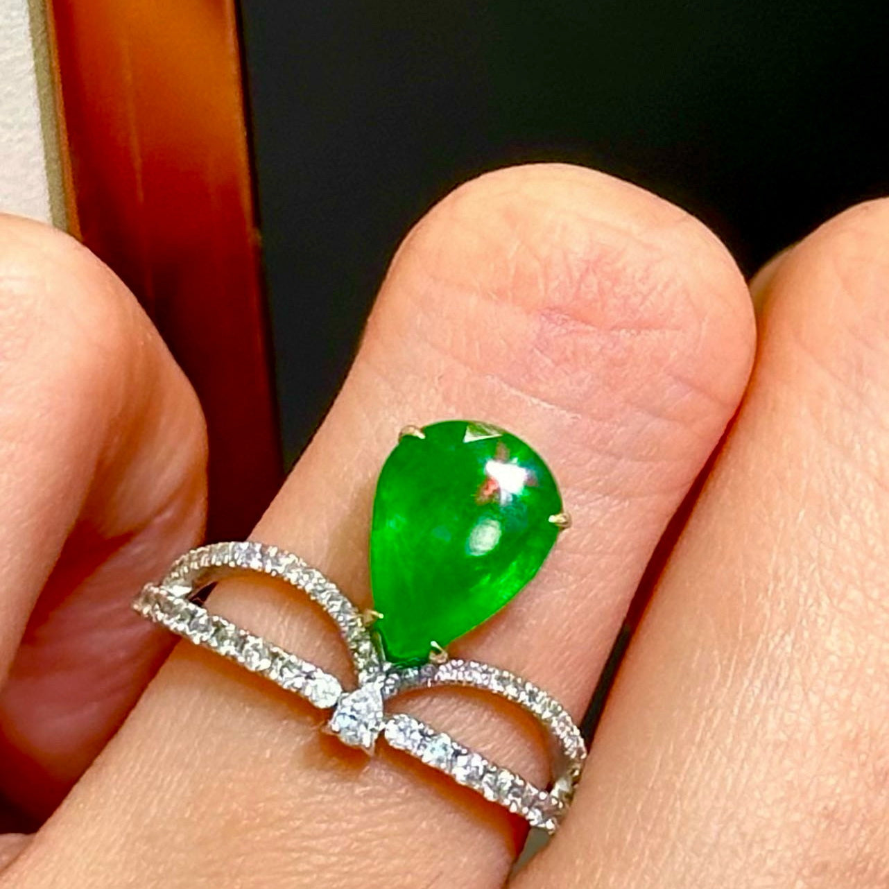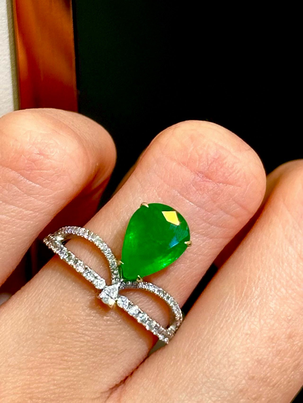 Ref:231019042 // Gold Content:14K Gold // Ring Size:7.25US // // Main Gemstone:Emerald // Shape:Pear // Carat Weight:2ct // Color:Green // Treatment:Natural // // Adjacent Gemstone 2 : Diamond // Shape:Round // Clarity Grade:VS-SI // Color:H // Treatment:Natural // Cut Grade:G //