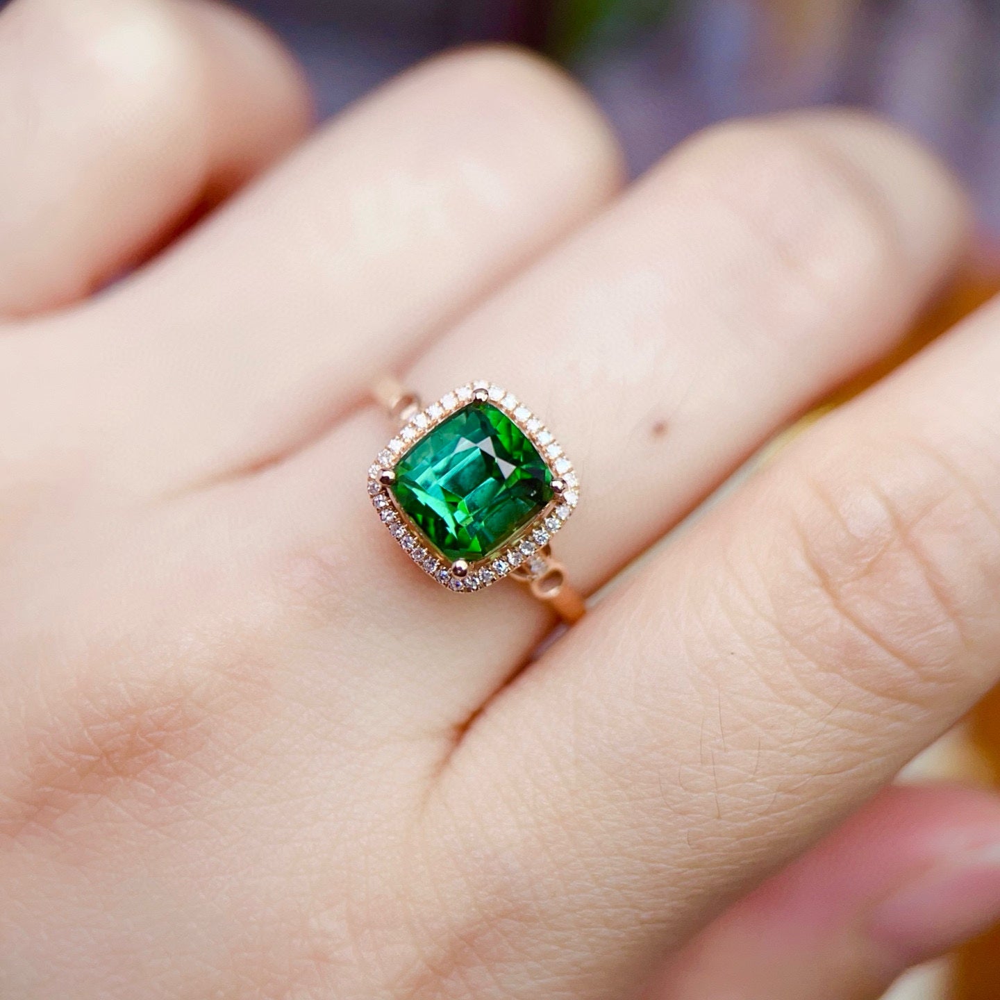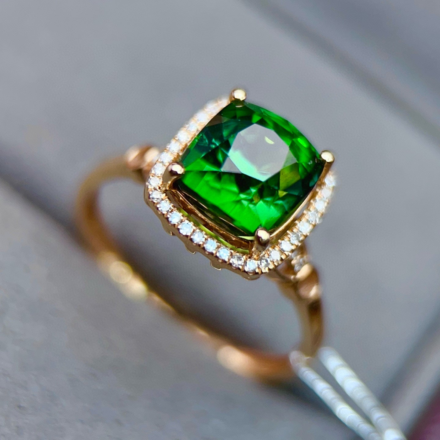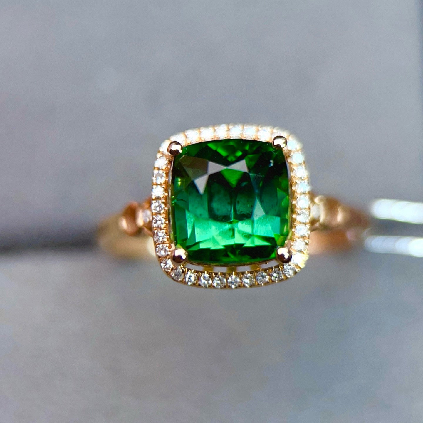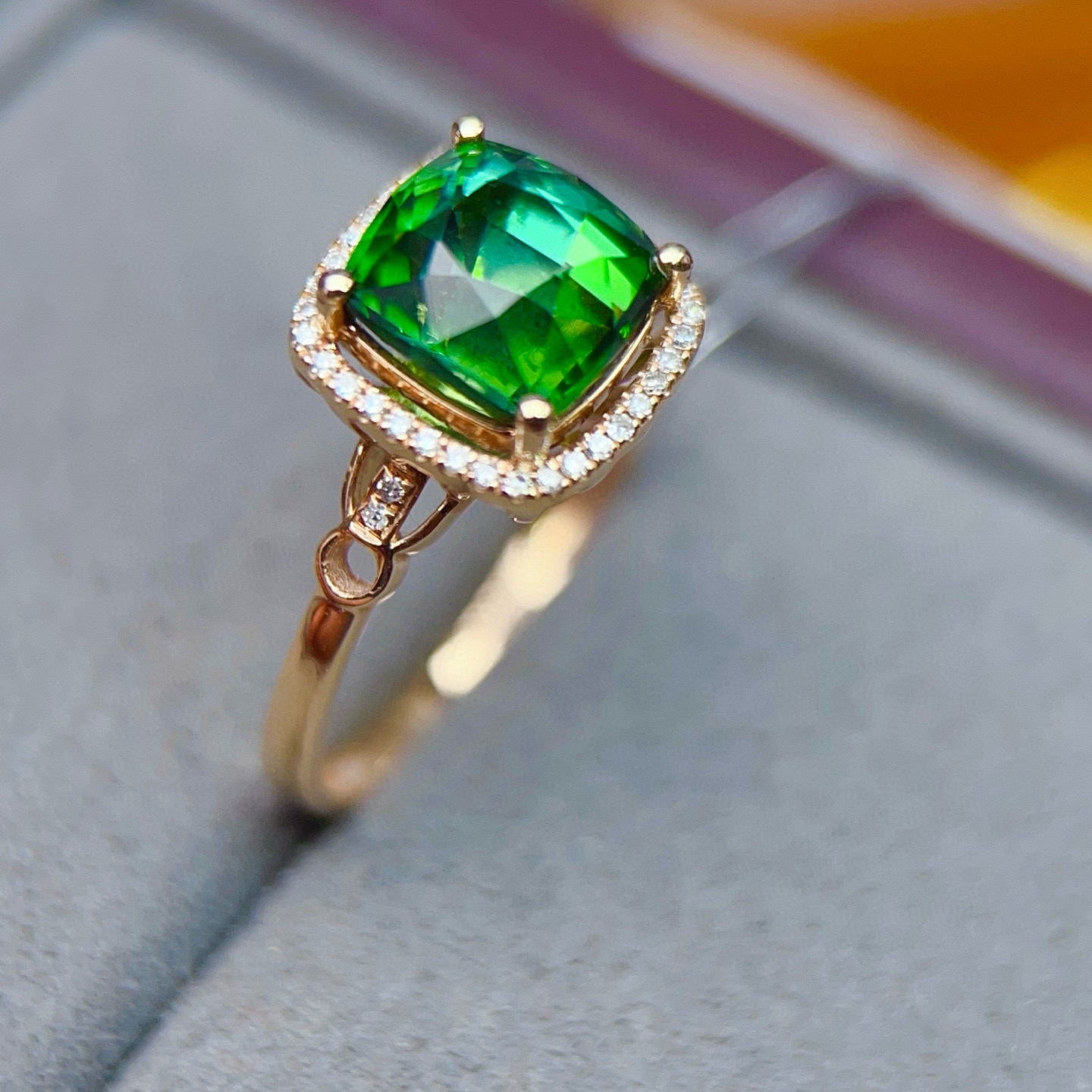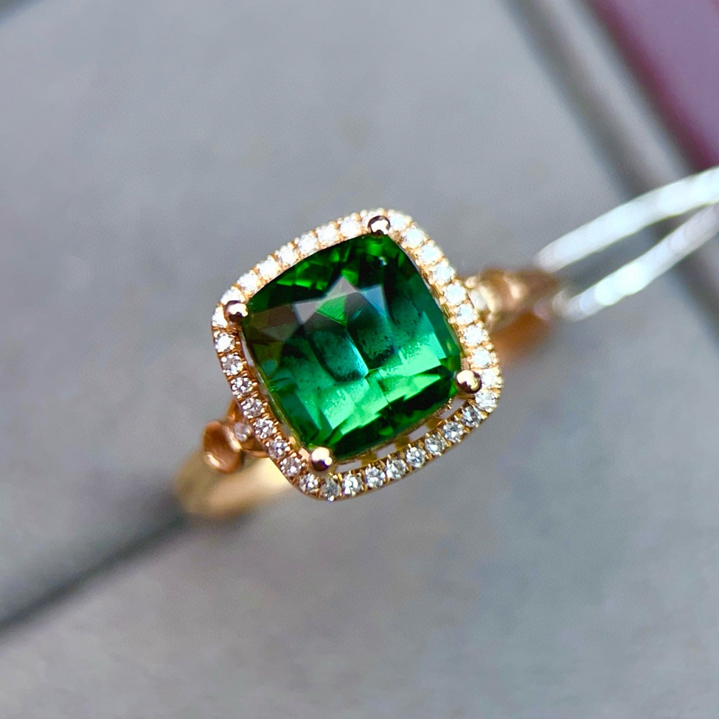 Ref:231021166 // Gold Content:14K Gold // Ring Size:7.25US // // Main Gemstone:Tourmaline // Shape:Cushion // Carat Weight:3ct // Color:Green // Treatment:Natural // // Adjacent Gemstone 2 : Diamond // Number of stones:46 // Shape:Round // Carat Weight:0.14ct // Clarity Grade:VS-SI // Color:H // Treatment:Natural // Cut Grade:G //