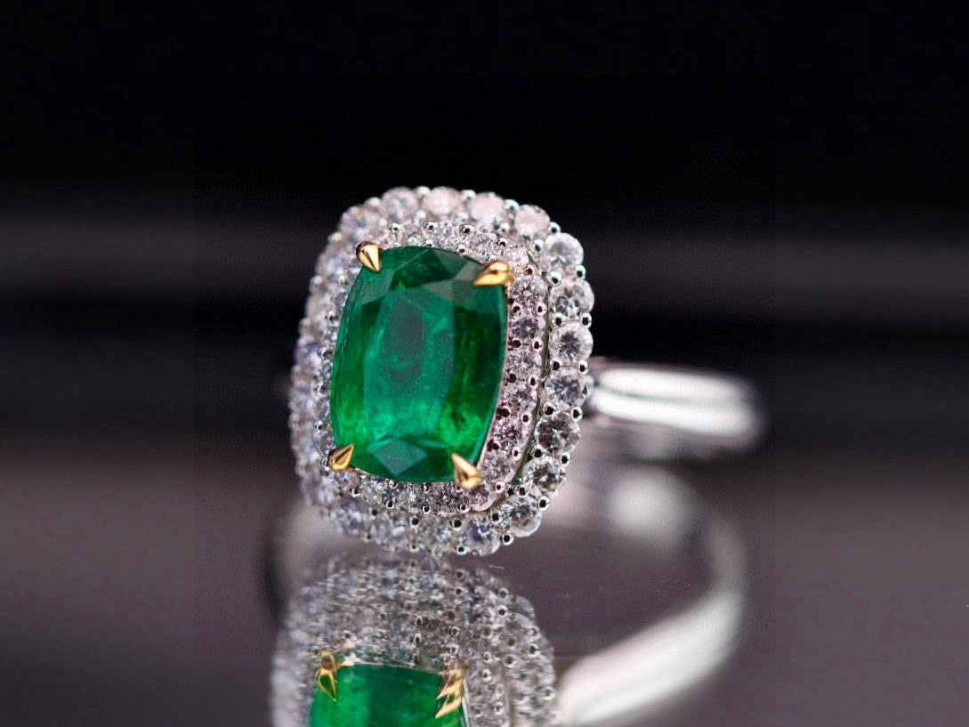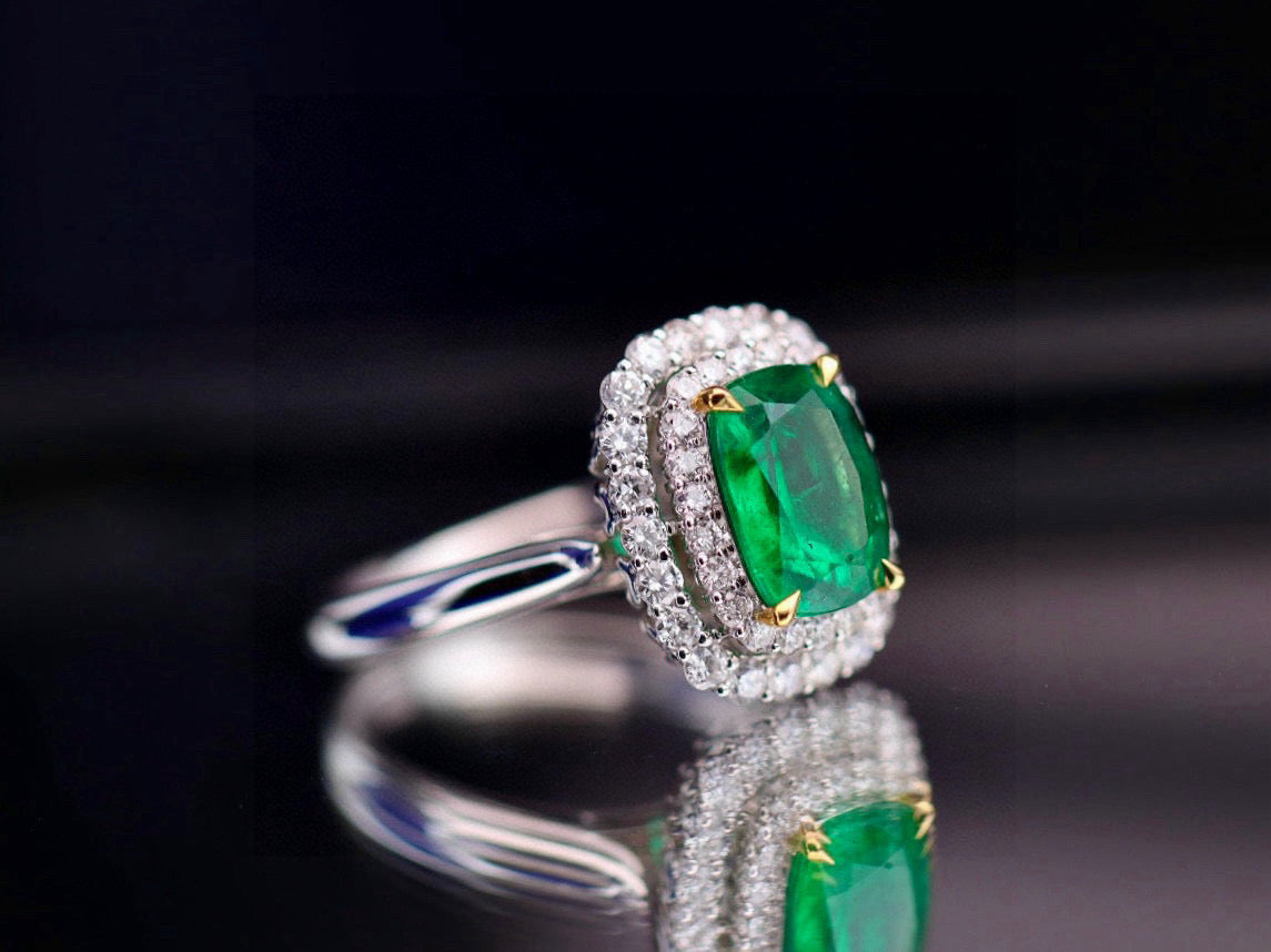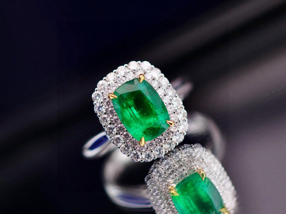Ref:231023012 // Gold Content:14K Gold // Ring Size:7.25US // // Main Gemstone:Emerald // Shape:Cushion // Carat Weight:2.38ct // Color:Green // Treatment:Natural // // Adjacent Gemstone 2 : Diamond // Shape:Round // Carat Weight:0.93ct // Clarity Grade:VS-SI // Color:H // Treatment:Natural // Cut Grade:G //