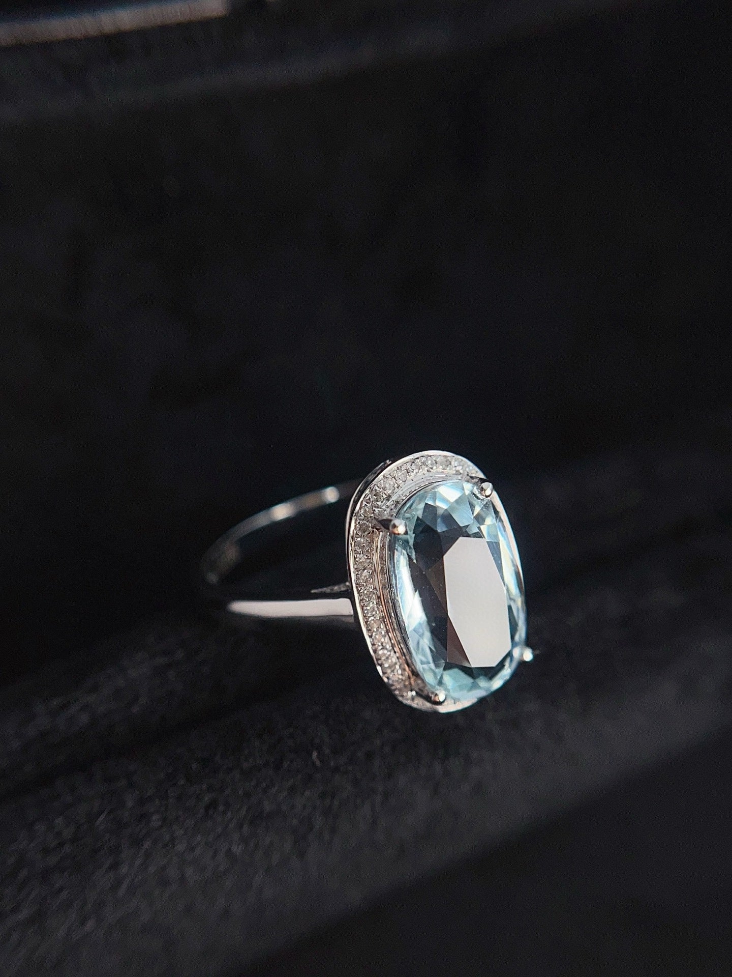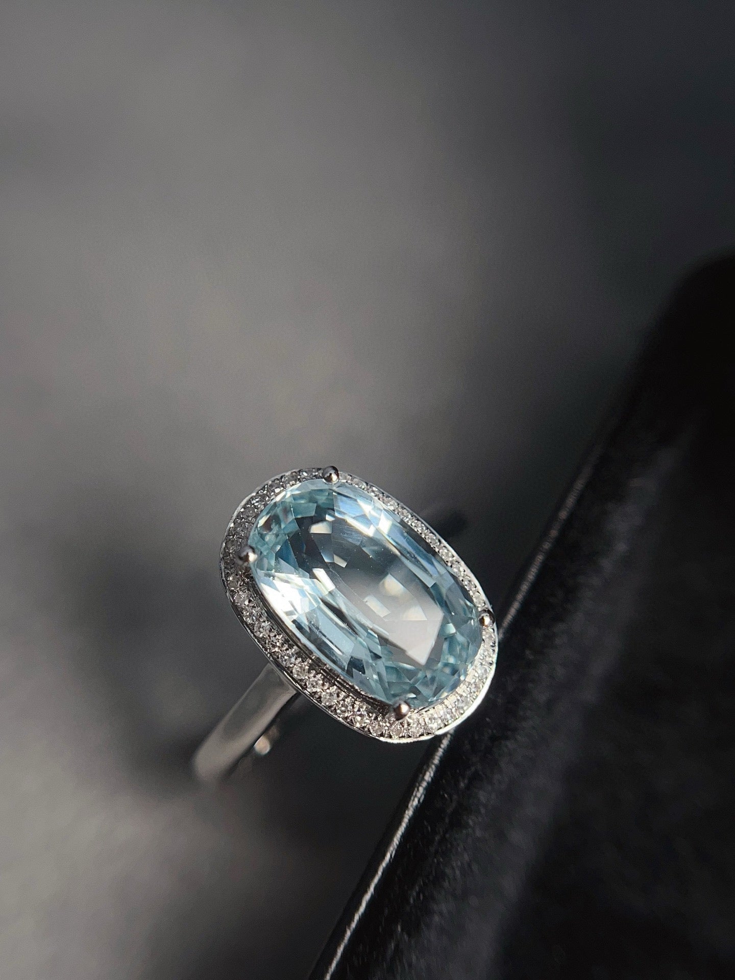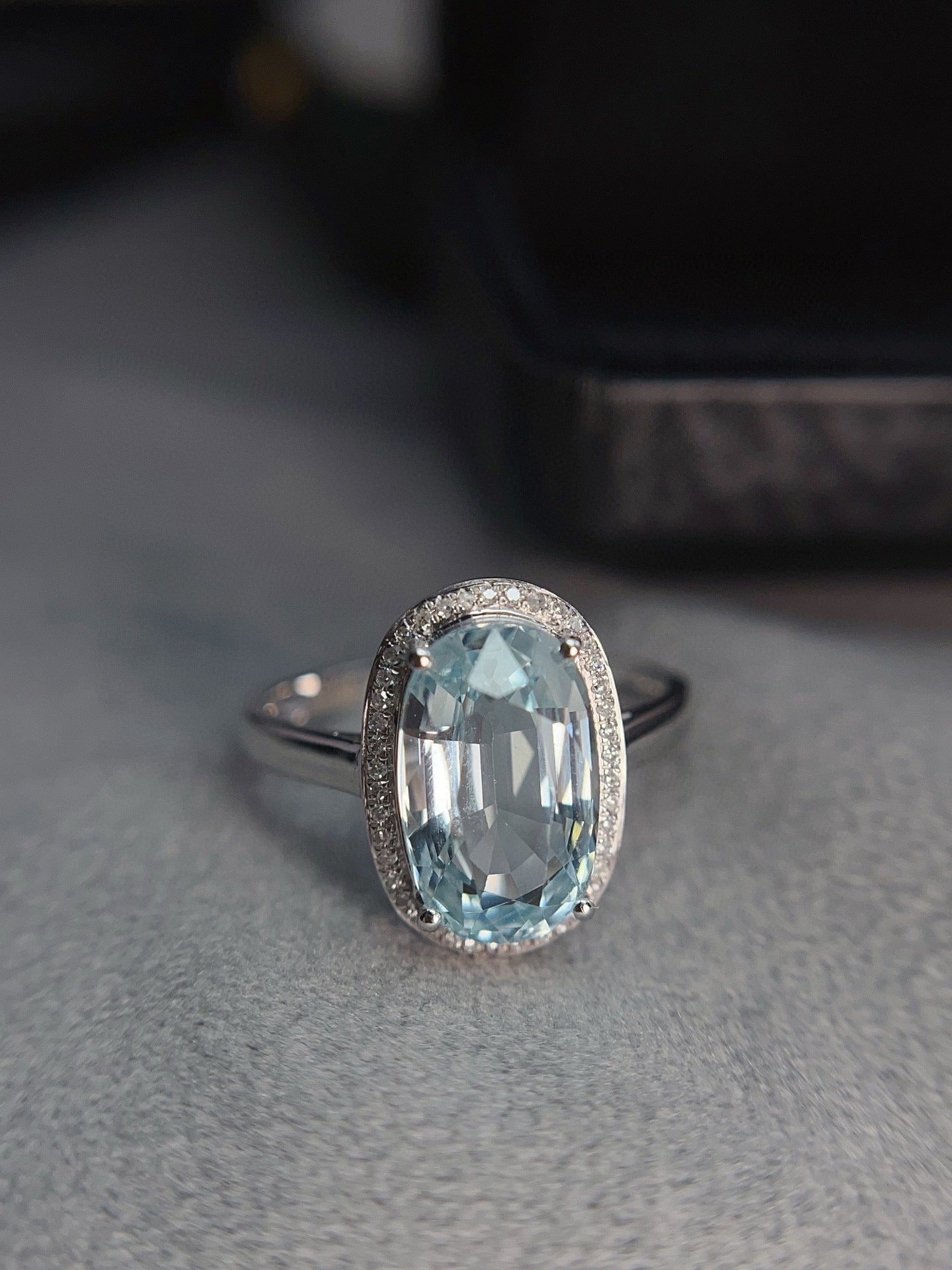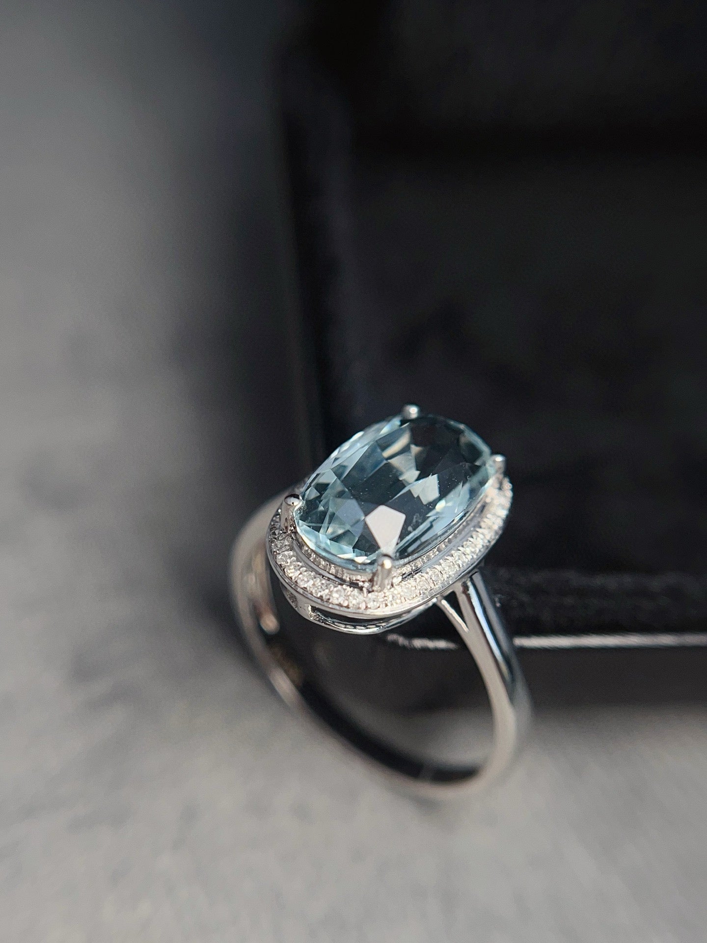 Ref:231027167 // Gold Content:14K Gold // Ring Size:7.25US // // Main Gemstone:Aquamarine // Shape:Oval // Carat Weight:3.50ct // Color:Blue // Treatment:Natural // // Adjacent Gemstone 2 : Diamond // Number of stones:43 // Shape:Round // Clarity Grade:VS-SI // Color:H // Treatment:Natural // Cut Grade:G //