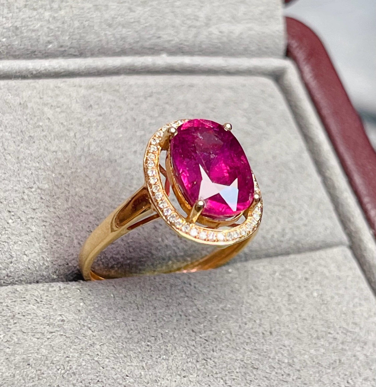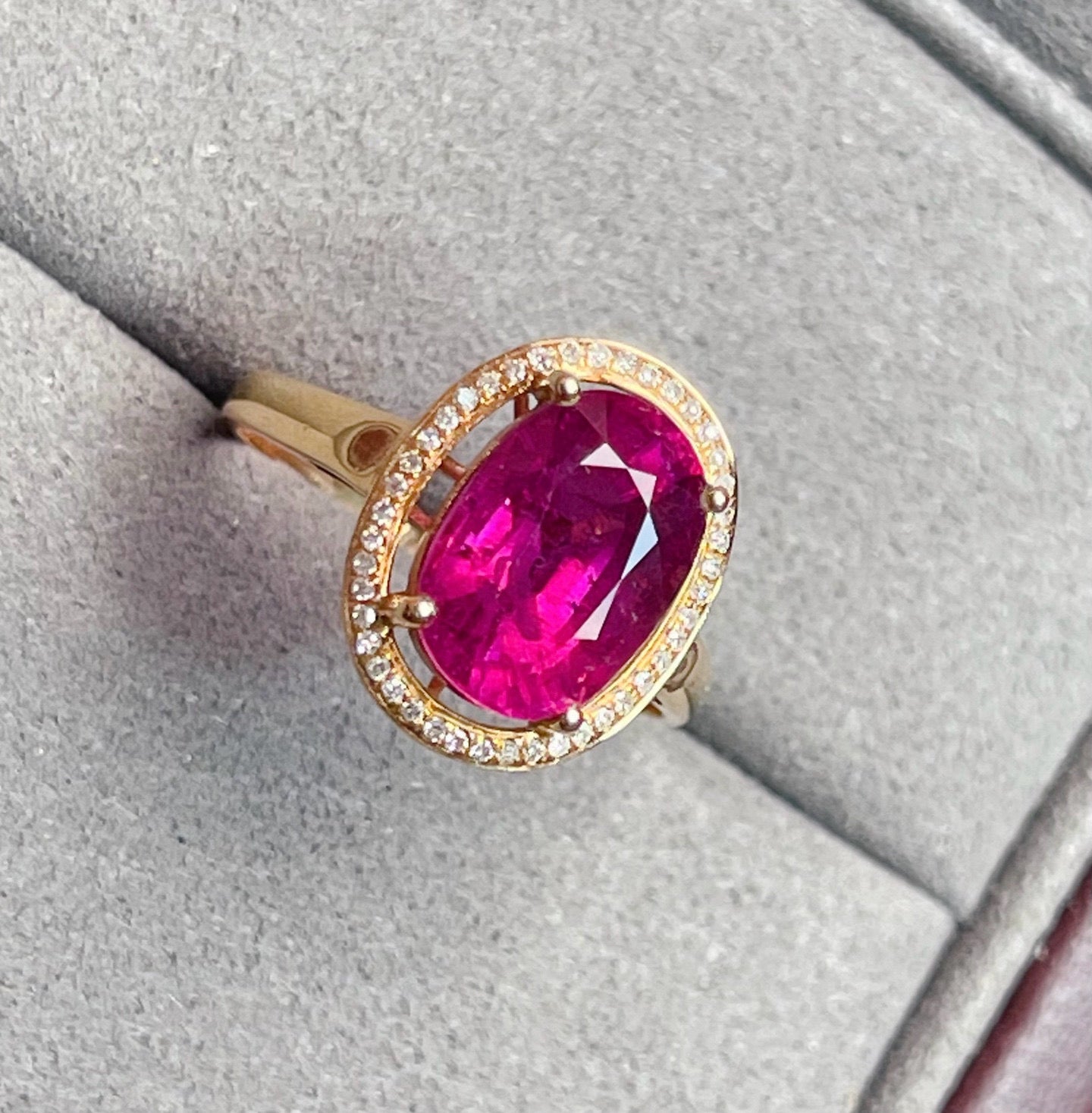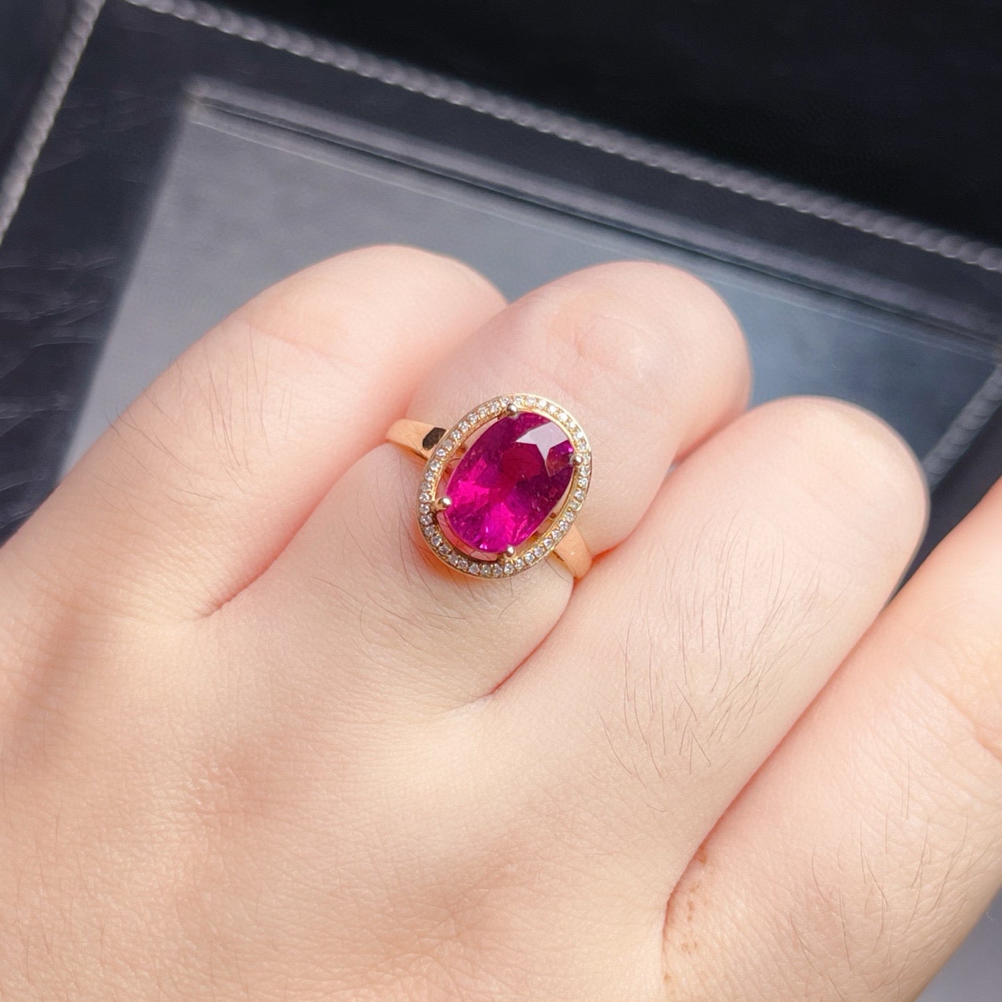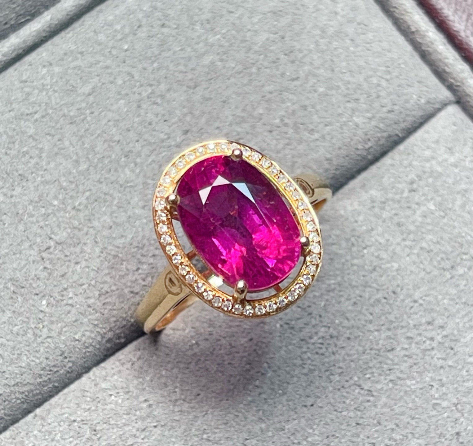 Ref:231019083 // Gold Content:14K Gold // Ring Size:7.25US // // Main Gemstone:Tourmaline // Shape:Oval // Carat Weight:3.55ct // Color:Red // Treatment:Natural // // Adjacent Gemstone 2 : Diamond // Number of stones:43 // Shape:Round // Carat Weight:0.13ct // Clarity Grade:VS-SI // Color:H // Treatment:Natural // Cut Grade:G //