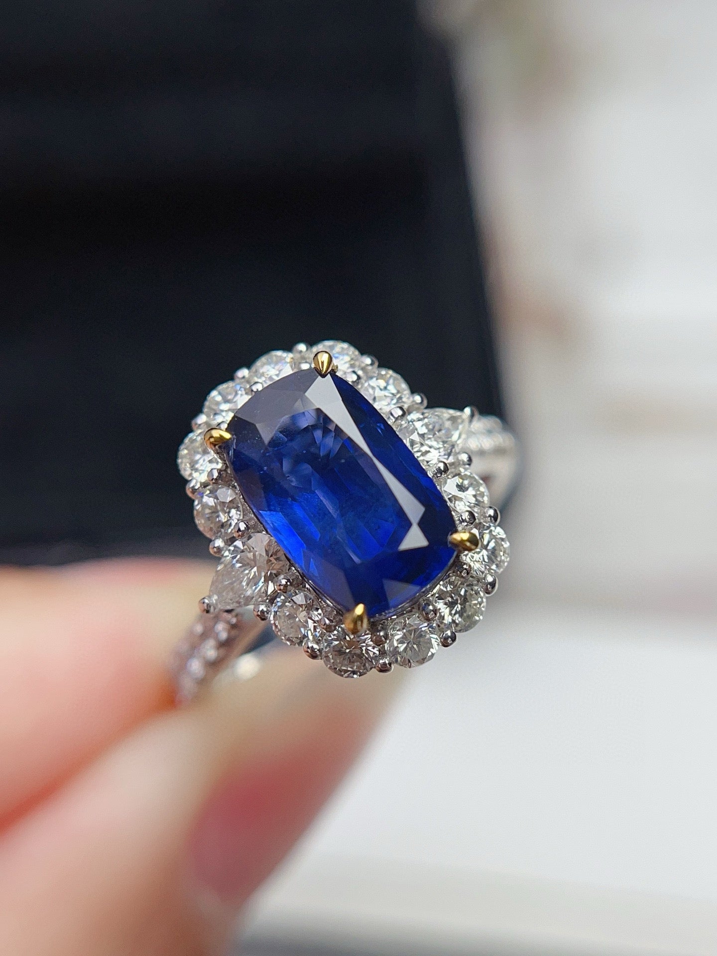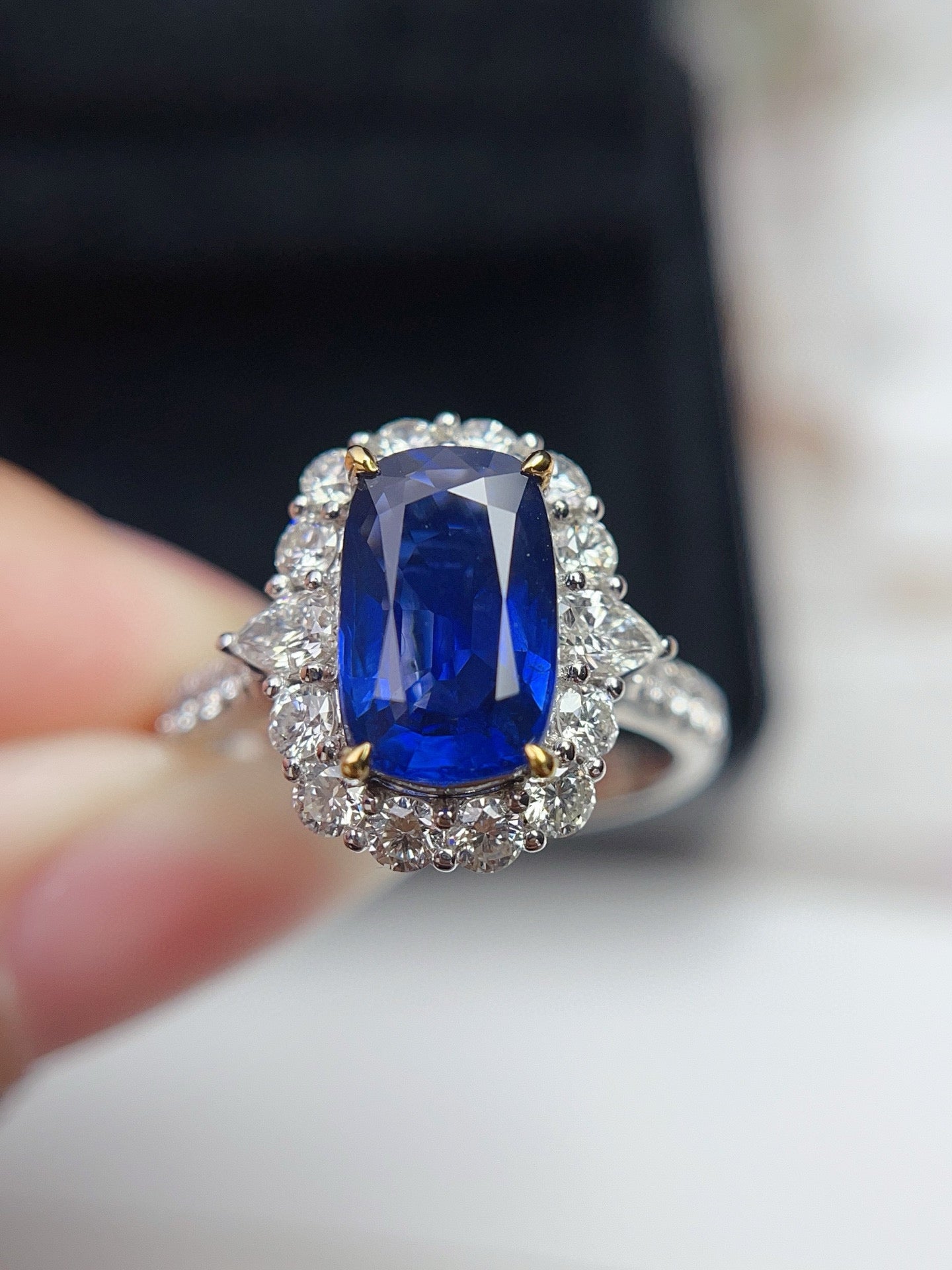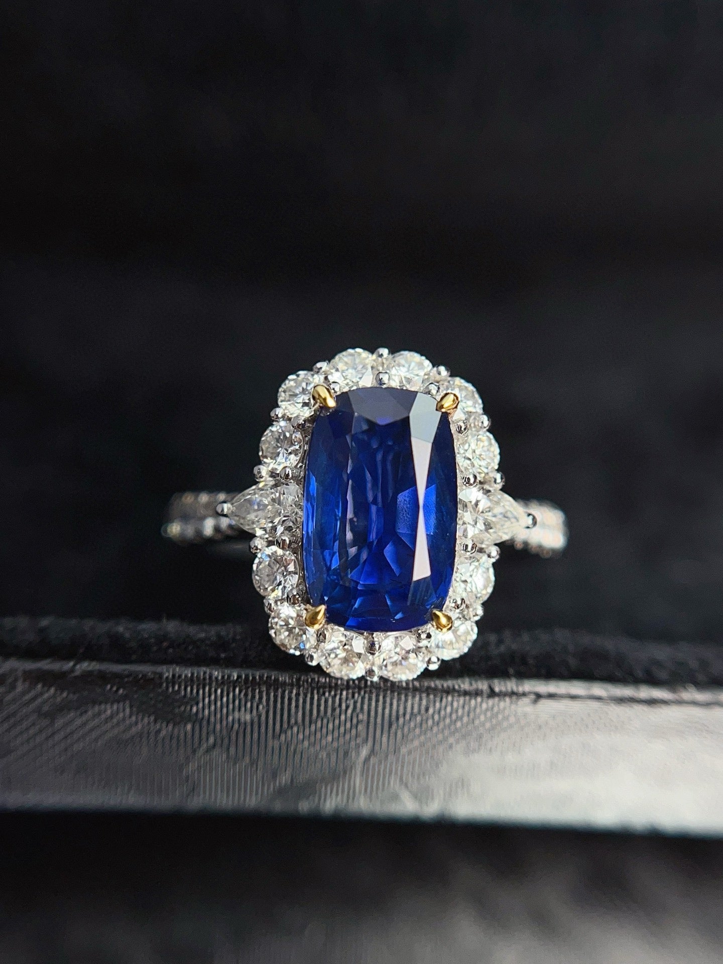 Ref:231027078 // Gold Content:14K Gold // Ring Size:7.25US // // Main Gemstone:Sapphire // Shape:Cushion // Carat Weight:2.55ct // Color:Vivid Blue // Treatment:Natural // // Adjacent Gemstone 2 : Diamond // Shape:Multiply // Carat Weight:1.21ct // Clarity Grade:VS-SI // Color:H // Treatment:Natural //