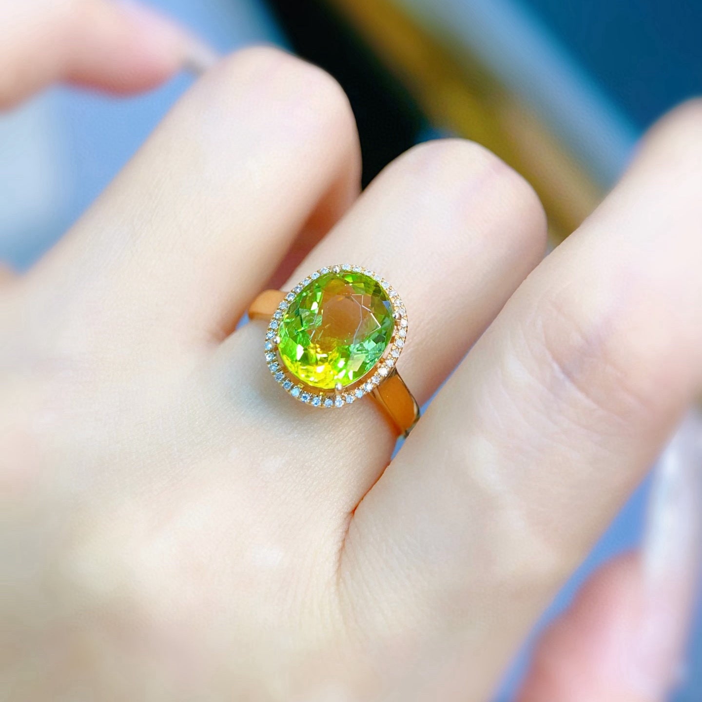 Ref:231023037 // Gold Content:14K Gold // Ring Size:7.25US // // Main Gemstone:Tourmaline // Shape:Oval // Carat Weight:3.8ct // Color:Green // Treatment:Natural // // Adjacent Gemstone 2 : Diamond // Number of stones:40 // Shape:Round // Clarity Grade:VS-SI // Color:H // Treatment:Natural // Cut Grade:G //