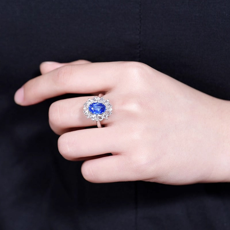 Ref:231021056 // Gold Content:14K Gold // Ring Size:7.25US // // Main Gemstone:Sapphire // Shape:Oval // Carat Weight:2.96ct // Color:Cornflower Blue // Treatment:Natural // // Adjacent Gemstone 2 : Diamond // Number of stones:17 // Shape:Multiply // Carat Weight:1.02ct // Clarity Grade:VS-SI // Color:H // Treatment:Natural //