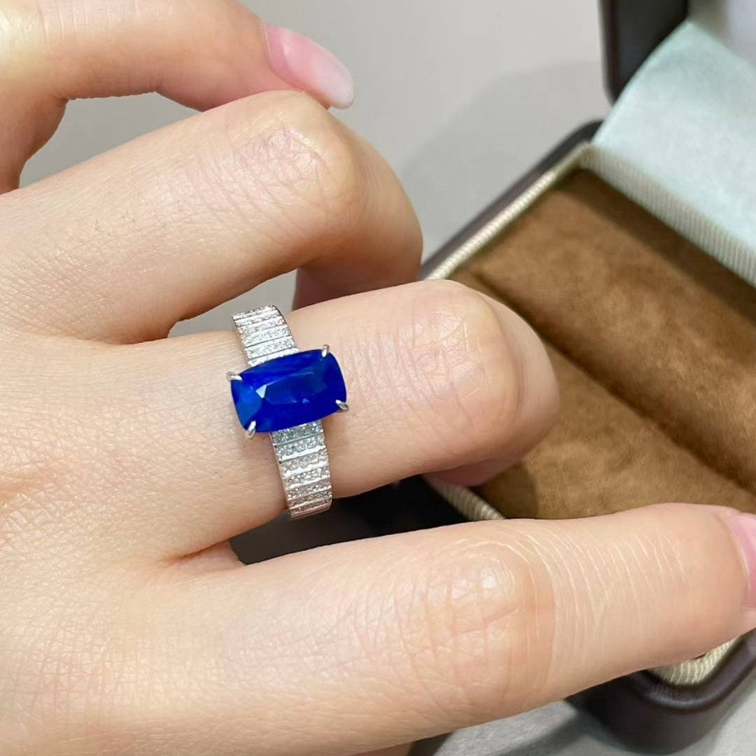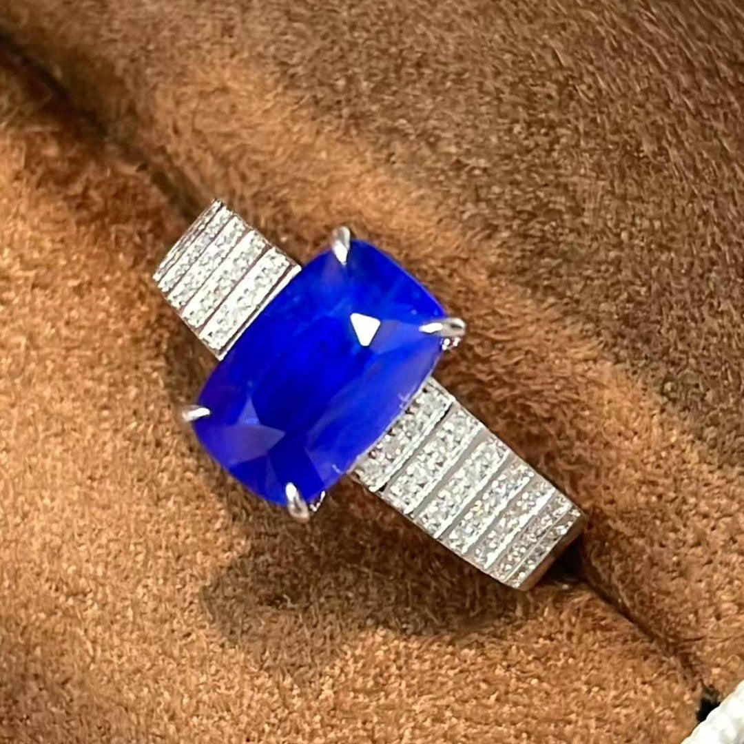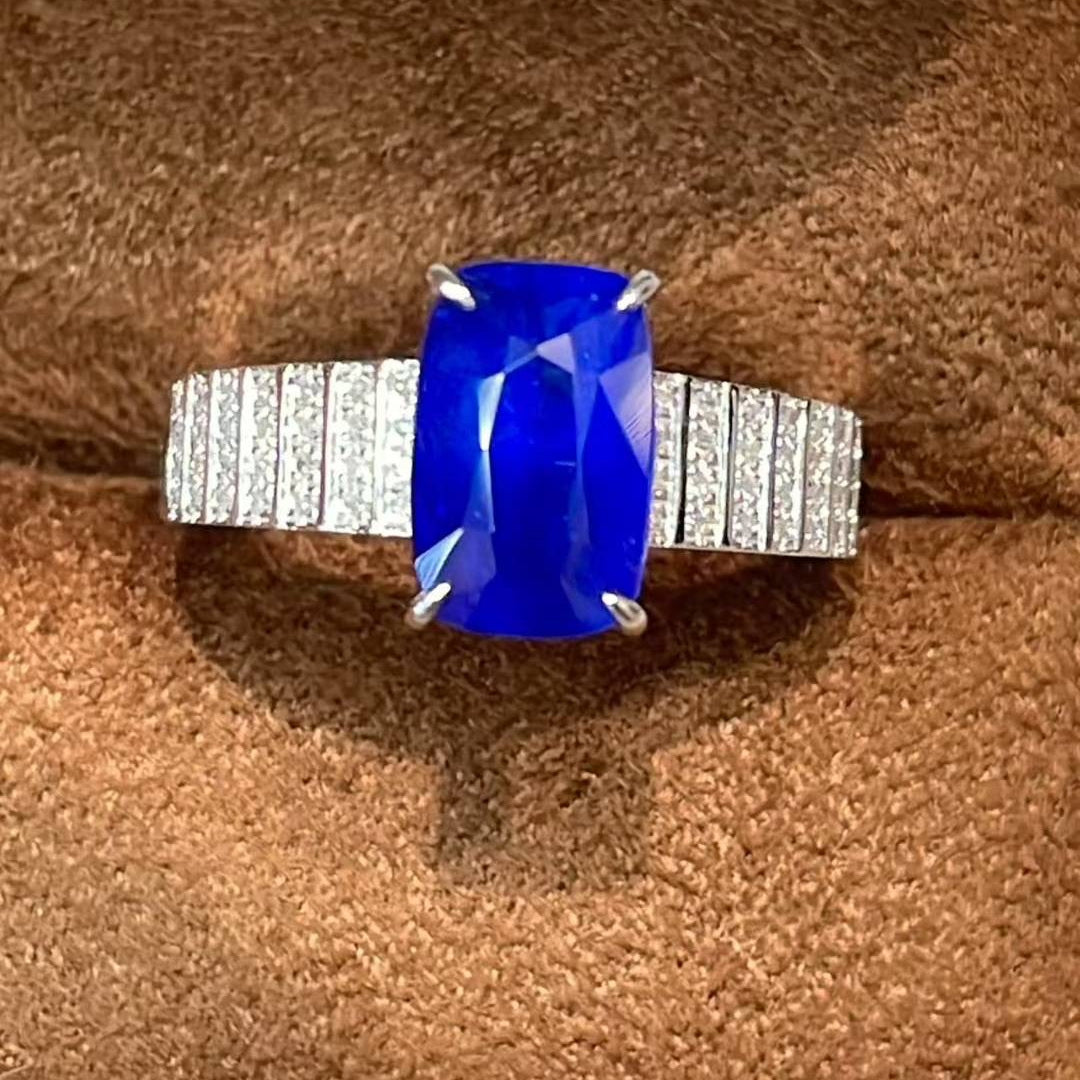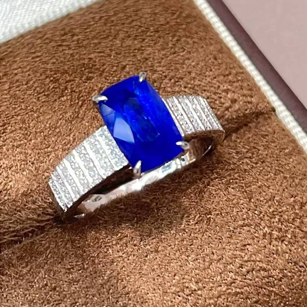Ref:231021208 // Gold Content:14K Gold // Ring Size:7.25US // // Main Gemstone:Sapphire // Shape:Cushion // Carat Weight:3ct // Color:Royal blue // Treatment:Natural // // Adjacent Gemstone 2 : Diamond // Shape:Round // Clarity Grade:VS-SI // Color:H // Treatment:Natural // Cut Grade:G //