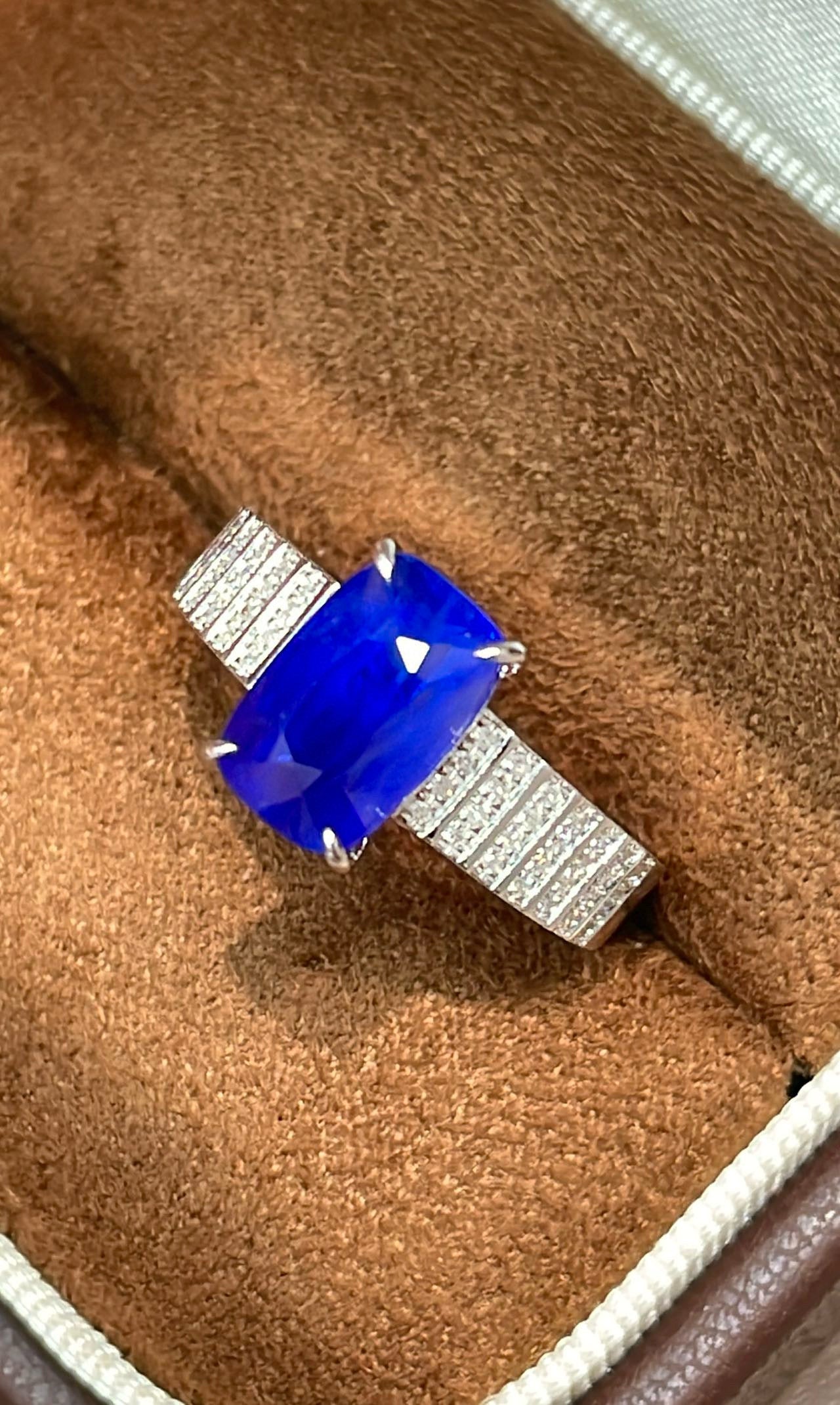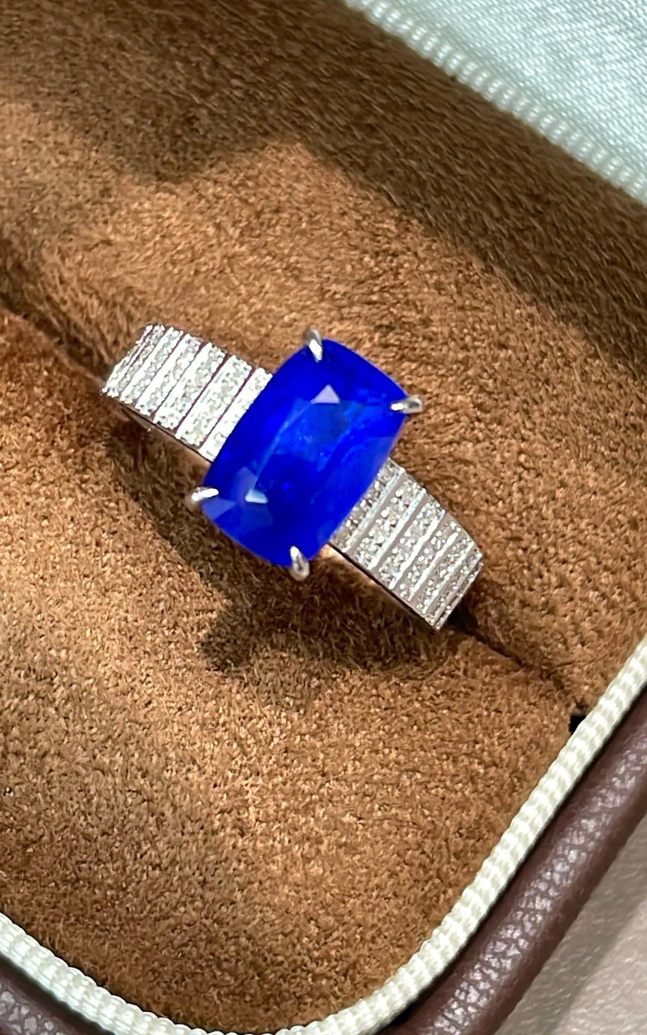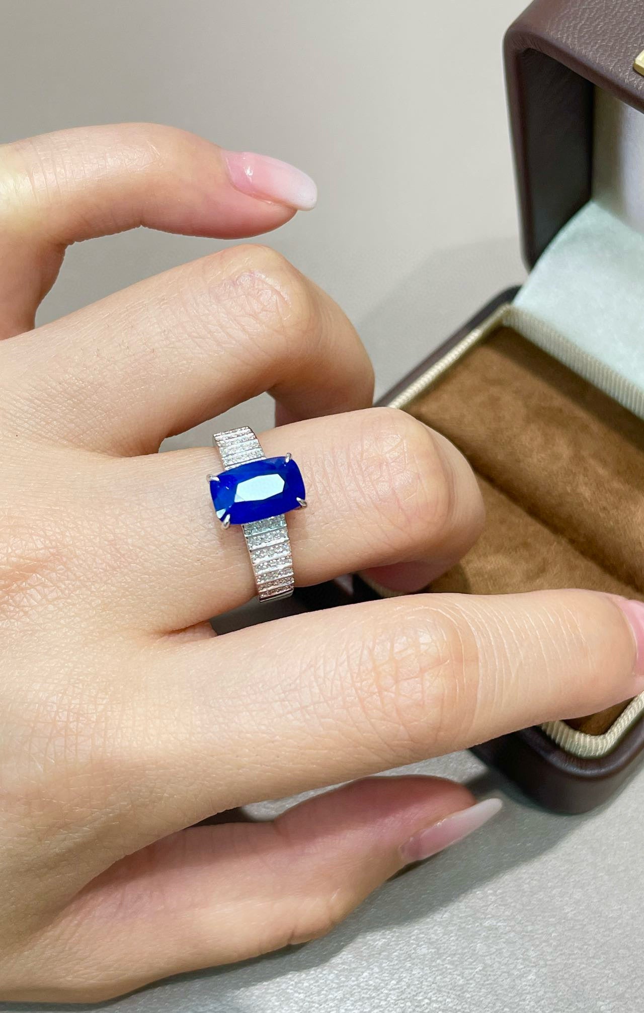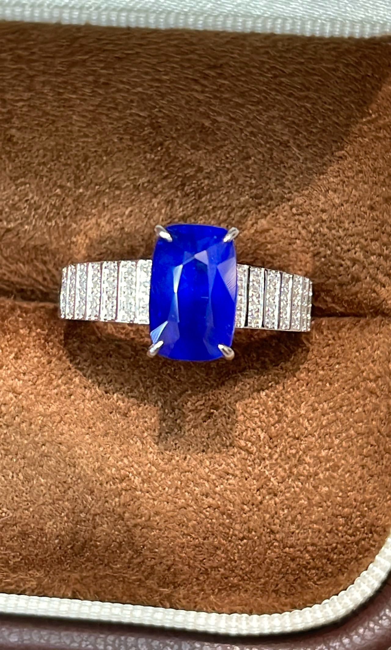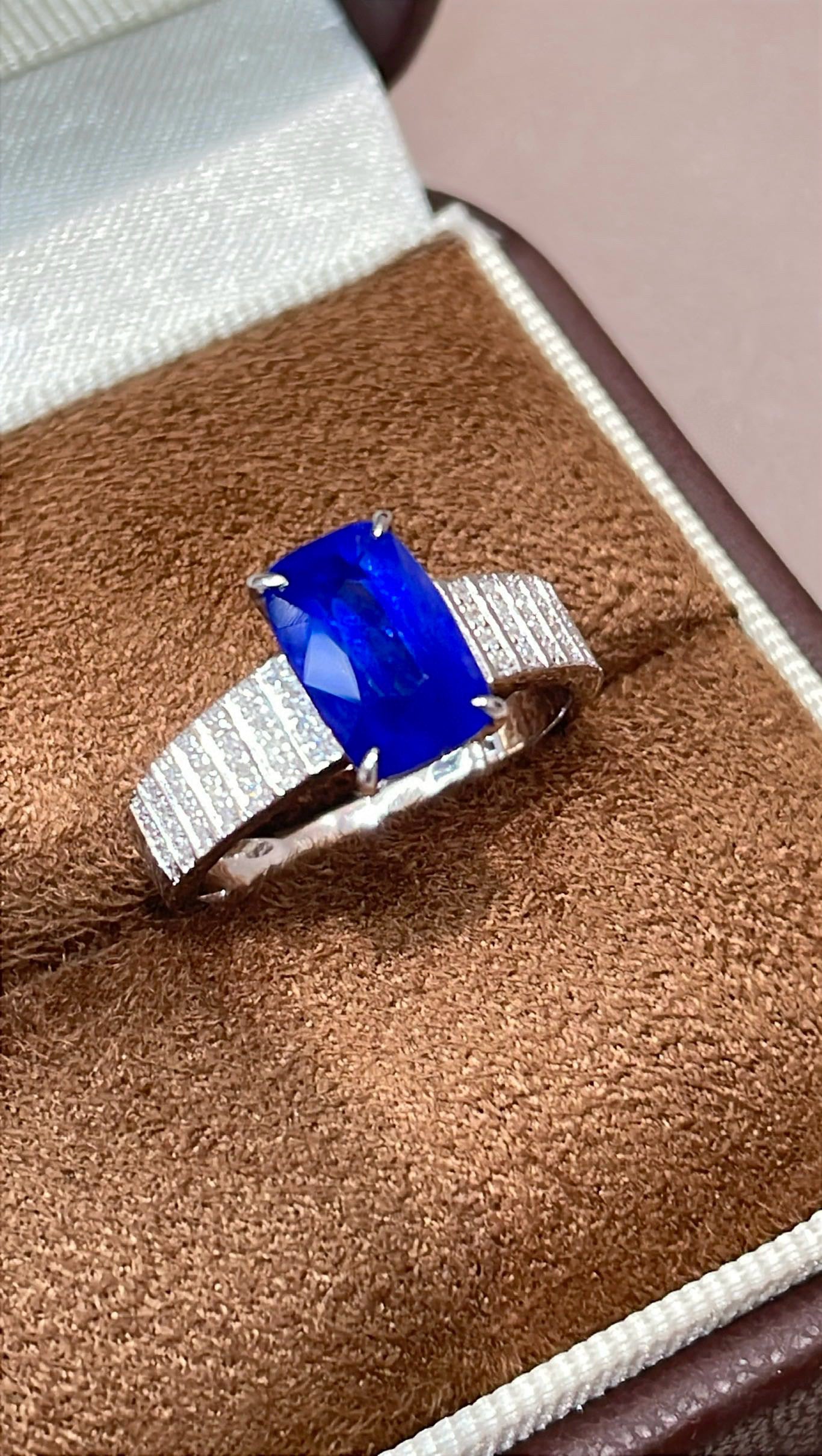Ref:231027234 // Gold Content:14K Gold // Ring Size:7.25US // // Main Gemstone:Sapphire // Shape:Cushion // Carat Weight:3ct // Color:Vivid Blue // Treatment:Natural // // Adjacent Gemstone 2 : Diamond // Shape:Round // Clarity Grade:VS-SI // Color:H // Treatment:Natural // Cut Grade:G //