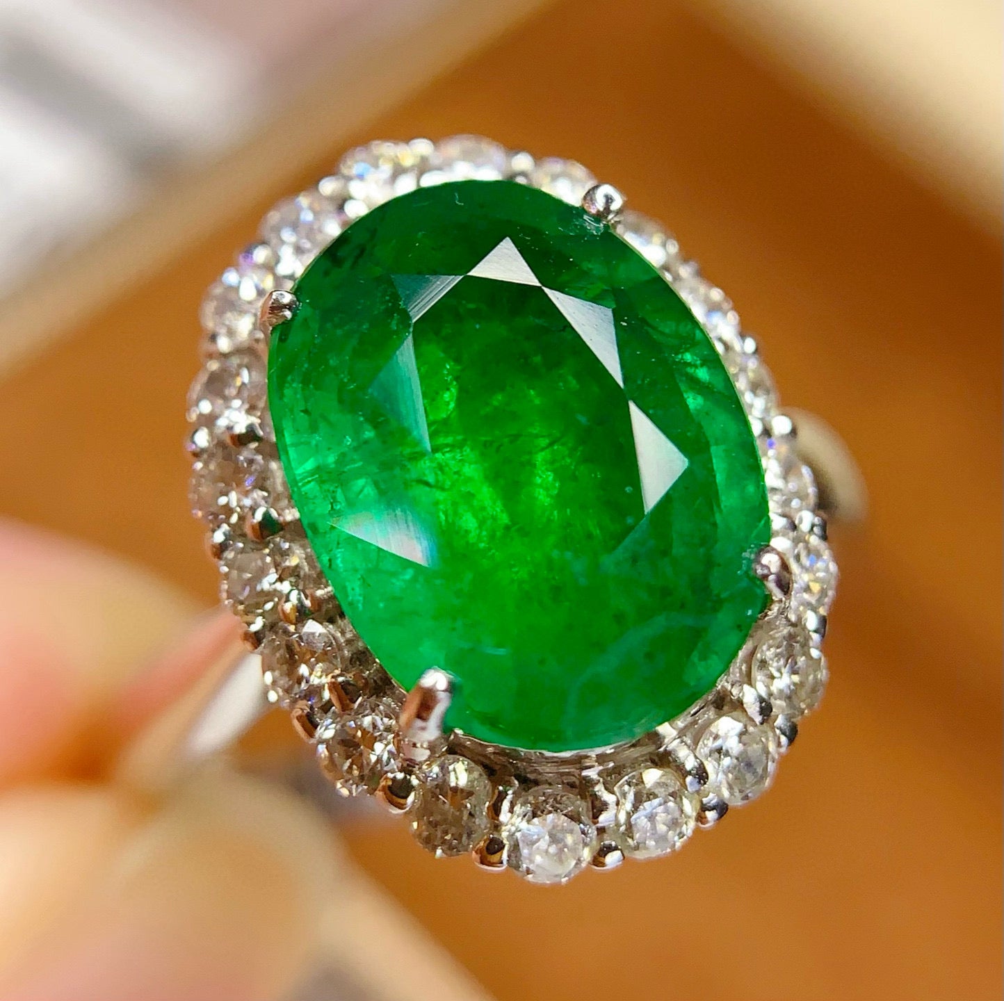 Ref:231025222 // Gold Content:14K Gold // Ring Size:7.25US // // Main Gemstone:Emerald // Shape:Oval // Carat Weight:4.51ct // Color:Vivid Green // Treatment:Natural // // Adjacent Gemstone 2 : Diamond // Number of stones:20 // Shape:Round // Clarity Grade:VS-SI // Color:H // Treatment:Natural // Cut Grade:G //