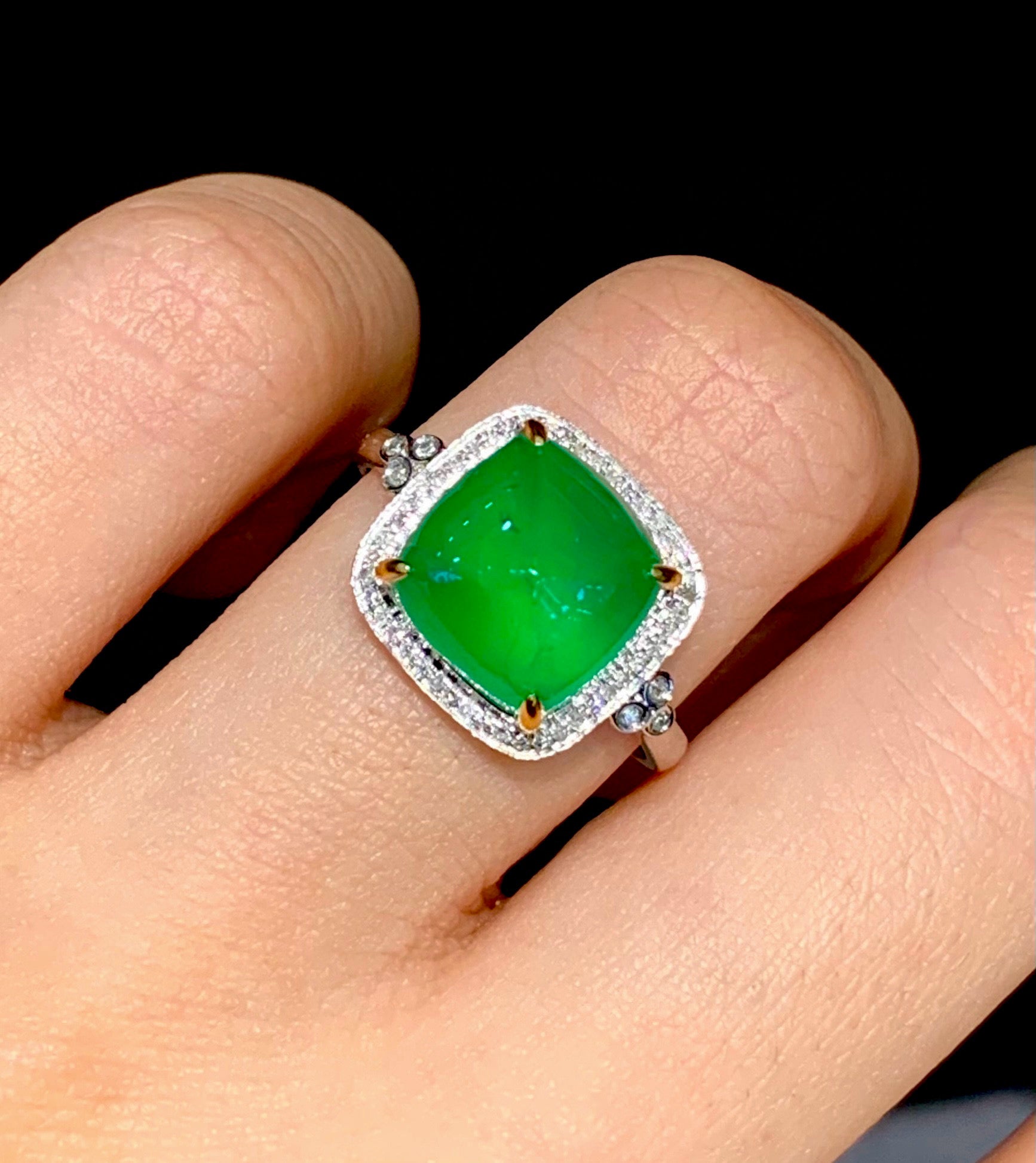 Ref:231027015 // Gold Content:14K Gold // Ring Size:7.25US // // Main Gemstone:Emerald // Shape:Suger-Loaf // Carat Weight:4.6ct // Color:Green // Treatment:Natural // // Adjacent Gemstone 2 : Diamond // Shape:Round // Clarity Grade:VS-SI // Color:H // Treatment:Natural // Cut Grade:G //