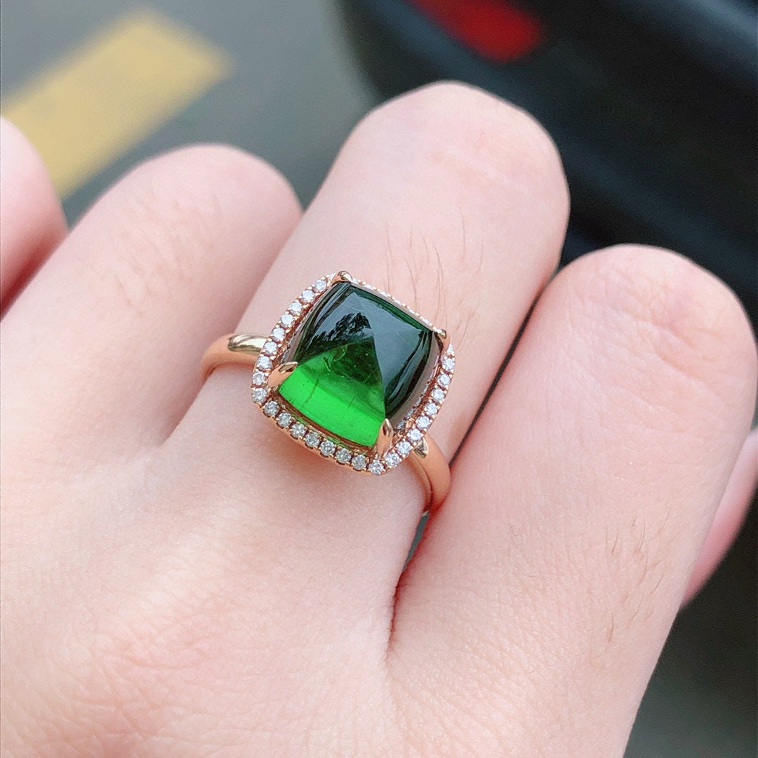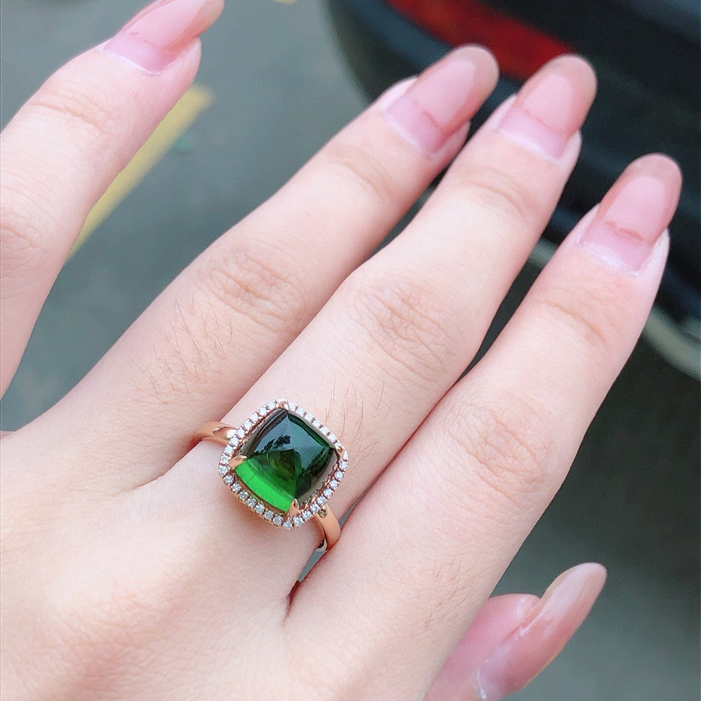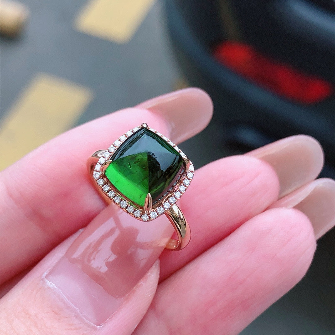 Ref:231023146 // Gold Content:14K Gold // Ring Size:7.25US // // Main Gemstone:Tourmaline // Shape:Suger-Loaf // Carat Weight:4.81ct // Color:Green // Treatment:Natural // // Adjacent Gemstone 2 : Diamond // Number of stones:34 // Shape:Round // Clarity Grade:VS-SI // Color:H // Treatment:Natural // Cut Grade:G //