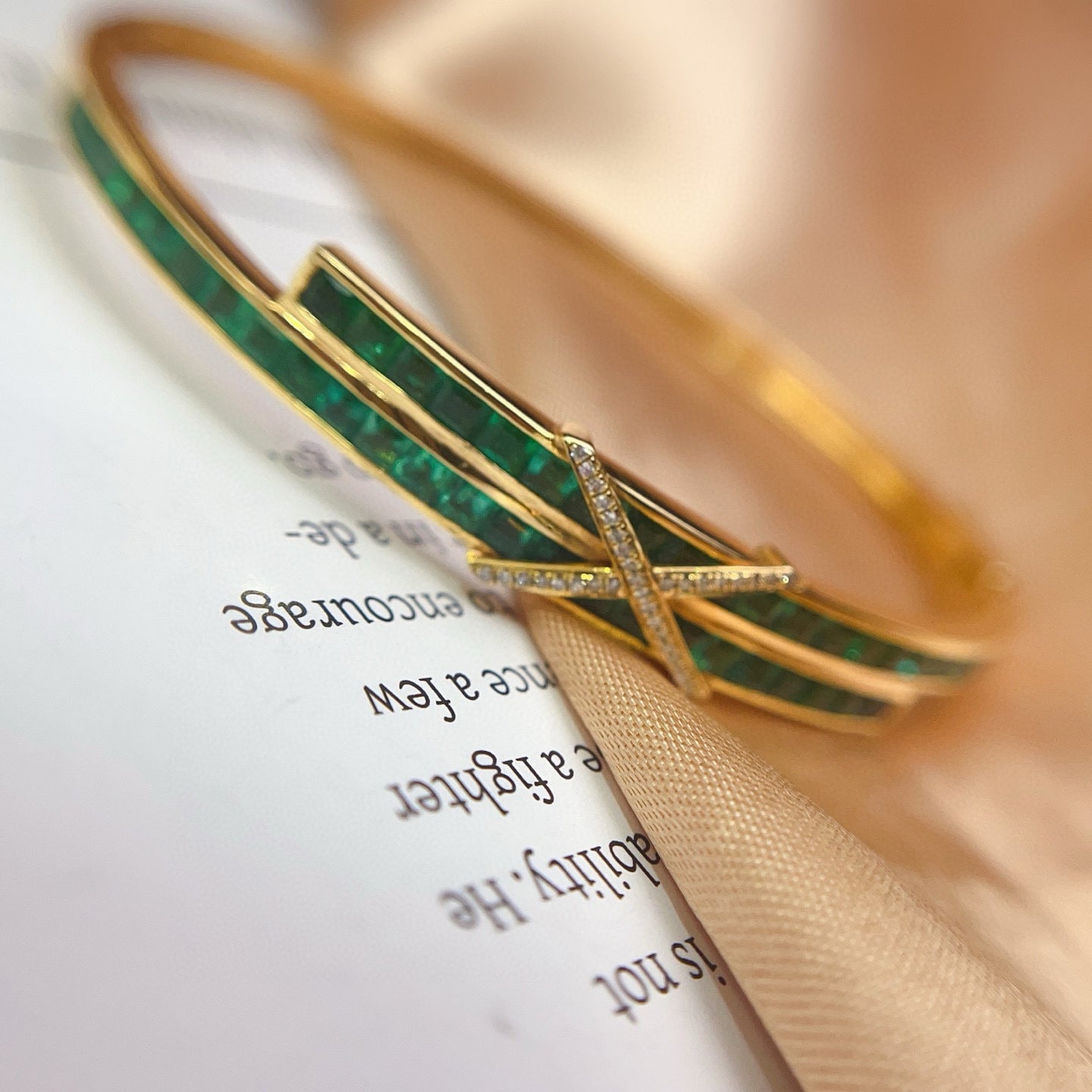 14K GOLD 5.06 CT NATURAL EMERALD & DIAMOND BANGLE