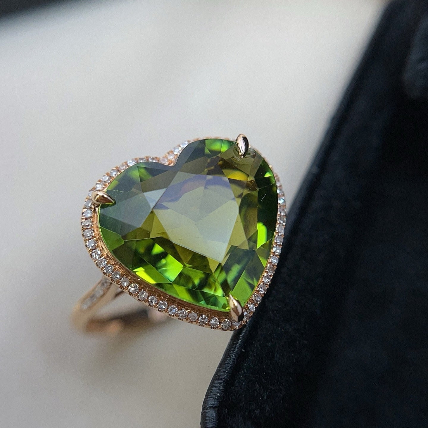 Ref:231021138 // Gold Content:14K Gold // Ring Size:7.25US // // Main Gemstone:Tourmaline // Shape:Heart // Carat Weight:5.20ct // Color:Green // Treatment:Natural // // Adjacent Gemstone 2 : Diamond // Number of stones:66 // Shape:Round // Clarity Grade:VS-SI // Color:H // Treatment:Natural // Cut Grade:G //