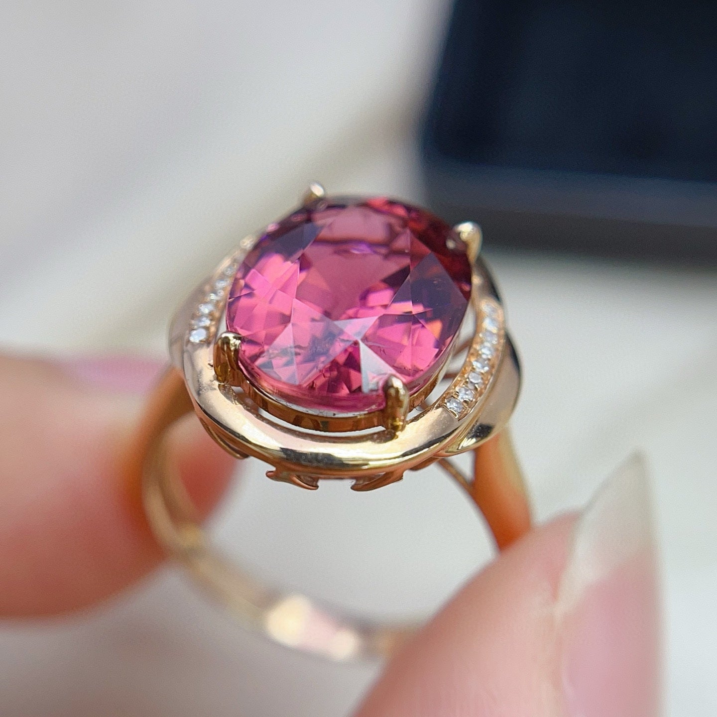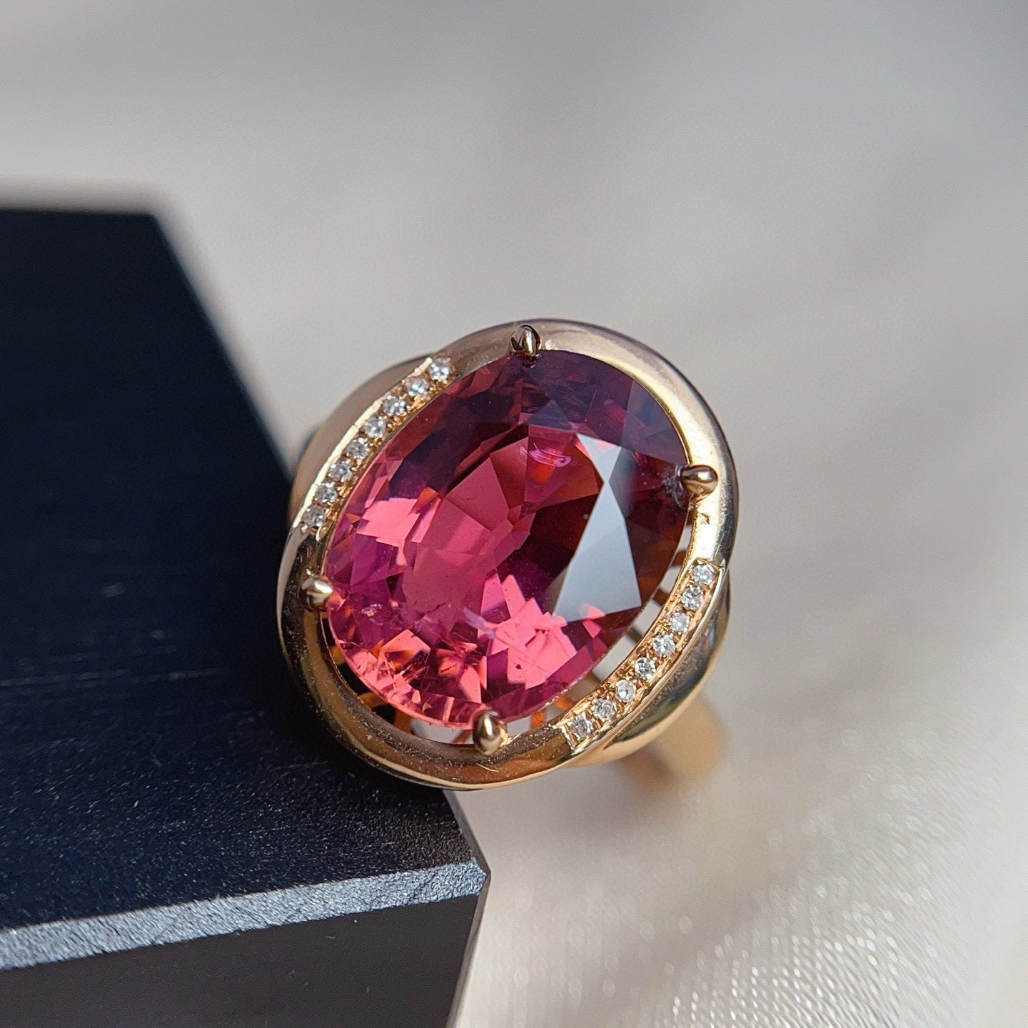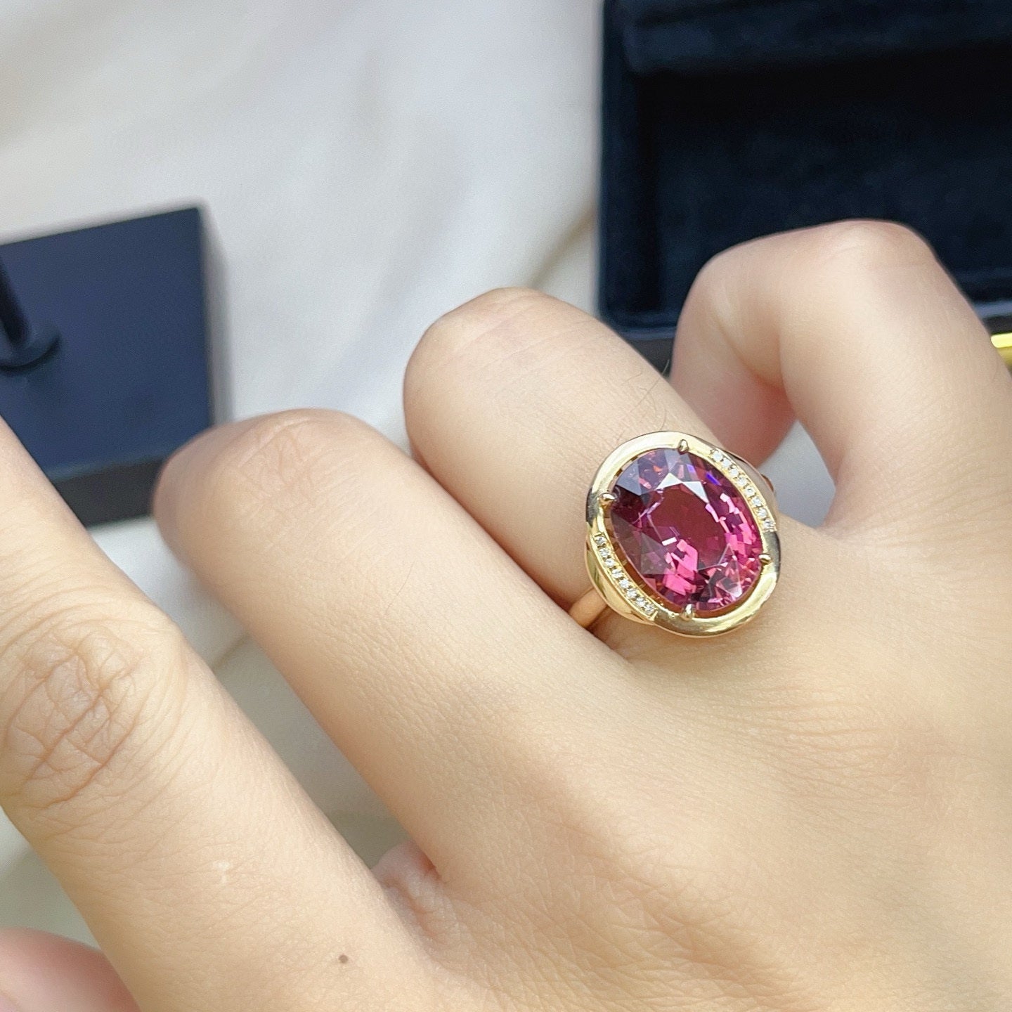Ref:231021197 // Gold Content:14K Gold // Ring Size:7.25US // // Main Gemstone:Tourmaline // Shape:Oval // Carat Weight:5.20ct // Color:Red // Treatment:Natural // // Adjacent Gemstone 2 : Diamond // Number of stones:16 // Shape:Round // Clarity Grade:VS-SI // Color:H // Treatment:Natural // Cut Grade:G //