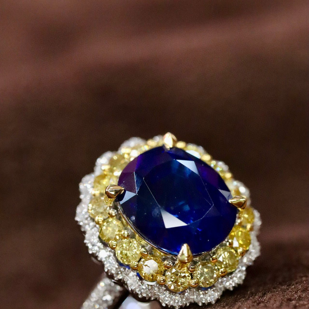 Ref:231023132 // Gold Content:14K Gold // Ring Size:7.25US // // Main Gemstone:Sapphire // Shape:Oval // Carat Weight:4.27ct // Color:Blue // Treatment:Natural // // Adjacent Gemstone 2 : Yellow Diamond & Diamond // Shape:Round // Carat Weight:0.93ct // Clarity Grade:VS-SI // Color:Yellow & H // Treatment:Natural // Cut Grade:G //