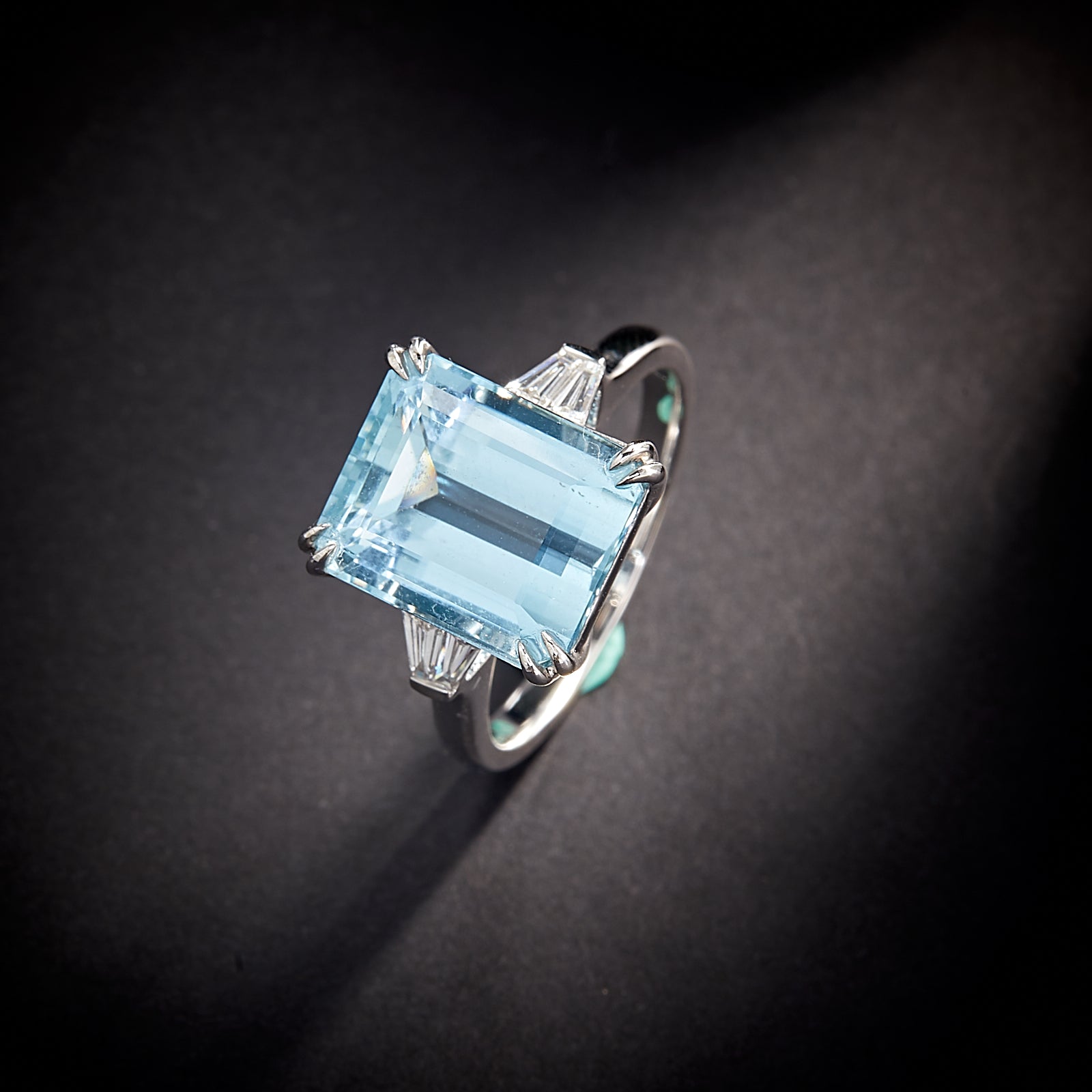 Ref:231027054 // Gold Content:14K Gold // Ring Size:7.25US // // Main Gemstone:Aquamarine // Shape:Octagonal // Carat Weight:5.18ct // Color:Blue // Treatment:Natural // // Adjacent Gemstone 2 : Diamond // Shape:Baguette // Carat Weight:0.16ct // Clarity Grade:VS-SI // Color:H // Treatment:Natural //