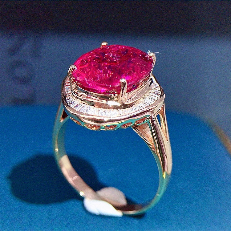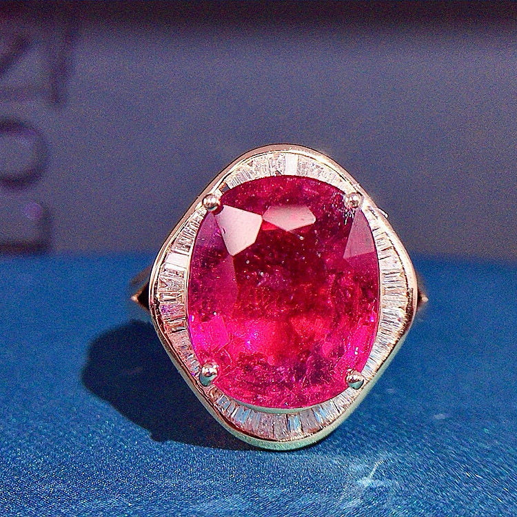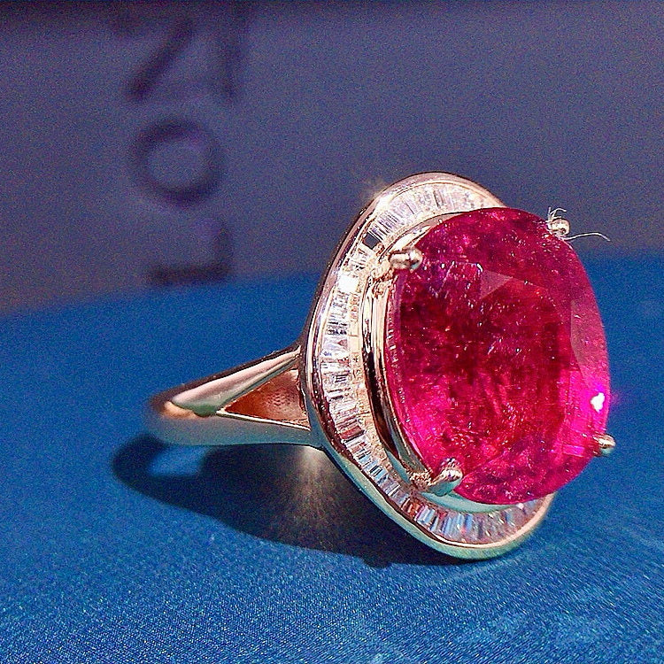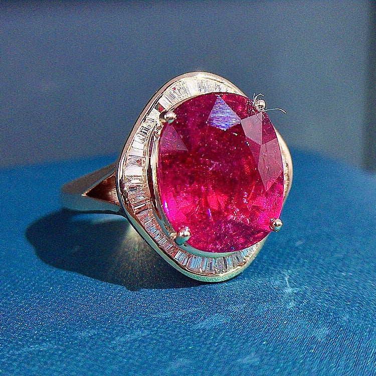 Ref:231021145 // Gold Content:14K Gold // Ring Size:7.25US // // Main Gemstone:Tourmaline // Shape:Oval // Carat Weight:5.55ct // Color:Red // Treatment:Natural // // Adjacent Gemstone 2 : Diamond // Number of stones:60 // Shape:Baguette // Clarity Grade:VS-SI // Color:H // Treatment:Natural //
