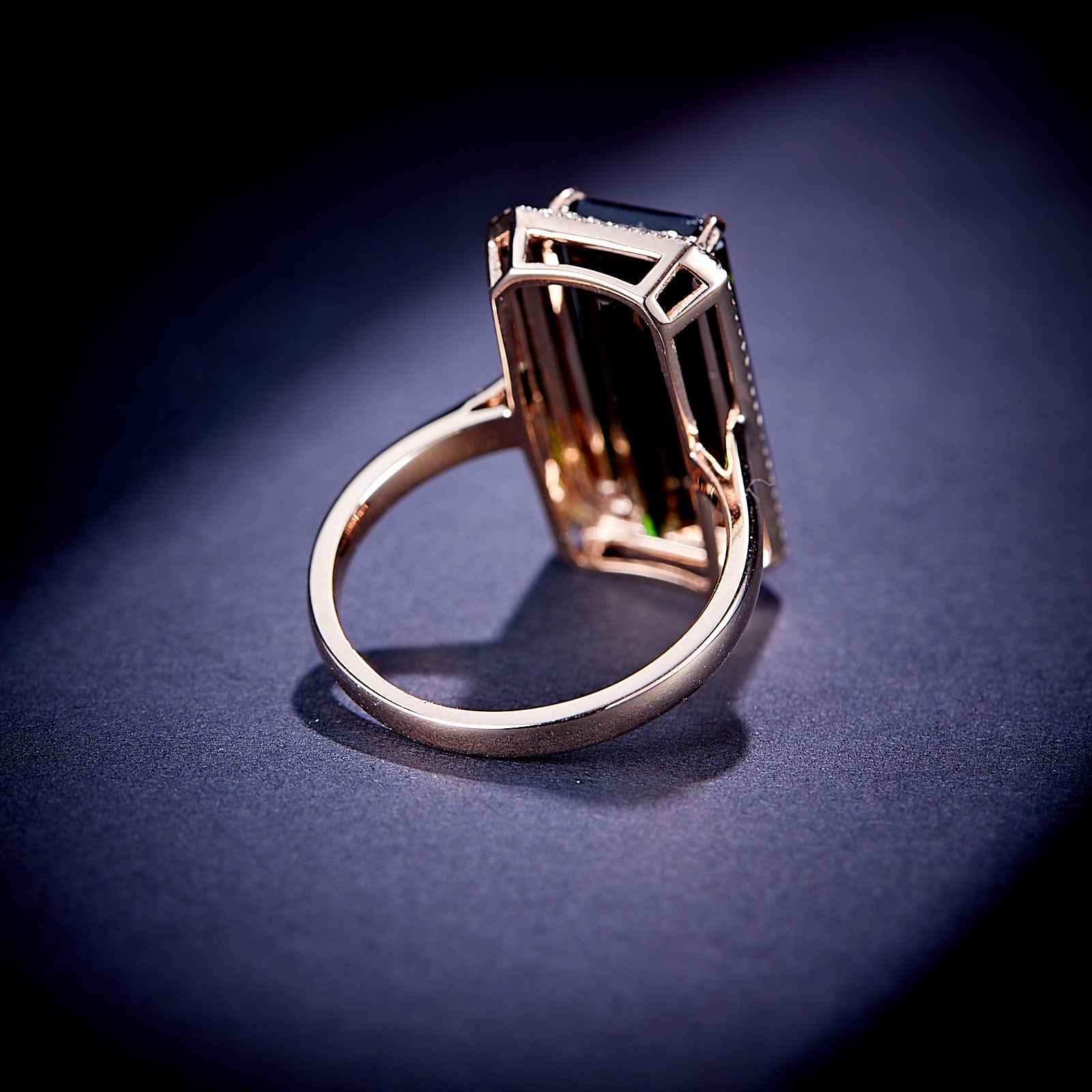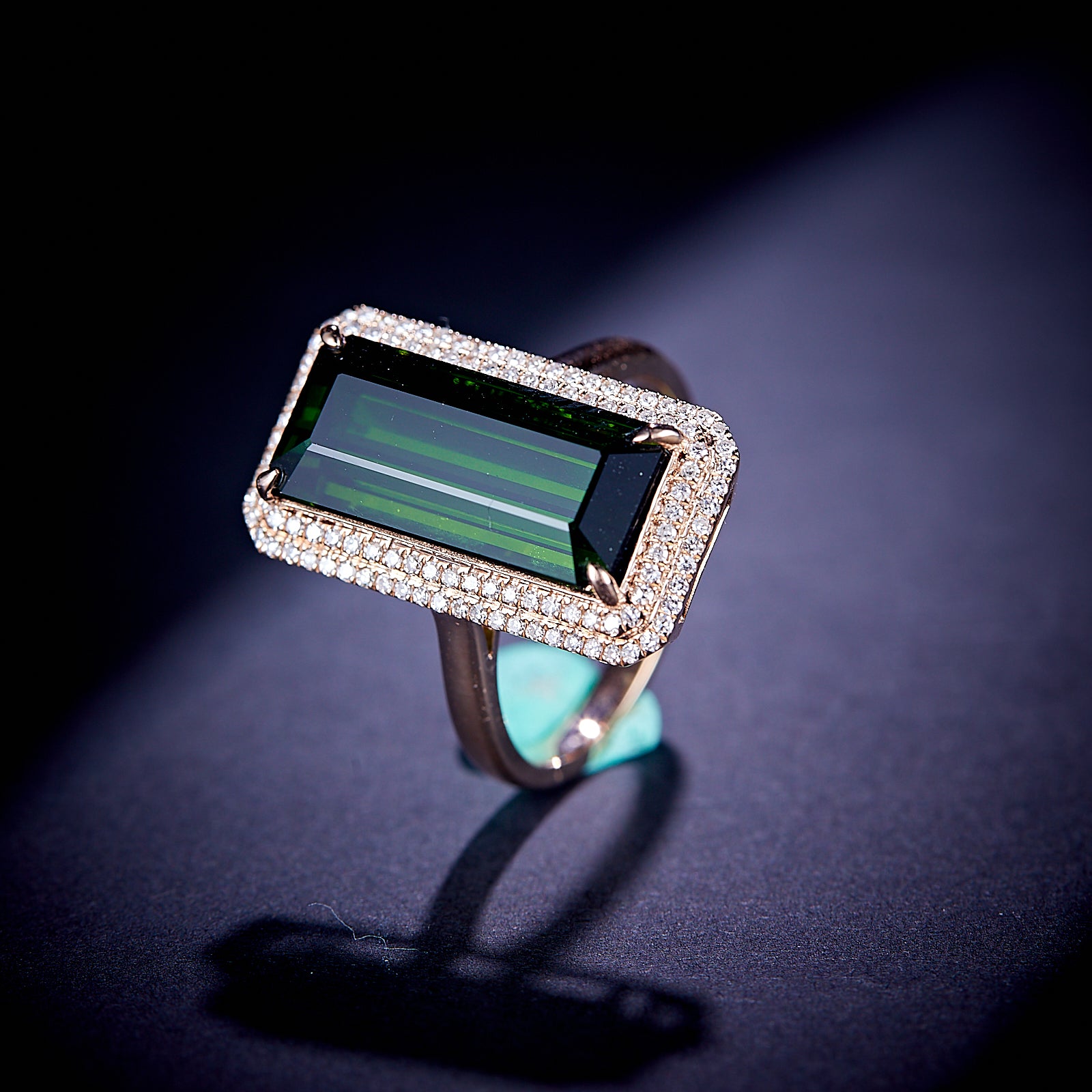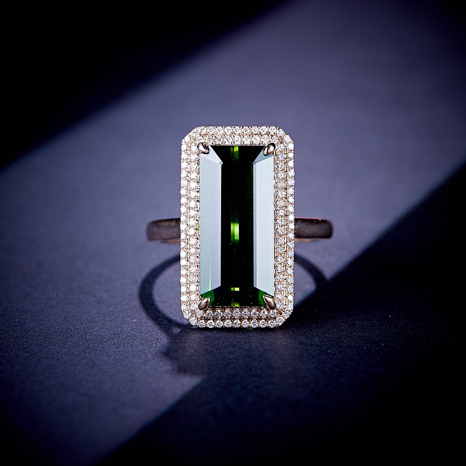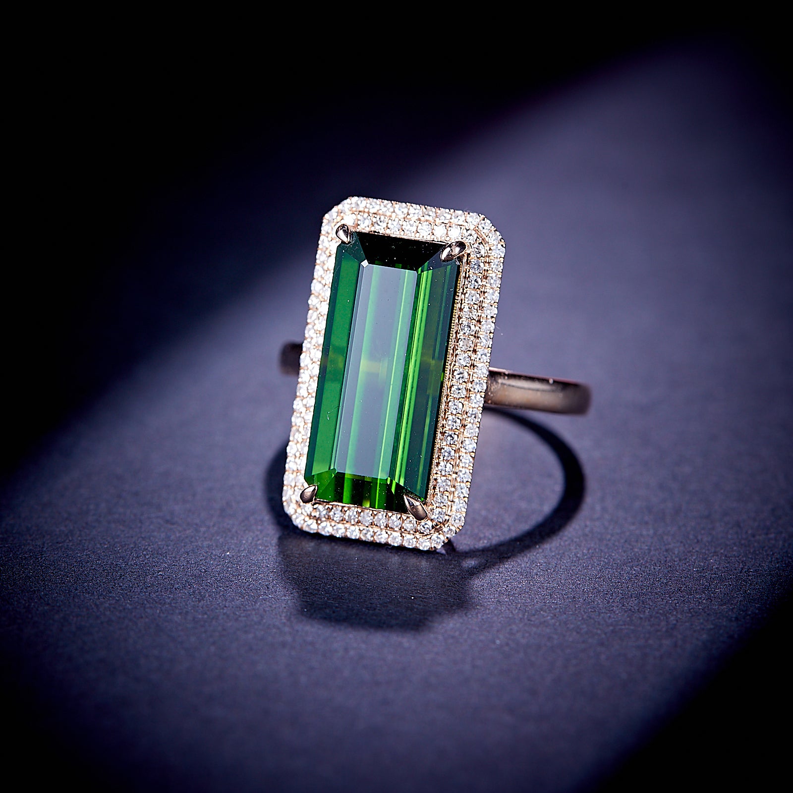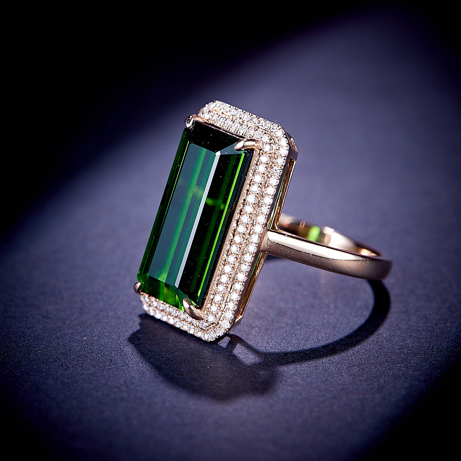 Ref:231027055 // Gold Content:14K Gold // Ring Size:7.25US // // Main Gemstone:Tourmaline // Shape:Octagonal // Carat Weight:5.96ct // Color:Green // Treatment:Natural // // Adjacent Gemstone 2 : Diamond // Shape:Round // Clarity Grade:VS-SI // Color:H // Treatment:Natural // Cut Grade:G //