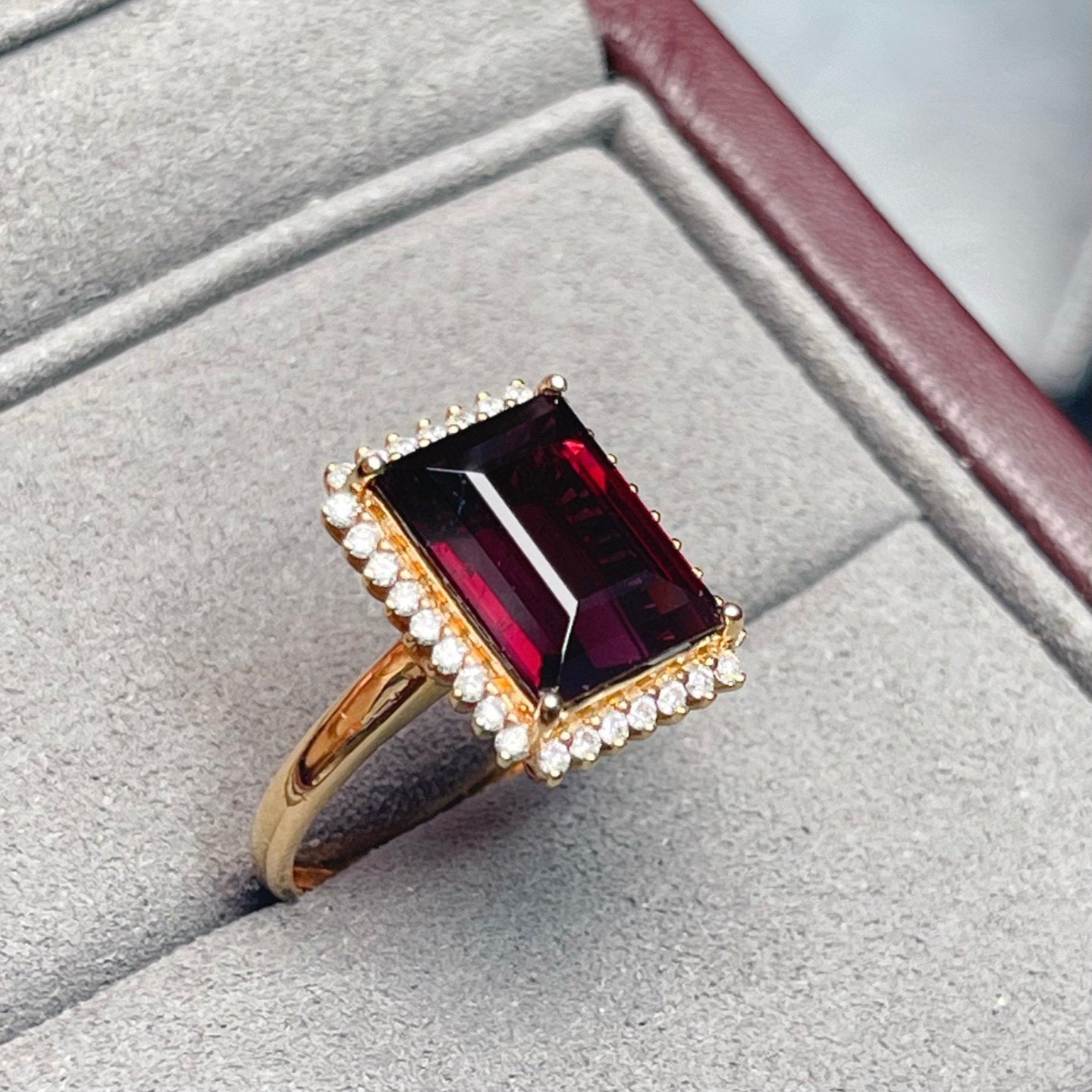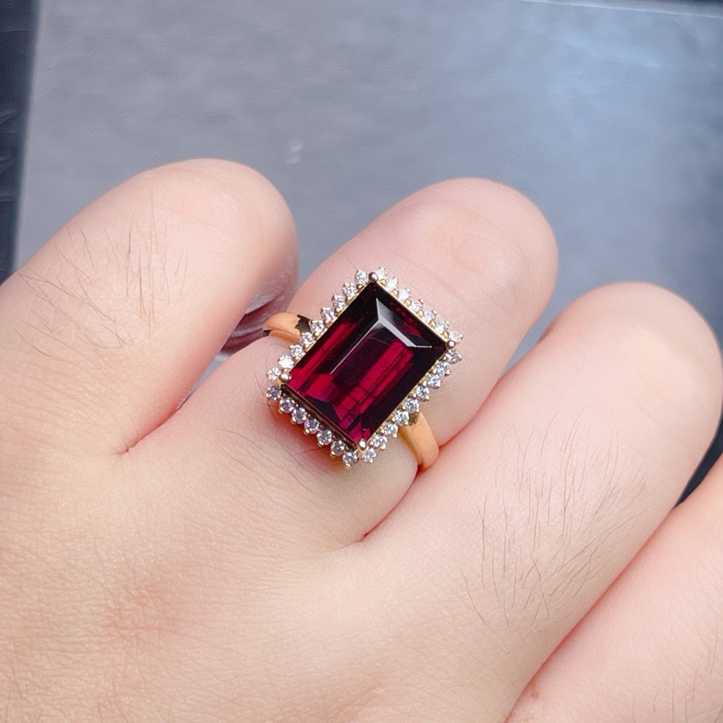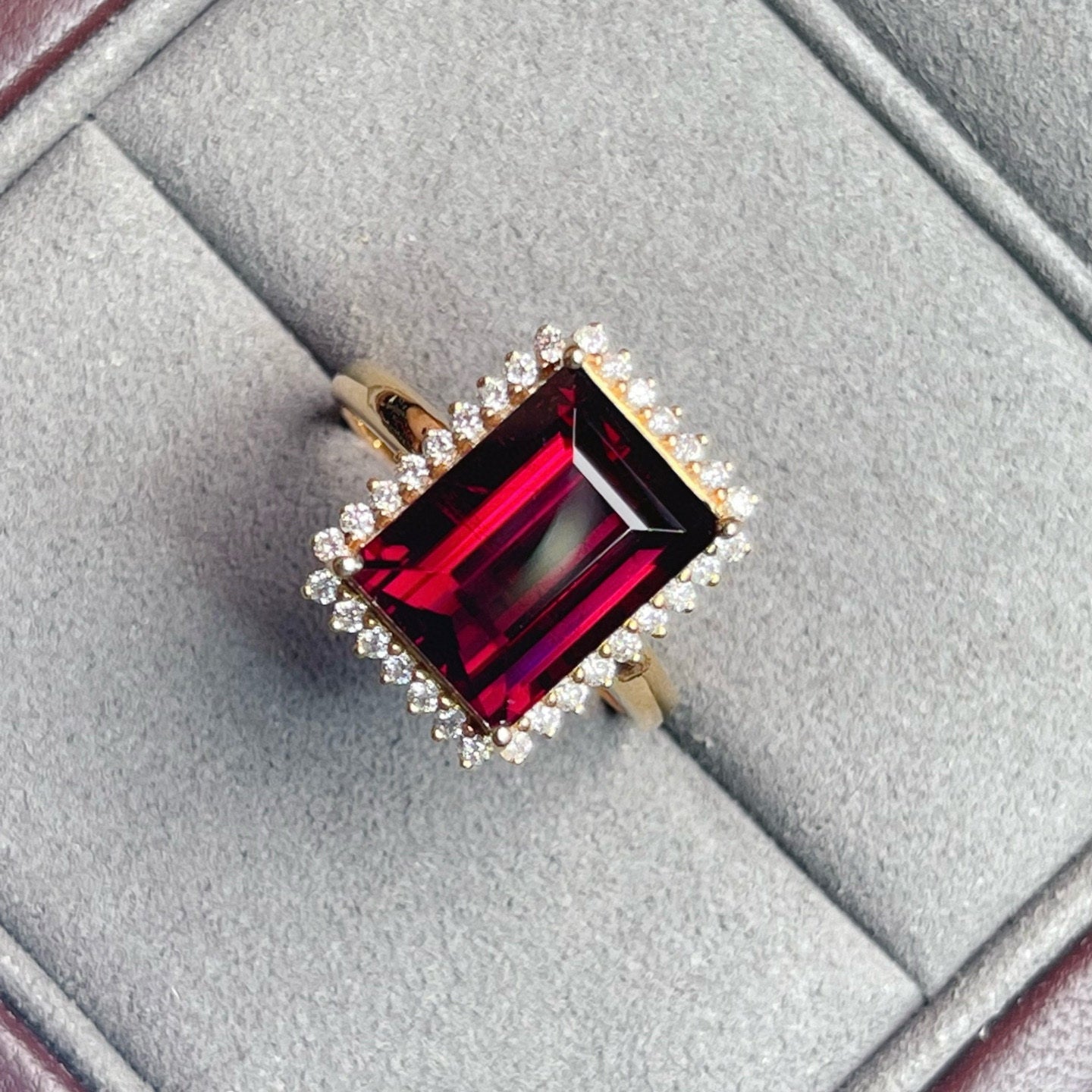 Ref:231021111 // Gold Content:14K Gold // Ring Size:7.25US // // Main Gemstone:Tourmaline // Shape:Rectangle // Carat Weight:5.75ct // Color:Red // Treatment:Natural // // Adjacent Gemstone 2 : Diamond // Number of stones:32 // Shape:Round // Carat Weight:0.32ct // Clarity Grade:VS-SI // Color:H // Treatment:Natural // Cut Grade:G //