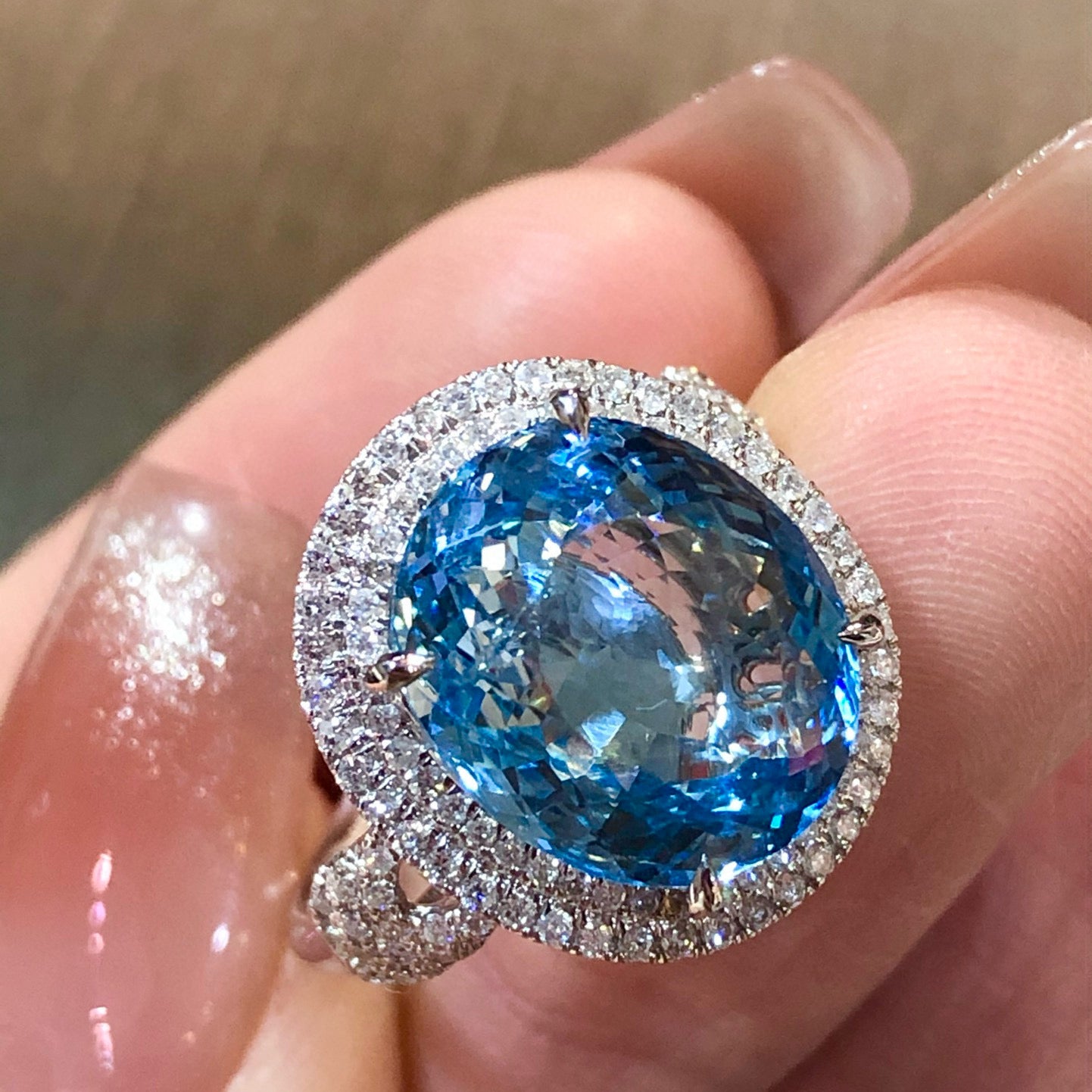 Ref:231027245 // Gold Content:14K Gold // Ring Size:7.25US // // Main Gemstone:Aquamarine // Shape:Oval // Carat Weight:6.3ct // Color:Blue // Treatment:Natural // // Adjacent Gemstone 2 : Diamond // Shape:Round // Clarity Grade:VS-SI // Color:H // Treatment:Natural // Cut Grade:G //