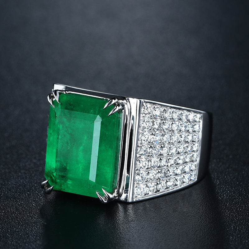 Ref:231021009 // Gold Content:14K Gold // Ring Size:7.25US // // Main Gemstone:Emerald // Shape:Octagonal // Carat Weight:7.49ct // Color:Vivid Green // Treatment:Natural // // Adjacent Gemstone 2 : Diamond // Shape:Round // Clarity Grade:VS-SI // Color:H // Treatment:Natural // Cut Grade:G //