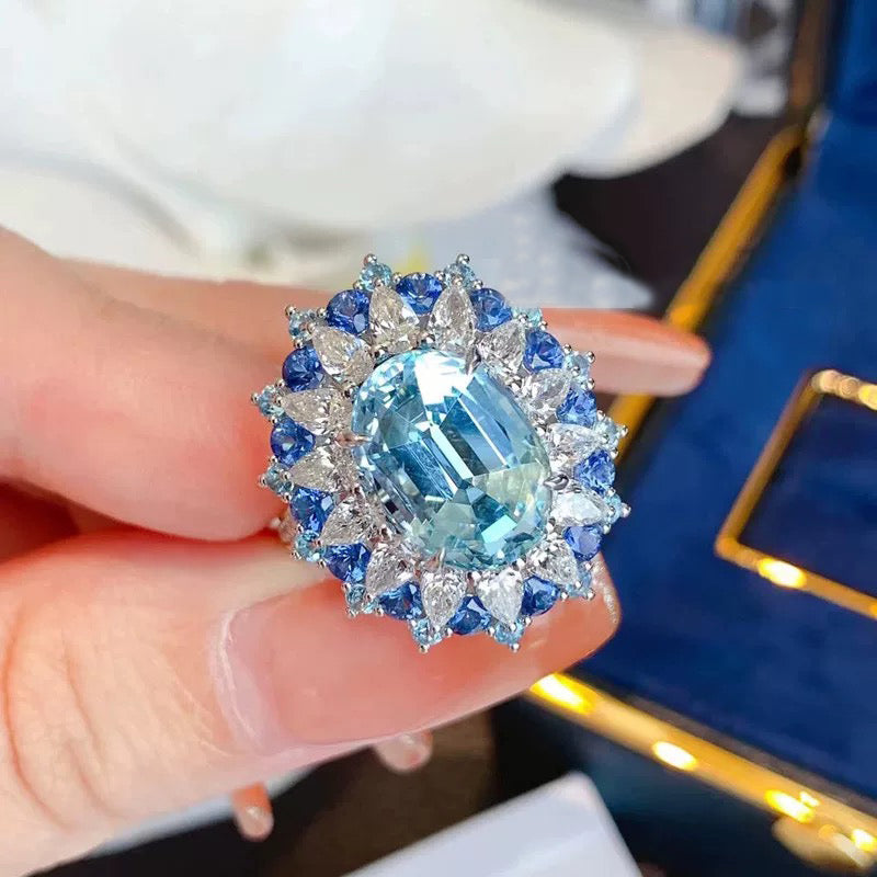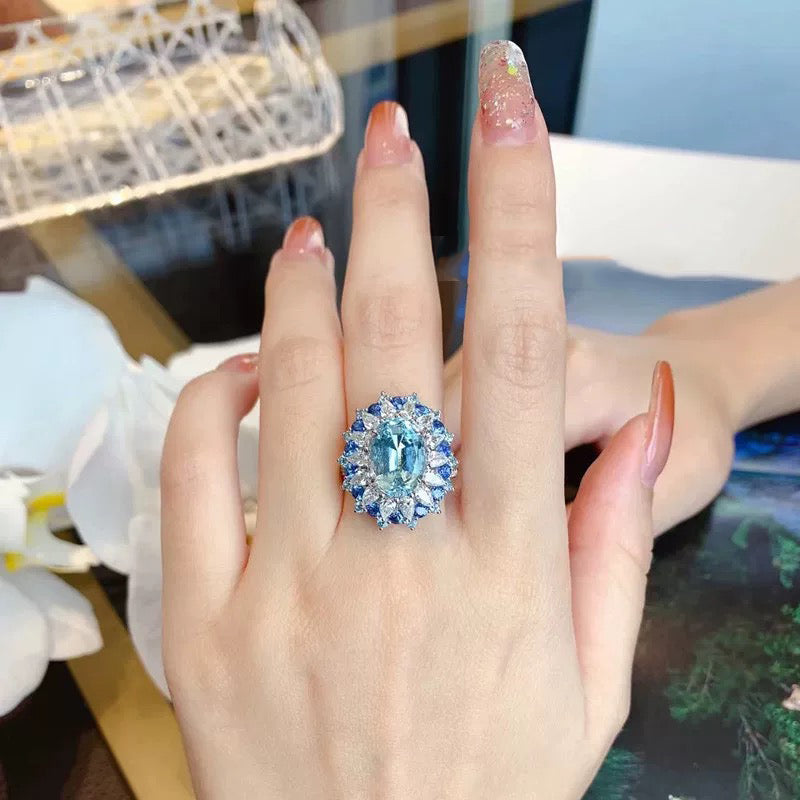 Ref:231025021 // Gold Content:14K Gold // Ring Size:7.25US // // Main Gemstone:Aquamarine // Shape:Oval // Carat Weight:4.45ct // Color:Blue // Treatment:Natural // // Adjacent Gemstone 2 : Diamond // Shape:Pear // Carat Weight:3.19ct // Clarity Grade:VS-SI // Color:H // Treatment:Natural //
