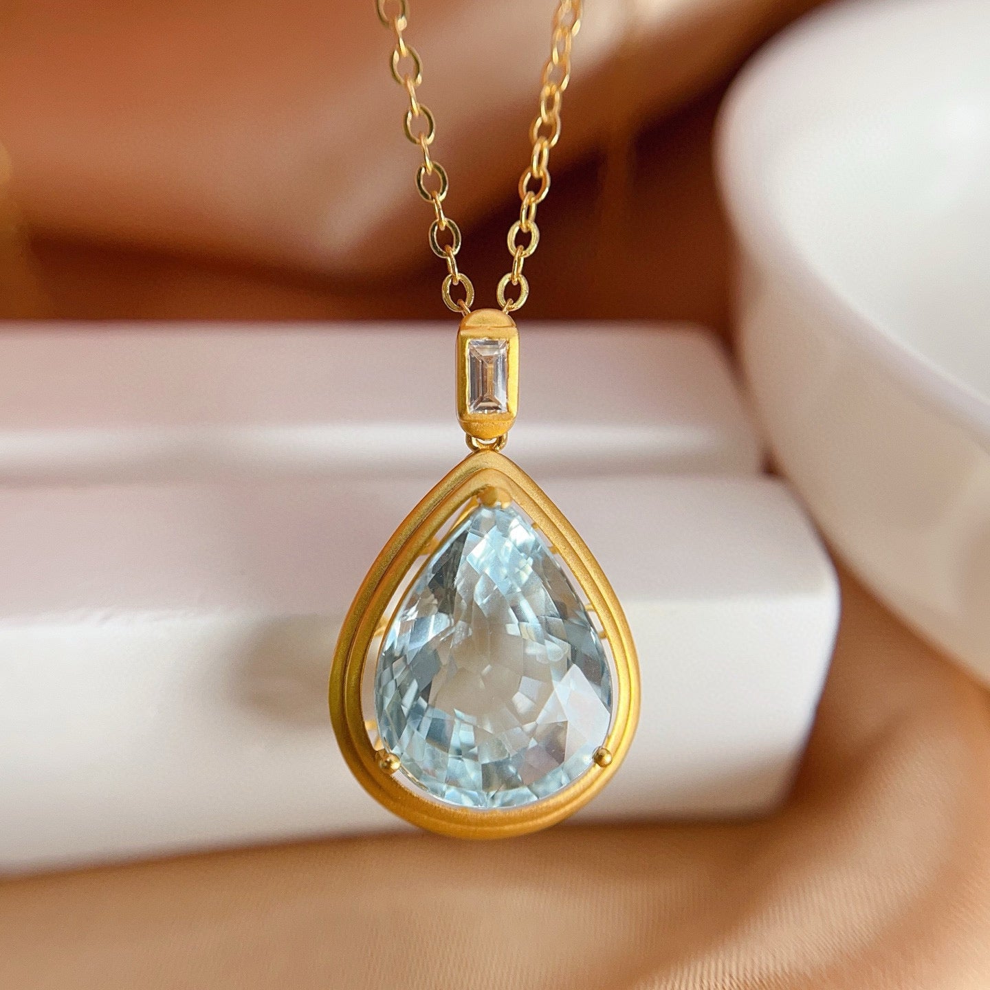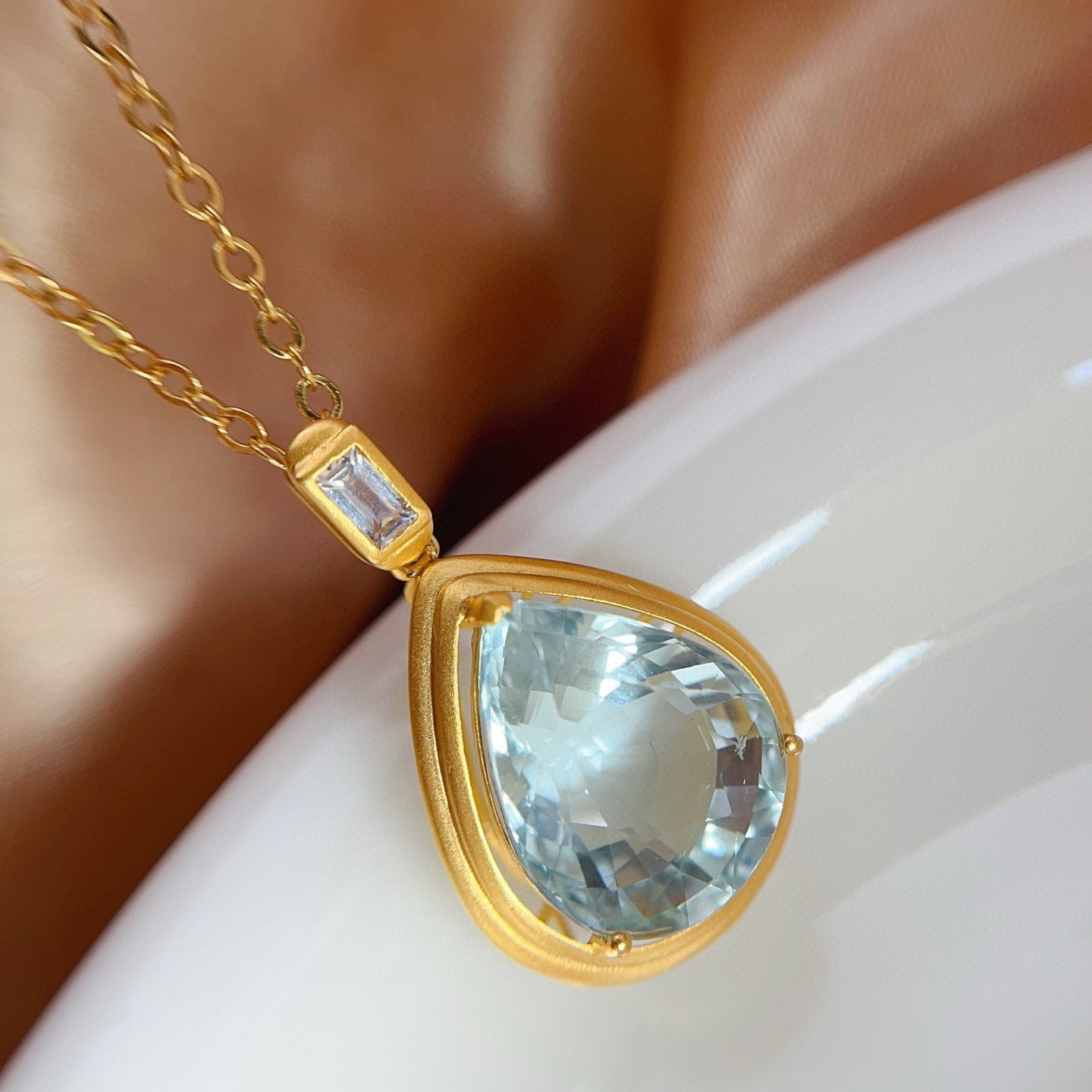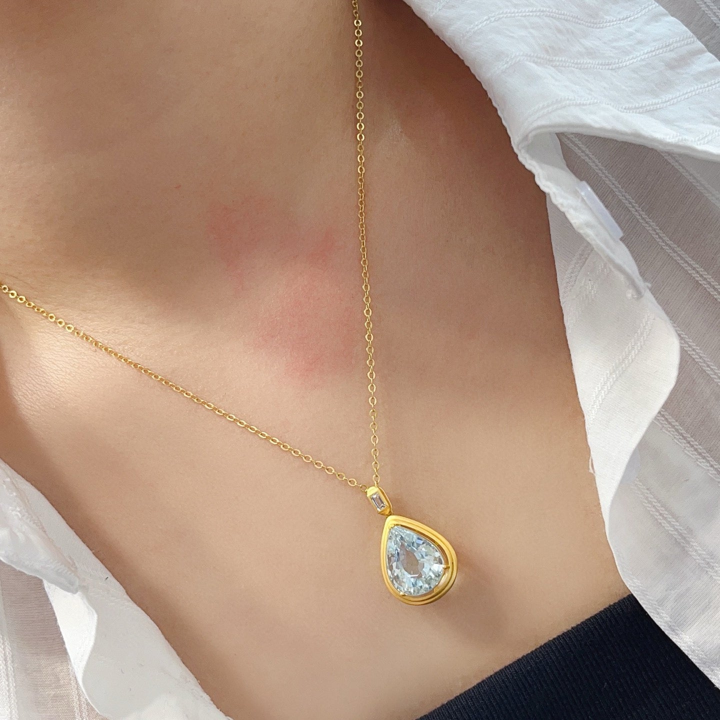 Ref:231027179 // Gold Content:14K Gold // Main Gemstone:Aquamarine // Shape:Pear // Carat Weight:8.10ct // Color:Blue // Treatment:Natural // // Adjacent Gemstone 2 : Sapphire // Number of stones:1 // Shape:Baguette // Color:White // Treatment:Natural //